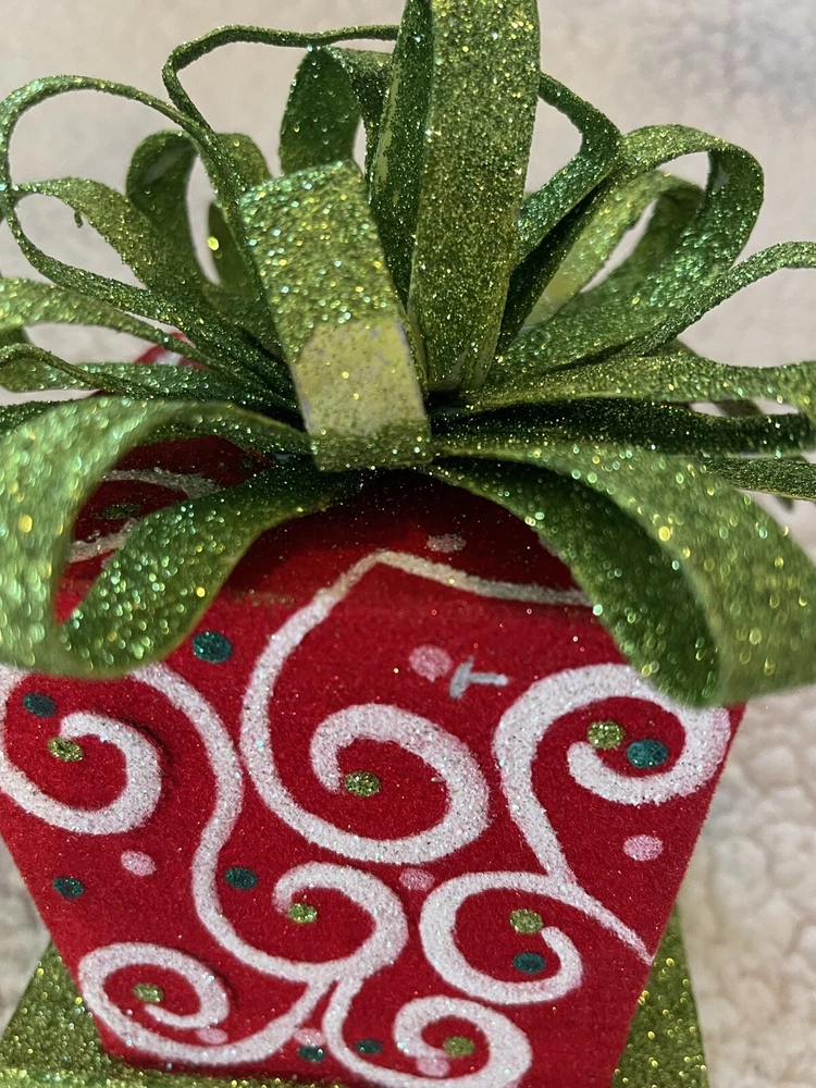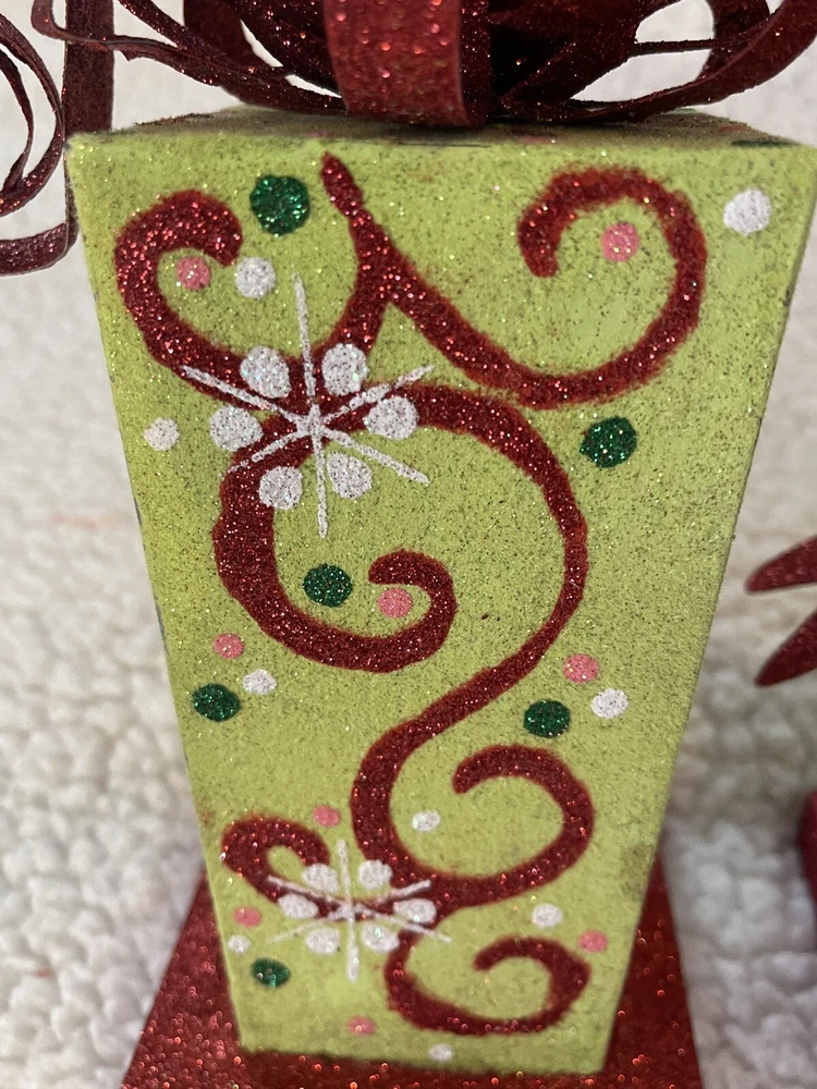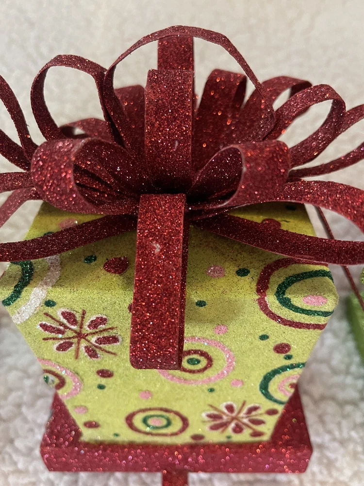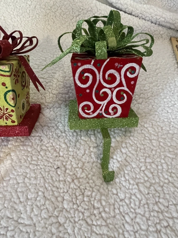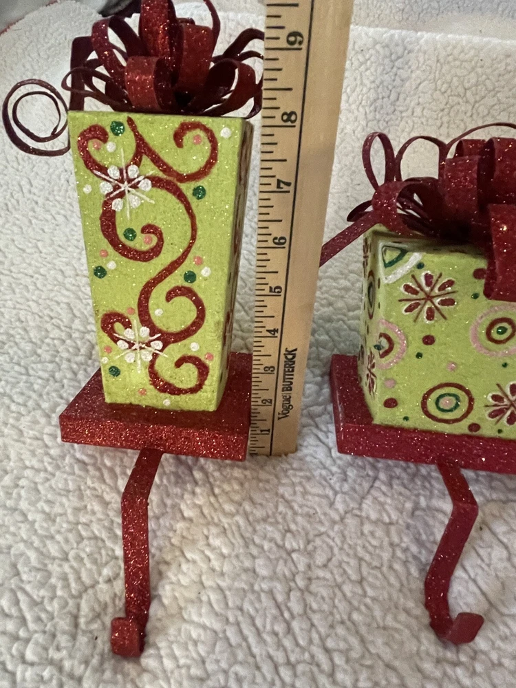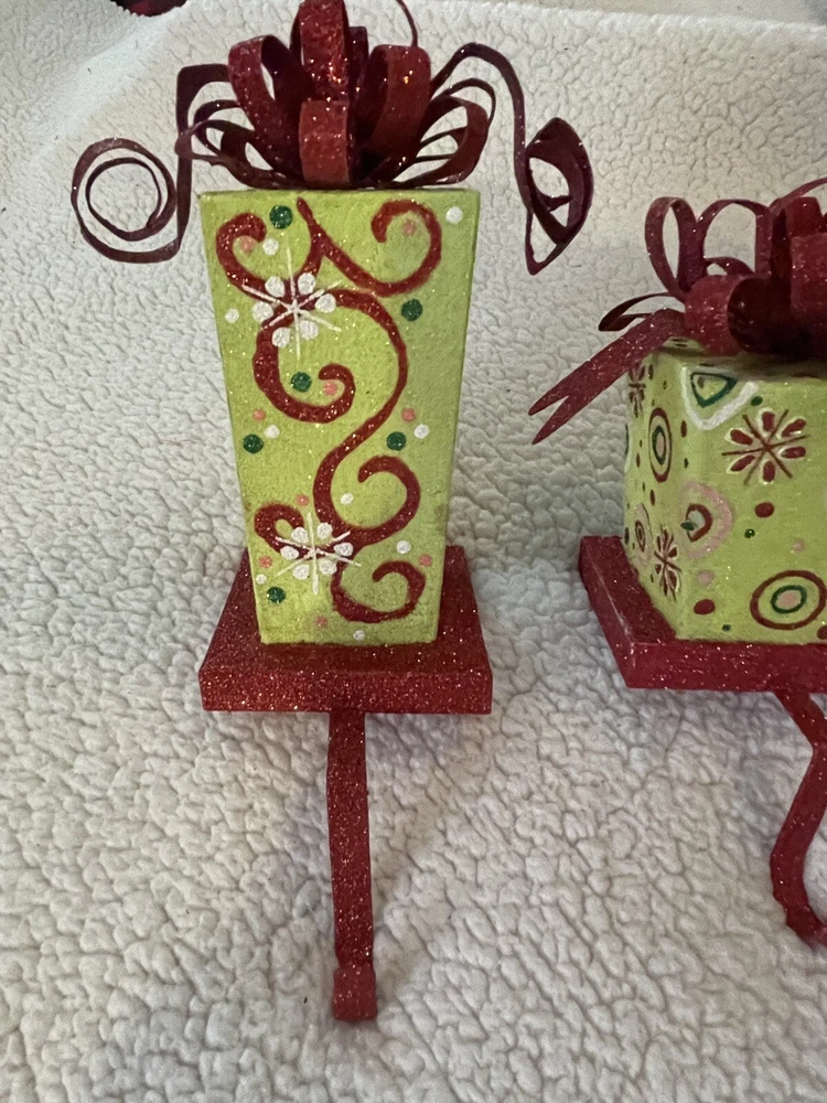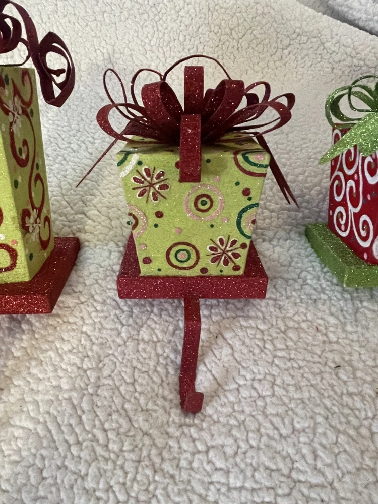 3 Green And Red Metal & Glitter Christmas Present Box/Ribbon-Stocking Holder