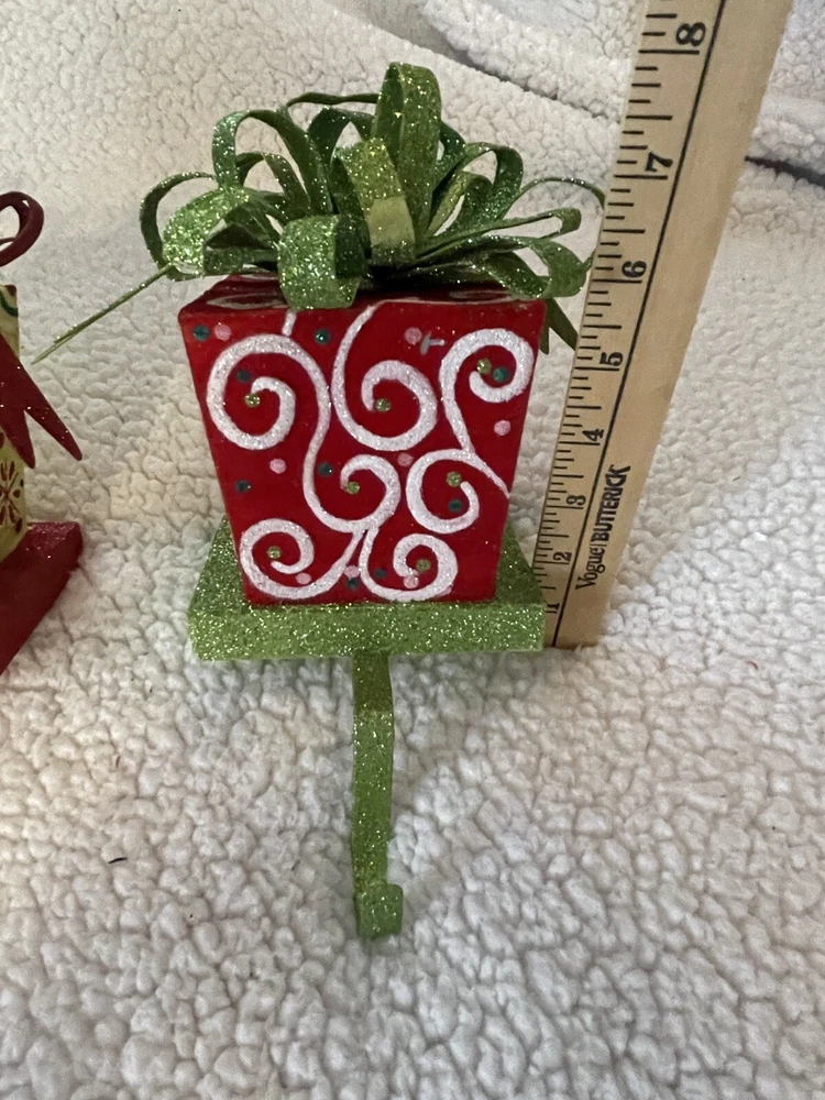 Type:Stocking HangerOccasion:ChristmasCharacter Family:Christmas PresentsNumber of Items:3Color:GreenSet Includes:Stocking HangerBrand:UnbrandedShape:SquareSize:MediumMaterial:Glitter, Metal