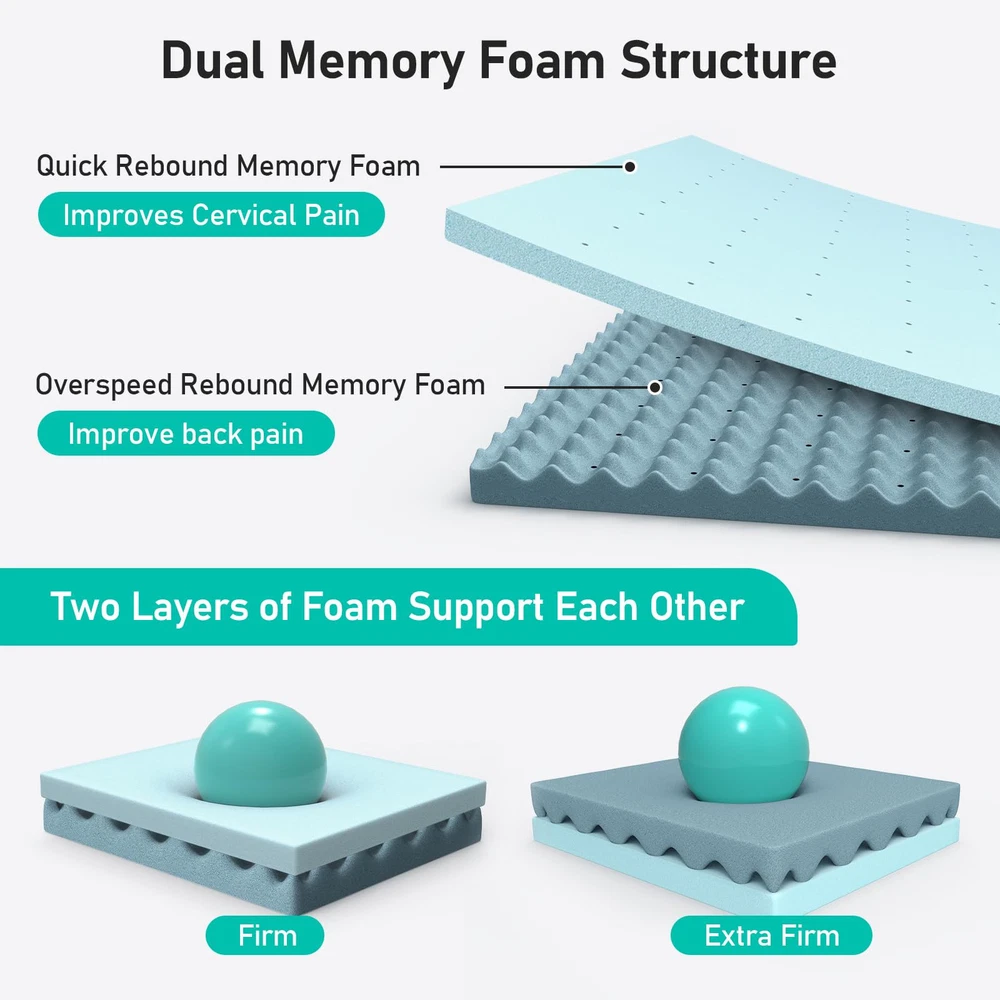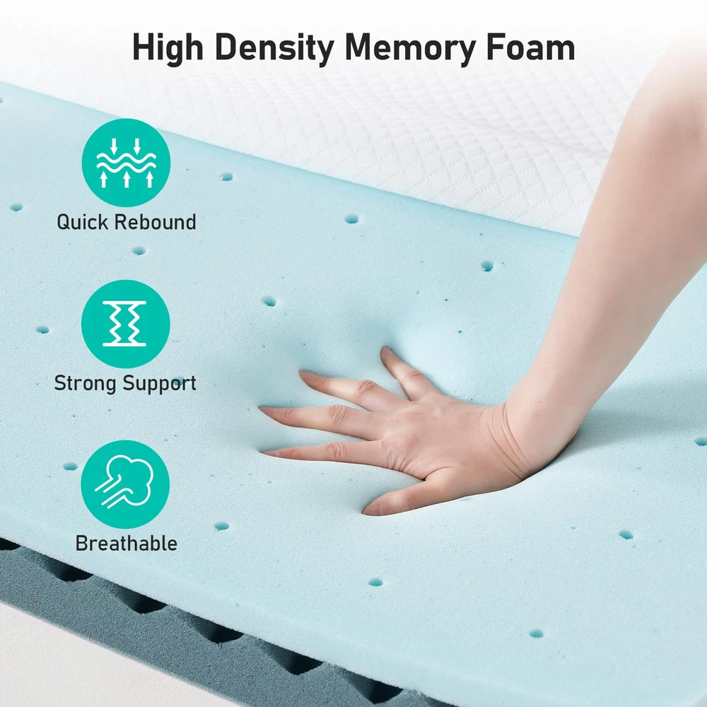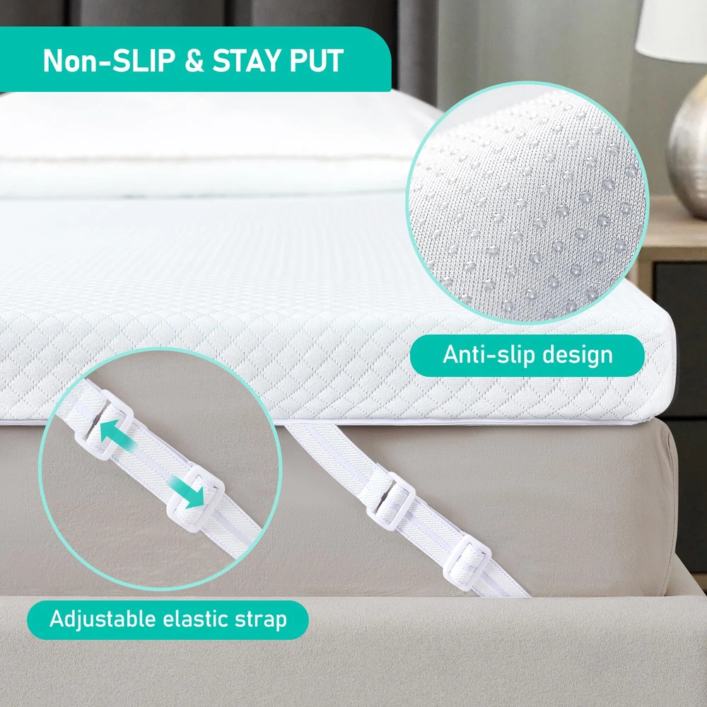 Unique Double-layer Design: This 3 inch mattress topper uses a double-layer sponge design inside. The upper cooling gel memory foam mattress provides soft comfort, and the lower egg crate foam mattress provides solid support. The two combine into an ideal balanced structure, soft and supportive, creating a perfect sleeping experience for you Cool & Breathable: The tiny holes in the upper cooling gel memory foam pad and the concave and convex surface of the lower egg crate foam pad inside the cooling mattress topper can accelerate air circulation, help dissipate heat, and keep the overall mattress topper cool and comfortable Cleaning Worry-free: The mattress topper is equipped with a convenient zipper design, which can be removed for machine washing at any time to ensure that the mattress topper protector is clean and dust-free. At the same time, the mattress topper is certified by CertiPUR-US and OEKO-TEX, which is gentle and skin-friendly, providing you and your family with a green and healthy sleeping environment Immersive Sleep: The anti-slip particles at the bottom of the 3 inch memory foam mattress topper combined with the four adjustable elastic bands on the side can firmly fix the mattress topper on the bed, so you don’t have to worry about sliding or noise disturbance when you fall asleep, helping you enjoy a full night of sound sleep Relieve Shole Body Pressure: The gel memory foam mattress adjusts its support according to your weight, fits your body curve when in contact, provides precise support for the head, back, neck, shoulders and legs, and relieves pressure and pain, helping you sleep deeper and more soundly, and sweeping away fatigue