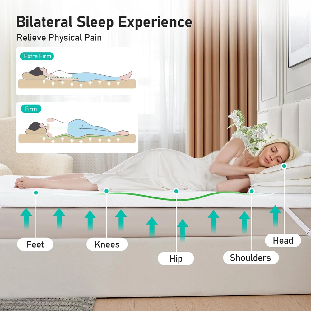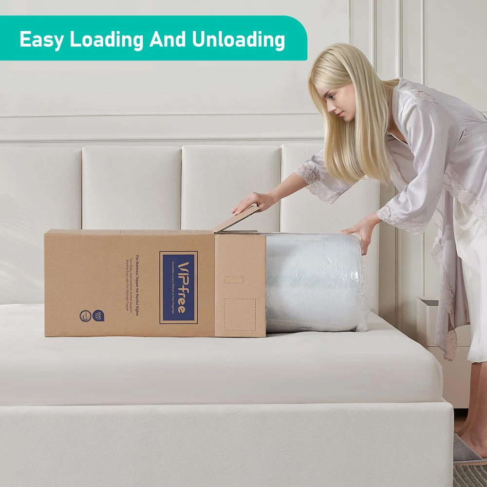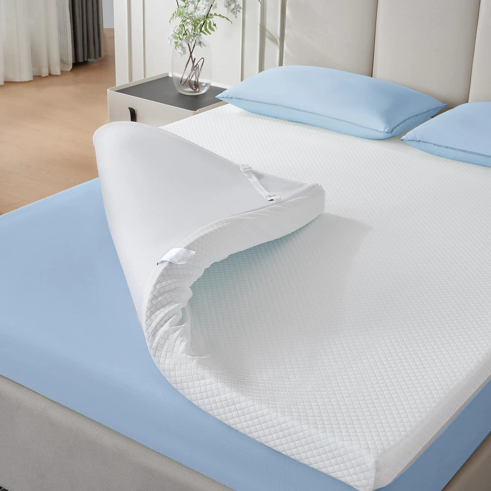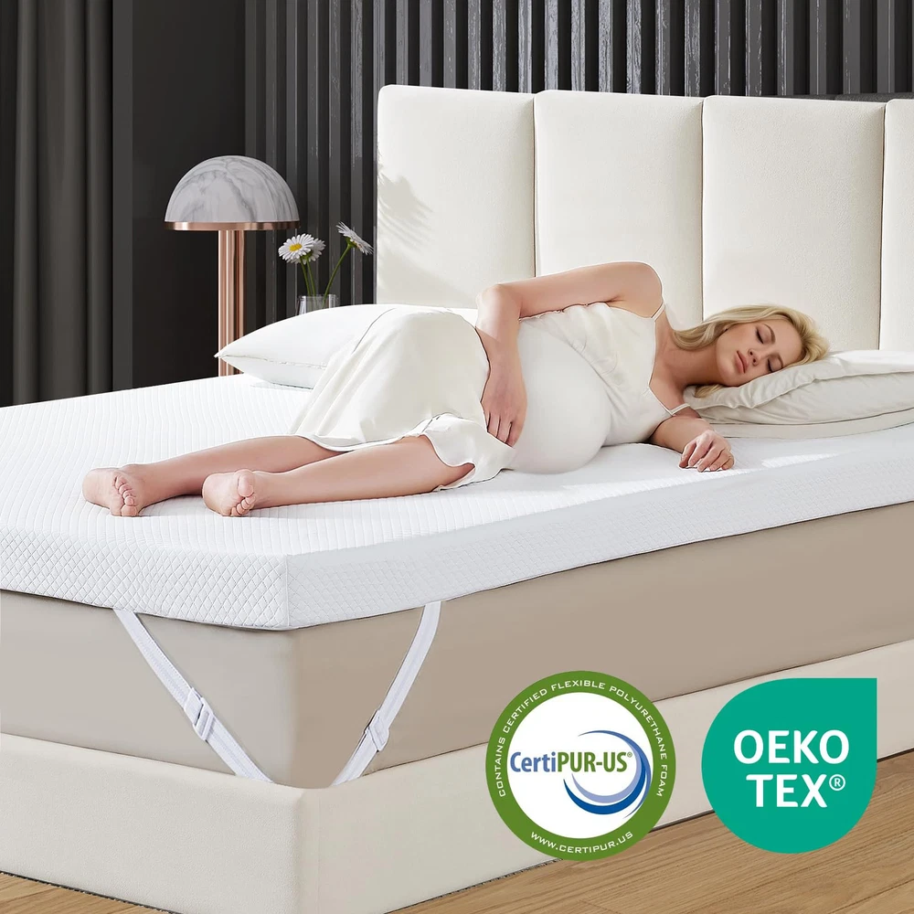 Unique Double-layer Design: This 3 inch mattress topper uses a double-layer sponge design inside. The upper cooling gel memory foam mattress provides soft comfort, and the lower egg crate foam mattress provides solid support. The two combine into an ideal balanced structure, soft and supportive, creating a perfect sleeping experience for you Cool & Breathable: The tiny holes in the upper cooling gel memory foam pad and the concave and convex surface of the lower egg crate foam pad inside the cooling mattress topper can accelerate air circulation, help dissipate heat, and keep the overall mattress topper cool and comfortable Cleaning Worry-free: The mattress topper is equipped with a convenient zipper design, which can be removed for machine washing at any time to ensure that the mattress topper protector is clean and dust-free. At the same time, the mattress topper is certified by CertiPUR-US and OEKO-TEX, which is gentle and skin-friendly, providing you and your family with a green and healthy sleeping environment Immersive Sleep: The anti-slip particles at the bottom of the 3 inch memory foam mattress topper combined with the four adjustable elastic bands on the side can firmly fix the mattress topper on the bed, so you don’t have to worry about sliding or noise disturbance when you fall asleep, helping you enjoy a full night of sound sleep Relieve Shole Body Pressure: The gel memory foam mattress adjusts its support according to your weight, fits your body curve when in contact, provides precise support for the head, back, neck, shoulders and legs, and relieves pressure and pain, helping you sleep deeper and more soundly, and sweeping away fatigue
