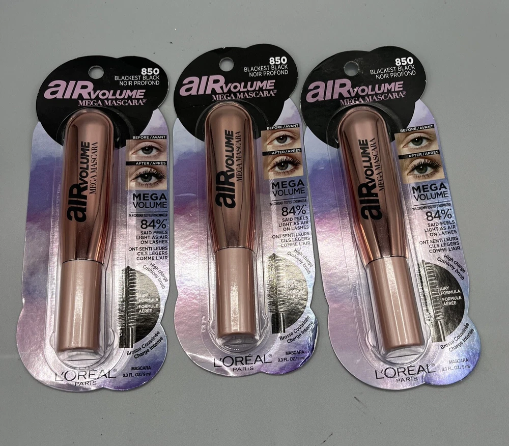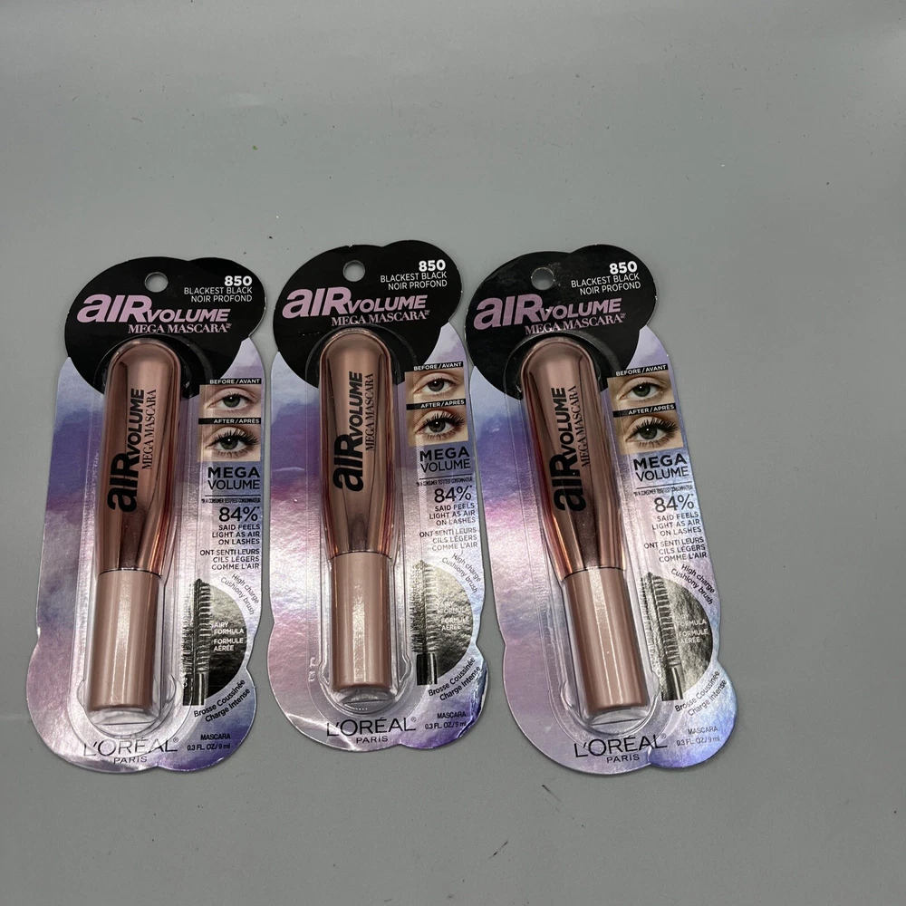 (3) L'OREAL Paris Blackest Black #850 AIR VOLUME Mega Mascara .3 fl.oz