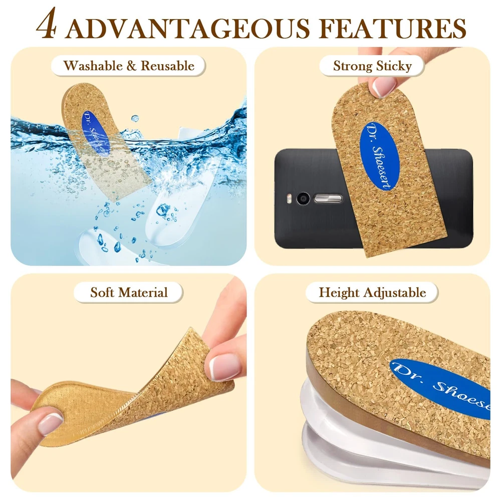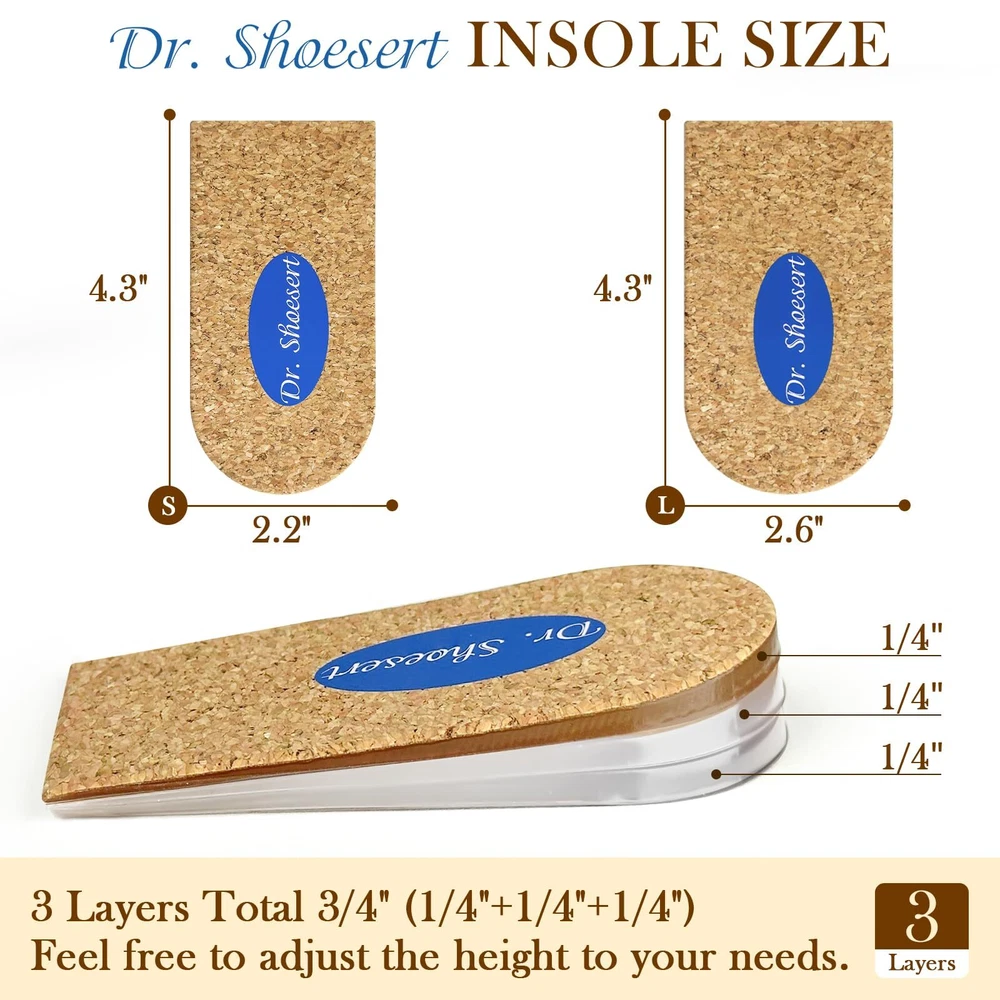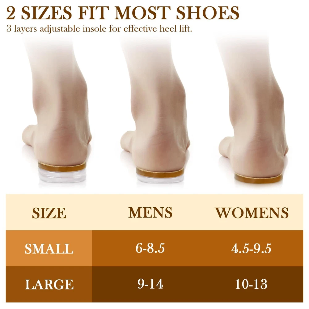 EASY TO USE - Each heel pads for shoes has self-adhesive bonding, just peel off the film on the back of the heel lift and place it on the heel of your shoes where it fits, it will not easily slide inside your shoes, you can also cut your own size according to the different shapes of your shoes to fit your shoes perfectly. 3 LAYERS ADJUSTABLE DESIGN - The height increase insoles include a total of three 1/4" pads, you can adjust to 1/4", 2/4" and 3/4" heights at will according to your needs, you can customize your own lifting heights that best suits you for a better corrective leg length deviation or height increase effect. EASY RELIEF FROM FOOT PROBLEMS - Simply place the right height shoe lifts into your shoes for easy relief from heel pain, heel spurs, Achilles tendonitis, pain from sports injuries, and correction of leg length discrepancies. WASHABLE & REUSABLE - Our heel inserts are made of GEL material which is not only soft and comfortable, but can also be washed in water to make the heel pads look new and reusable. TWO SIZES FIT MOST SHOES - This heel lift have two sizes please choose the exact size that matches your shoes, small size is suitable for women's size 4.5-9.5, men's size 6-8.5, large size is suitable for women's size 10-13, men's size 9-14. The height increase insoles are suitable for many types of shoes, such as sneakers, leather shoes, boots, sandals, slippers and high heels, etc., which makes you more convenient to use.
