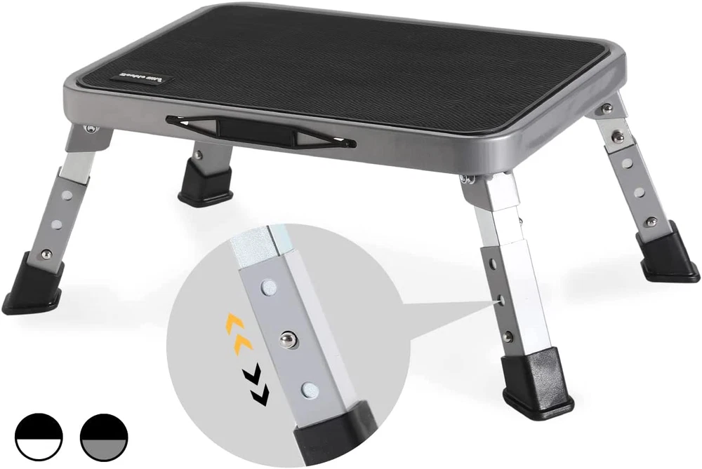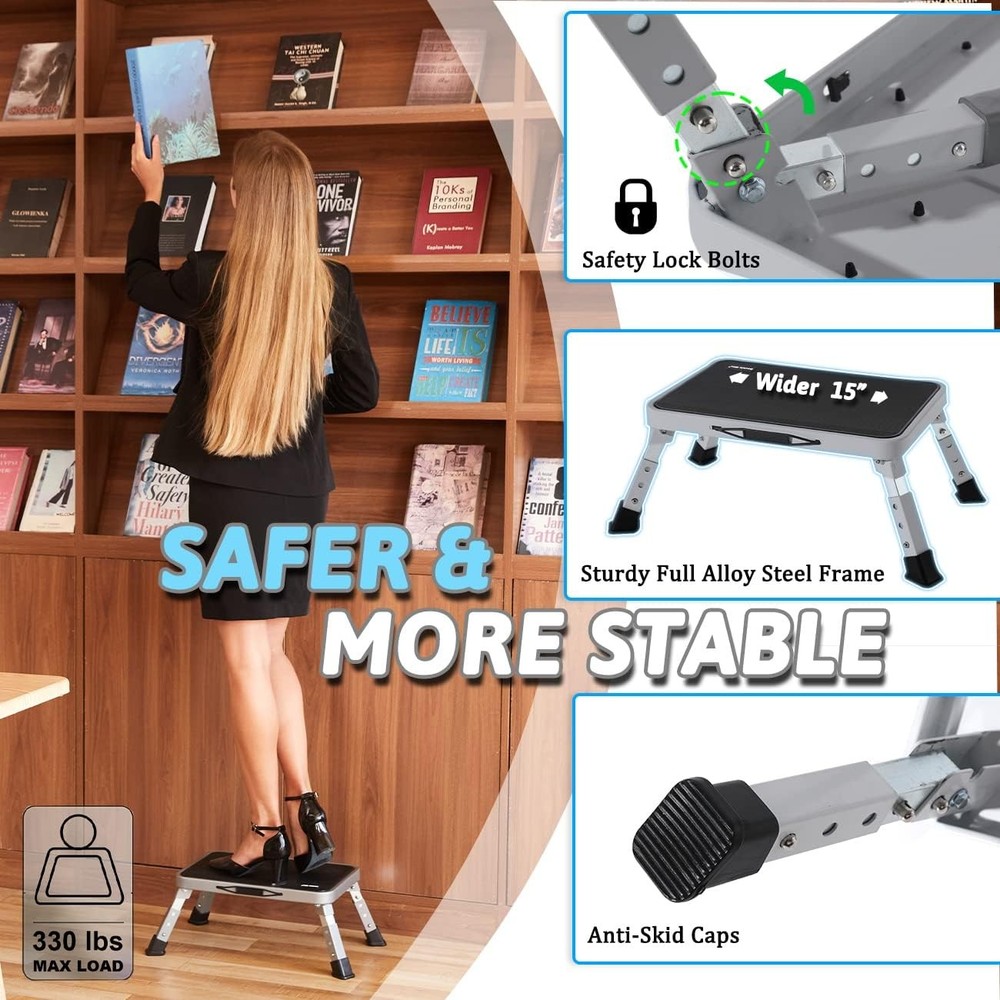 Store New Arrivals Add to Favorite View Feedback Contact 3 Levels Adjustable Folding Step Stool for Adults Sturdy Metal RV Step Safer Description Item model number FSS02-GY Style Foldable, 3-Level Heights Adjustable Batteries Included? No Special Features 3 adjustable heights, foldable, sturdy 330 lbs load Room Type Bedroom, living room, dining room, kitchen Finish Polished Steel Assembly Required No Product Dimensions 10"D x 15"W x 9"H Material Alloy Steel, Plastic, Rubber Maximum Height 9 Inches Age Range (Description) Kids, adults, seniors/the elderly Maximum Weight Capacity 330 Pounds Specific Uses For Product Adjustable step stools for adults/kids/seniors/the elderly Item Package Quantity 1 Model Name FSS02-GY Number of Steps 1 Batteries Required? No Item Weight 5 pounds Is Foldable Yes Special Feature 3 adjustable heights, foldable, sturdy 330 lbs load Weight Limit 330 Pounds Part Number FSS02-GY Shape Square, Foldable Base Type Legs Size 3 Adjustable Height 7/8/9" 【Better Folding Step Stools for Adults】Double Elite folding step stools for adults are featured with height-adjustable design, perfect for your different height demands indoors/outdoors. The foldable step stool works greatly as an adjustable RV step stool. The metal Alloy Steel kitchen step stools are much sturdier than plastic & other metal stepping stools, thanks to its thickened full steel frame. As an office step stool with wider step surface, you can stretch your feet more freely at work. 【Upgraded 3 Levels Adjustable Design】Unlike traditional one step stools with fixed height, Double Elite has upgraded the folding step stools for adults with 3-level adjustable heights, so to work for different situations perfectly. Total heights of this adjustable small stepping stool can be about 7, 8, 9 inches off the ground. Every inch higher counts for the elderly or adults in need, and children especially. 【Safer & More Stable】Safety & stability are 2 main priorities for folding step stools. Double Elite sturdy heavy duty step stools for adults are with full frame made of quality thickened Alloy Steel, max loading capacity about 330 Lbs. They are safer, more stable to use than plastic step stools & other brands steel folding stools. The safety lock bolts can keep the step-stool stably in place; meanwhile the stool legs with non-slip caps stay firm. 【Easy to Use】Pls follow image #6 demonstration to save your efforts. Came assembled so no installation needed. You can unfold/fold the foldable step stool easily, and adjust heights in 1 minute (setup instructions & illustration video are available). You can carry anywhere & store the small portable foot stool with handle easily, thanks to its convenient handle & folding compact design. 【Wide Application】The multi-use adjustable step stools for adults work well for different purposes & people. The height-adjustable RV step stool / SUV car step stool is specifically friendly to kids/seniors/the elderly, who need different heights on board. The kitchen step stool works great for other home daily uses such as bathroom, bed. With wide surface & firm support, it feels safer & comfortable to step/seat on, nice use as foot stool under desk, folding stool for office etc. Product description Why Double Elite adjustable folding step stool? Upgraded design: 3 adjustable levels Safer & sturdier Easy to use & store Work well for different people & purposes The video showcases the product in use. The video guides you through product setup. The video compares multiple products. The video shows the product being unpacked. video Merchant Video Double Elite Step Stool Series Add to Cart Add to Cart Add to Cart Add to Cart Add to Cart Customer Reviews 4.7 out of 5 stars 1,405 4.4 out of 5 stars 24 4.7 out of 5 stars 1,044 4.7 out of 5 stars 1,044 4.7 out of 5 stars 1,405 4.4 out of 5 stars 211 4.7 out of 5 stars 320 Price $24.99 $ 24 . 99 $71.99 $ 71 . 99 — $39.99 $ 39 . 99 $24.99 $ 24 . 99 — $49.99 $ 49 . 99 Key Features Height Adjustable Design Extra-Long Handrail & Tool Bag Safety Handgrip & Tool Bag Sturdy Full Steel Alloy Height Adjustable Design Value For Money,Stylish Colors Max Safety & Sturdiness Max Load 330 Lbs 330 Lbs 330 Lbs 330 Lbs 330 Lbs 330 Lbs 500 Lbs Max Raised Height off Ground 9 Inches 45.5 Inches 36 Inches 26 Inches 9 Inches 27 Inches 27 Inches Item Unit Weight 5 Lbs 19.5 Lbs 14.5 Lbs 10 Lbs 5 Lbs 11 Lbs 12 Lbs Main Raw Substances Alloy Steel, Plastic Alloy Steel, Plastic Alloy Steel, Plastic Alloy Steel, Plastic Alloy Steel, Plastic Alloy Steel, Plastic Alloy Steel, Plastic Folded Size 15 x 10 x 2 Inch 71 x 16 x 6 Inch 54 x 16 x 2 Inch 35 x 16 x 2 Inch 15 x 10 x 2 Inch 44 x 18 x 2 Inch 44 x 20 x 2 Inch The foldable step stools for adults can be adjusted easily in heights, to become folding step stools 7, 8, 9 inches off the ground. Every inch higher counts for the elderly or adults in need, and children especially. Compared to plastic folding step stools & other steel ones in the market, Double Elite metal folding step stools for adults/kids have upgraded features, so to provide extra sturdiness, safety, comfort, and cover more uses. 1 RV Step / SUV Car Stool 2 Foot Stool under Desk 3 At Office 4 Kids Step Stool 5 At Home use instructions & video available ABOUT US We offer the best prices around on high quality products. Our E-store includes media such as books, movies, music and games while offering electronics, toys, sporting apparel, clothing, tools, general home, garden items and more. SHIPPING We are always working hard to ensure your package arrives as soon as possible. Please understand that some factors like weather, high postal traffic, and the performance of shipping companies are outside of our control. We offer free shipping to the lower 48 states and ship within 2 business days of payment, usually sooner. We do not accept P.O. Boxes. Please provide a physical address. RETURNS We offer a 30-Day Return Policy on items which you are not complet