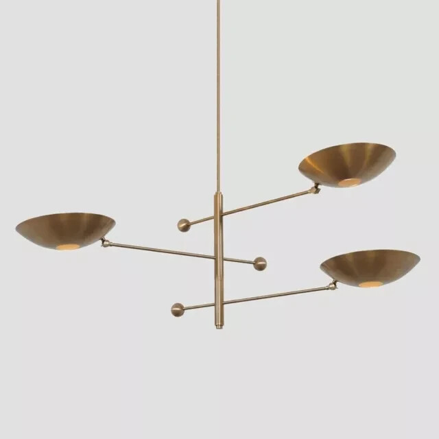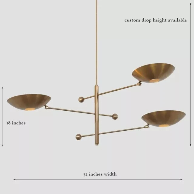 This iconic and stunning 3 arm lights mid century style sputnik chandelier perfect for both modern and industrial homes. Structure with brass material. multiple brass finishes are available. Fixture Measurements: - Made with heavy brass material - 52" Width x 12" deep x 18" height itself - Total Length : Custom drop lengths are available. - 5 inches mounting canopy. custom canopy available. - Required 3 x E26 120-240 voltage standard base bulbs. - Required 3 x E27 240 voltage standard base bulbs for European countries. - UL listed material and components. - Hardwired : All installation hardware are included - Bulbs not included with the purchase - Compatible with all medium base bulbs including LED, Edison and CFL. Finishes: All of our lighting are handmade and hand finishes. color for cone shades are available at request. Available Finishes : Antique Patina Polished Brass Satin/brushed brass Brushed nickel Polished Nickel Black Brass
