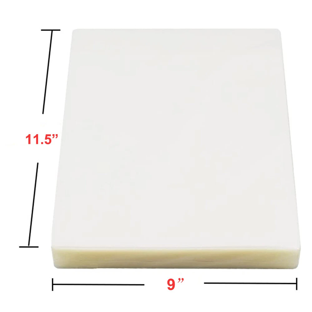 3 Mil Clear Thermal Laminating Pouches Letter Size Laminator Sheets 9"x11.5" Details: Size: 9"x11-1/2" Thickness: 3 Mil Features: 9" x 11-1/2" laminating pouches Photo safe materials, Seal & Protect your documents Compatible with all thermal laminator machine Quality laminating pouches provide clarity and durability, Great for children's Artworks Compatible with letter-size, legal-size, business-card-size, and photo-size papers Package Included: 30/100/200/300/400/500/1000X 3 Mil Thermal Laminating Pouches