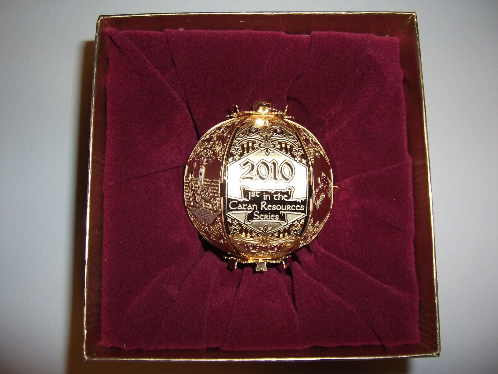 3 NEW SETTLERS OF CATAN Cut Brass Ornaments Mayfair Games WHOLESALE LOTS MIB NIB Packaged in deluxe presentation boxes, these stunning brass ornaments are sure to delight Catan fans and collectors. Each ornament features the Mayfair Games and Catan logos, with scenes during the production of these resources: 2010 BRICK (1st in the Catan Resources Series) 2011 WOOD (2nd in the Catan Resources Series) 2012 SHEEP (3rd in the Catan Resources Series) SHIPPING $4.99 USPS Economy Mail. BUY MORE AND SAVE MORE! EXCELLENT BIRTHDAY & HOLIDAY PRESENTS!