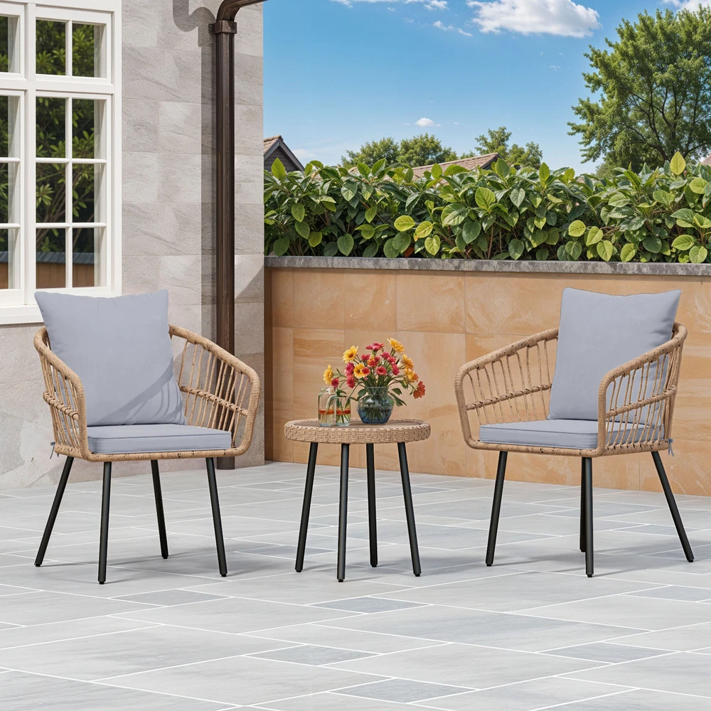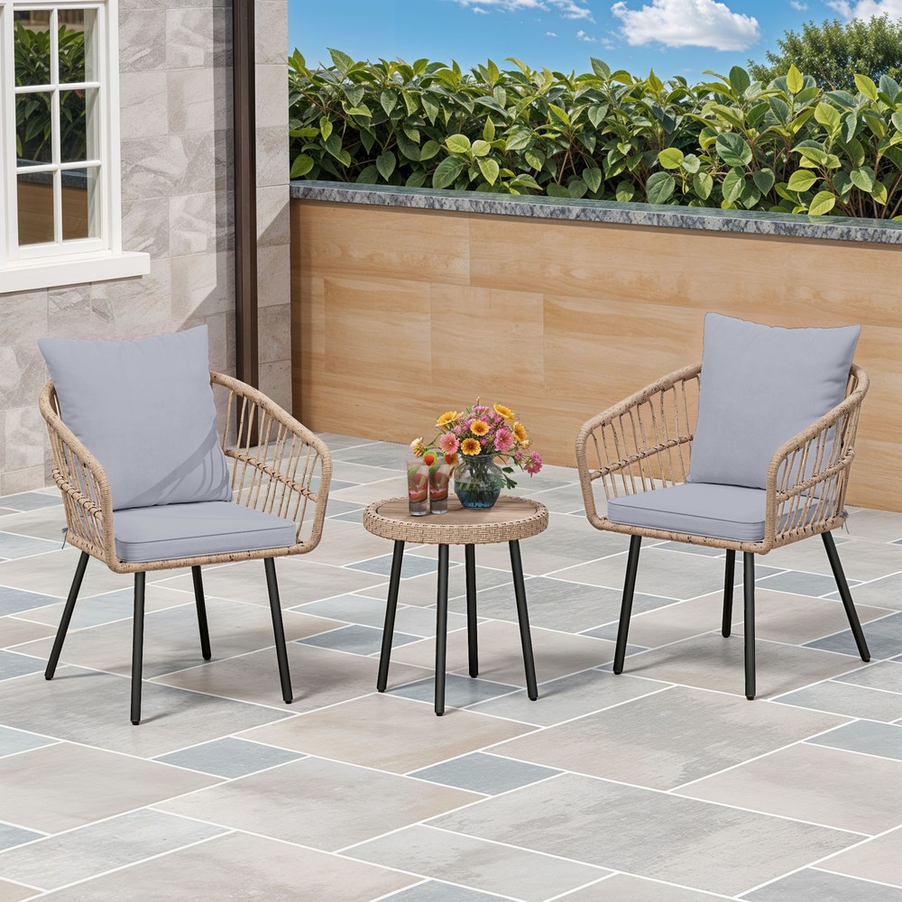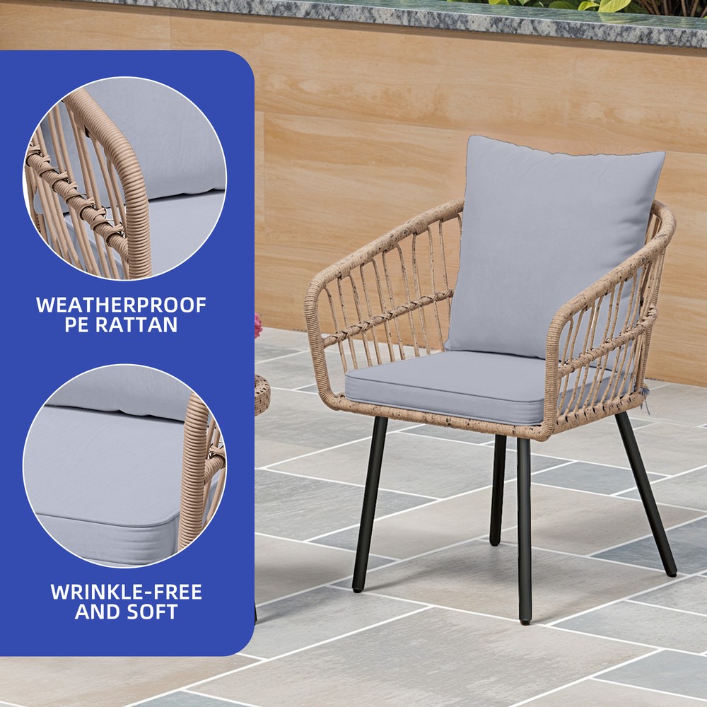 3 PCS Patio Rattan Chair & Table Wicker Bistro Set Gray Thick Foam for Outdoor Product Description NOTE: Professional Installation Would Be Highly Recommended. Description : 1. Color: Gray 2. Material: Rattan, Wicker, Steel, Polyester Fabric 3. Room Type: Living Room, Entertainment Room, Open Plan Living Area, Sunroom, Patio, Backyard, Outdoor, Courtyard, Deck, and Poolside. 4. Features: Thick Comfortable Soft Cushions, Comfortable & Breathable Fabric, Skin Friendly Fabric, Thick & Strong Wicker, Rust-Resistant Metal, Removable Cover, UV Protected, Weatherproof, Waterproof, Easy to Assemble, Easy to Clean, Protective Foot Pads. 5. Weight Capacity: Chair 259 lbs, Table 66 lbs. Features: 1. Stable Adjustable Feet: Equipped with anti-slip pads, the adjustable feet enhance stability on uneven surfaces. This feature prevents unwanted movement, ensuring secure placement. 2. Weatherproof & Soft: Made of durable PE rattan, the chair withstands various weather conditions for long-term outdoor use. The wrinkle-free cushions provide a plush and cozy seating experience. 3. Durable Woven Table: Constructed with a rust-resistant steel frame, the woven coffee table offers lasting strength. Its scratch-resistant tabletop adds both style and functionality. 4. Size & Capacity: Perfect for patios, balconies, or gardens, this set offers a cozy outdoor seating solution. The sturdy chair supports up to 259 lbs, while the durable table holds 66 lbs, ensuring reliability and practicality. Dimensions: 1. Chair Dimension: 24.8 "D x 24.8 "W x 28.74"H 2. Table Dimension: 17.71"Ø x 18.3"H Package Included: 1. 2 x Chairs 2. 1 x Table 3. 1 x Cushions Set 4. 1 x Instruction Manual Note: 1. During assembly, do not tighten screws until all holes are aligned. 2. Confirm the appropriate furniture size for your needs prior to purchase. 3. There may be a slight color discrepancy between the product as seen on your monitor versus in real life. 4. Do not expose the product to extreme sunlight. To extend product lifetime, cover sofas when not in use. 5. Contact us immediately if any components are missing or damaged upon arrival. Our customer service team will resolve your issue right away. 6. Protect cushions from rain. The inner sponge is NOT waterproof. To extend product lifetime, cover sofas when not in use. 7. T he product will be dispatched separately into 2 packages, may not arrive simultaneously. Shipping 1. Normally the item will be dispatched within 1 business day if payment is cleared before 12 pm PST. 2. Please verify the correct shipping address in your PayPal account before making the payment. We only dispatch the item to the address that is sent to us at the time of checkout. 3. We don't ship to Hawaii, Alaska, Puerto Rico, APO/FPO/PO Boxes. 4. We don't provide local pick-up service. 5. Normally we will use USPS, UPS, FedEx & LTL to dispatch items. Payment 1. We accept PayPal and credit card. 2. We will ship to the confirmed Paypal shipping address that is provided with the payment only. Return 1. 30 days Money Back Guarantee. 2. Please contact our customer service to receive a RMA form first if want to return the item. 3. All returned items MUST in new condition with the original package. Contact If has any problem, please contact us by sending an ebay message. Our customer service will resolve the problem as soon as possible. On Mar 4, 2025 at 18:26:38 PST, seller added the following information: