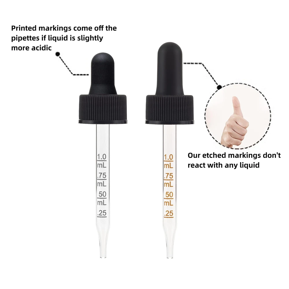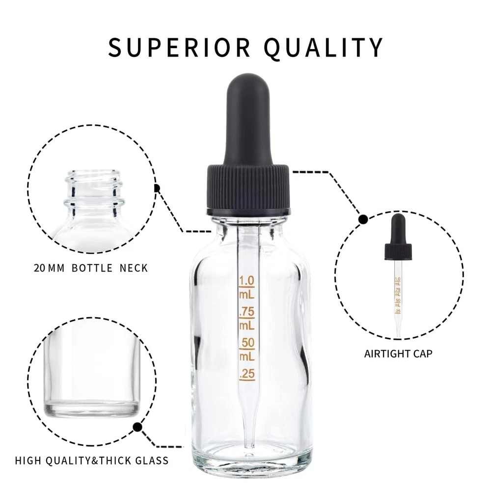 30ML Clear Dropper Bottle: Neck 20mm. Diameter 1.25 in*Height 4.33 in. Eye Dropper with Markings Don't React with Any Liquid. No Worry About Faded Measurements. Bigger Silicon Bulb than Others, Better Suction with 1.0 ml. Glass Pipette Long Enough to the Bottom of the Bottle. Small Funnel Makes It Easy to Fill in Your Liquid. Labels to Identify and Mark Different Liquids. Thick Glass Makes the Bottle Not Easily Broken. Tight Glass Eye Dropper Prevents Any Leakage. Clear Dropper Bottle Allows You to Identify Liquids and Looks Great with Any Label. Perfect for Travel and Conveniently Fits in Your Purse with Safe, Secure and Convenient Packaging. Bottles and Droppers are Reusable and Refillable to Save Your Money.