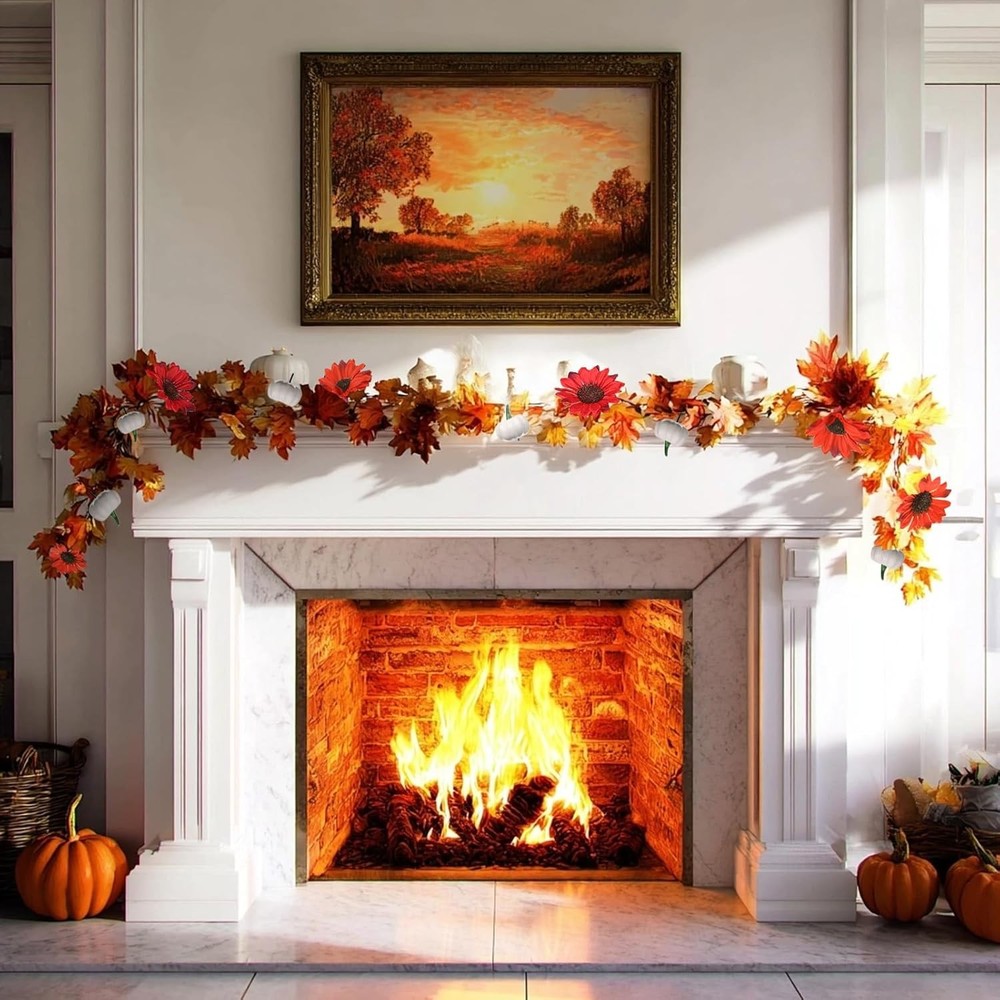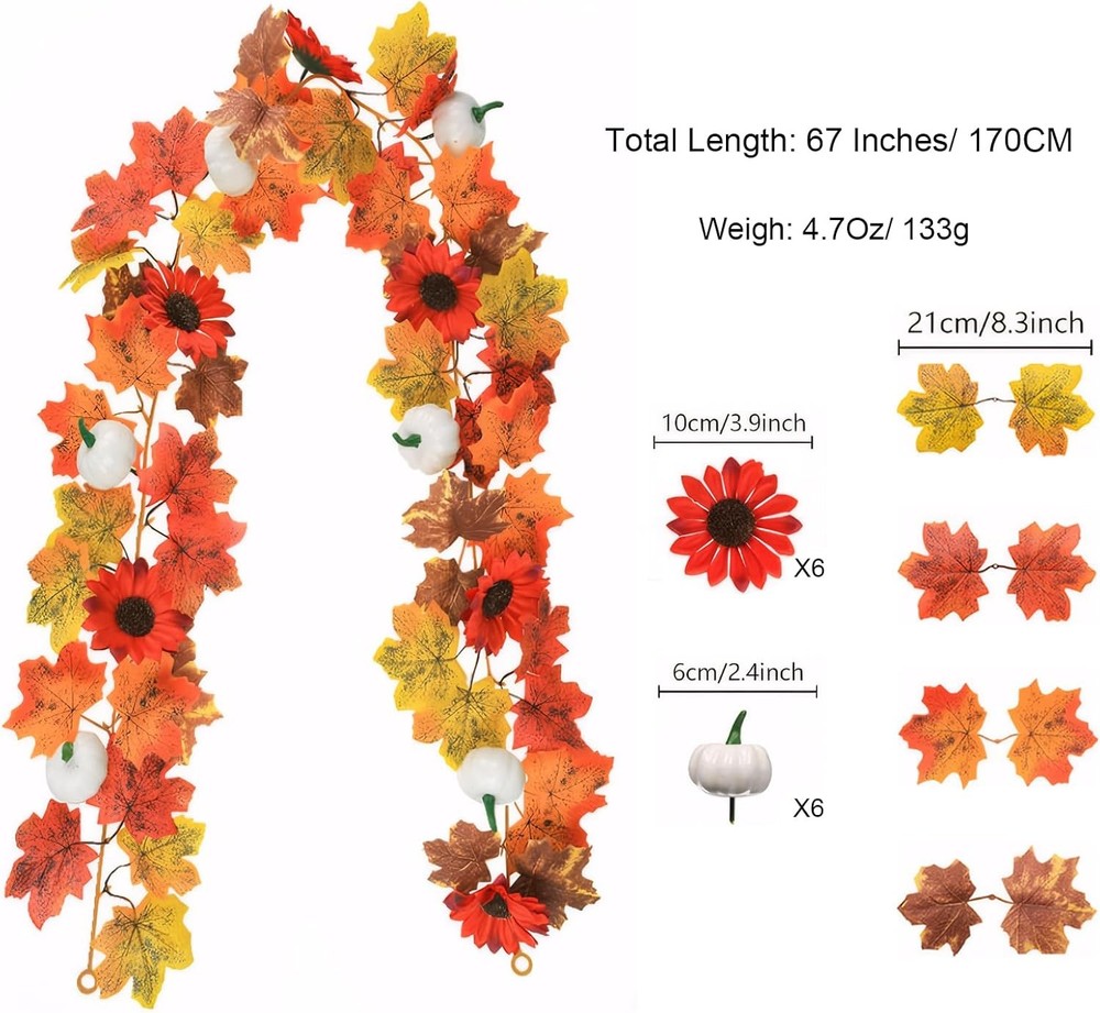 3 Pack Fall Garland for Mantle - 5.6Ft Artificial Maple Vine with Red&white LuxeFusion Product Description Features 【Premium Fall Garland - 3-Pack Set for Mantle & Fireplace】 Includes three 5.6ft artificial maple vines. Each has 44 realistic maple leaves (3.5-4"), 6 mini pumpkins (2.4"), 6 sunflowers (4"). Weight: 4.7oz/garland. 【Versatile Decor - Autumn Leaf Garland for Indoor & Outdoor】 Perfect for fireplace mantles, stair railings, and porch columns. Transitions seamlessly between Halloween pumpkins and Thanksgiving sunflowers. 【Realistic Detailing - Fake Vine Garland with Natural Look】 Features fade-resistant fabric leaves with authentic veining and bendable stems that hold their shape. Weatherproof for outdoor use. 【Multi-Purpose Use - Fall Home Decoration for All Spaces】 Create harvest displays by draping as table runners, window valances, or wedding arch decorations. Coordinates with farmhouse style. 【Ready-to-Use - No Assembly Fall Garland Set】 Pr-assembled design requires no tools - simply unbox and arrange for instant seasonal charm. Product Details Manufacturer: Elecxlink Package Dimensions: 8.5 x 8.46 x 5.98 inches Item Weight: 1.04 pounds Country of Origin: China Item model number: Red&White Brand: Elecxlink Color: Red&white Material: Fabric Is Lighted: No Shape: Runner Free Shipping All orders ship free and fast to your doorstep. Easy Returns Satisfaction guaranteed. 30-day returns, no questions asked. 24/7 Support Contact us anytime; we’re here to help, day or night. Brought to you by LuxeFusion – Quality you can trust.