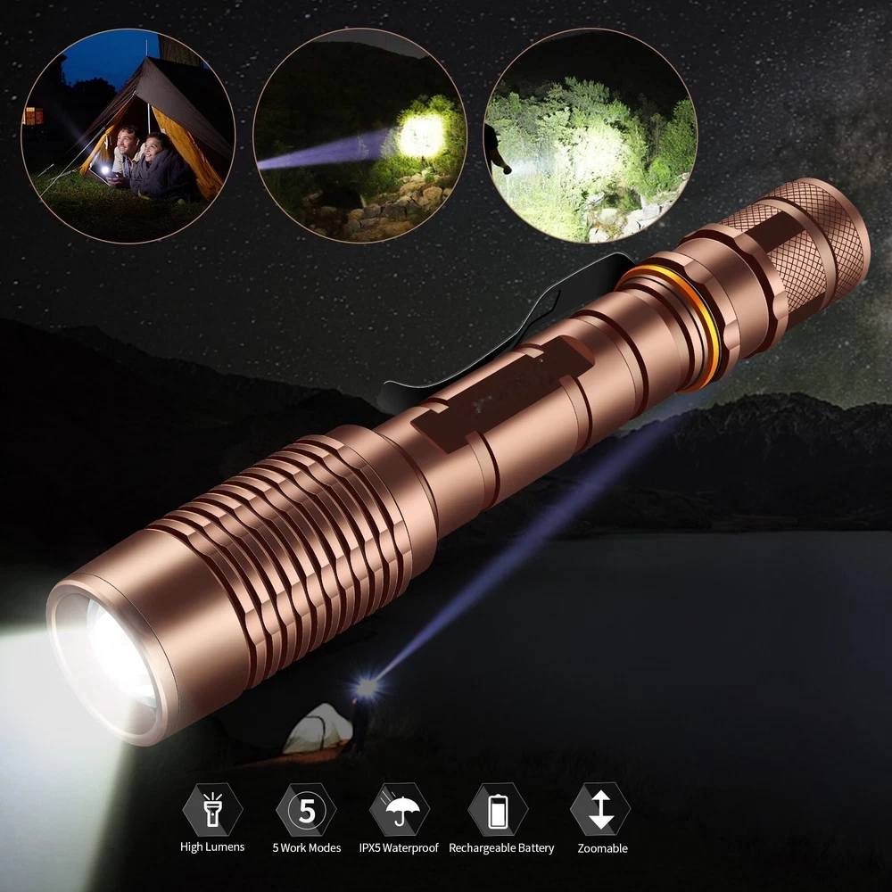 3 Pack 990000LM Super Bright LED Flashlight Work Light LED Torch Lamp Zoomable Note: 3.7v Rechargeable battery is not included. Features: Super Bright LED Flashlight Featured with adjustable focus; waterproof performance; memory function 1.【Bright Flashlight】 Super bright LED flashlight output irradiation distance up to 1000ft, with a long lifespan of 100,000 hours. Perfect for everyday use, like dog walking, camping, emergencies. 2.【5 Modes & Zoomable】 The waterproof flashlight LED have 5 light workingh modes: High > Medium >Low > Strobe >SOS (with a slight press of the power button to switch light mode) . The LED flashlight with focused function, you can just stretch flashlight head to adjust the focus, zoom in for close work or zoom out for distance. 3.【Long-Lasting】 In the case of fully charged, the super bright zoomable LED flashlights torch can be used for 4 hours under high light, 20 hours in low light. 4.【Waterproof & Durable】 The flashlight high lumens super bright waterproof is made of excellent aluminum alloy, impact-resistant up to 5 feet. With water-resistant, you can stop worrying about unexpected weather rain or snow. Please don't put into water for a long time. 5. 【Memory mode function】 This LED flashlight super bright Remembers and Turns on to the Last Setting that it is Operated On. 6. This is the same super bright zoomable LED flashlight that is used by the military, police, and the elite navy seals etc. and it's best for those who need a strong and good flashlight-like police officers, hunters or campers. Specifications: 1. LED: LED 2. Color: Bronze 3. Light Color: White 4. Material: Aircraft Aluminum 5. Switch Location: Tail 6. Zoomable: Yes 7. Led Lifespan: 100,000 hours 8. Power Supply: 2 x 3.7v Li-ion Rechargeable Battery ( Not include ) 9. Mode Arrangement: High, Medium, Low, SOS and Strobe(With a slight press of the power button changes the operating mode.) Package Includes: 3x Super Bright LED Flashlight (No Battery) On Jan 24, 2025 at 04:04:18 PST, seller added the following information: