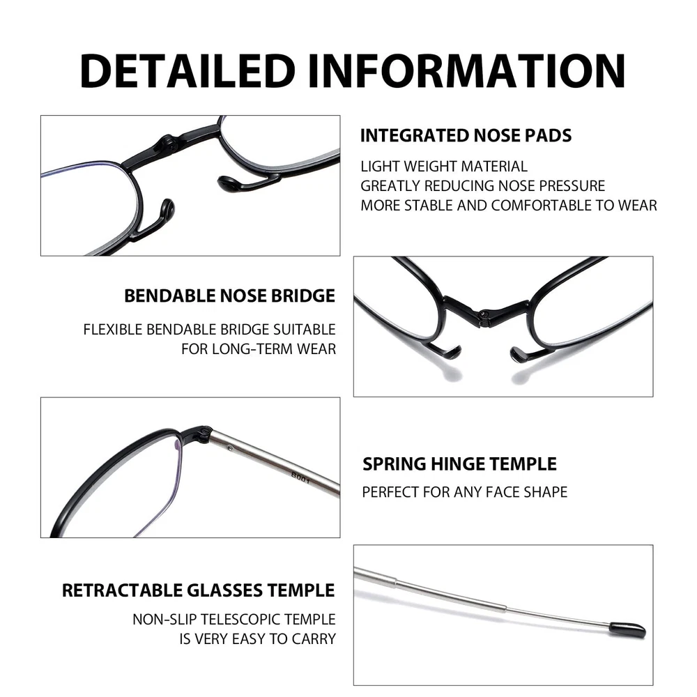 Description DISCOVER THE DIFFERENCE Our high-quality reading glasses have a classic and timeless design, and are matched with a variety of prescriptions that suit your personal style and taste The frame for the most comfortable fit available today in addition to unparalleled durability Great fashion plastic design reading glasses FEATURES AND BENEFITS Optically correct Whether you are looking for reading glasses for the office or home.blue light blocking reading glasses will give you the premium protection you are looking for INCLUDES 3*Reading Glasses 1*cleaning soft cloth CARE To avoid damage,never clean your reading glasses with paper towels or clothing or alcohol,and also avoid using household detergents or soaps.While a few mild soaps don't harm lenses,today's extra strength soaps are powerful enough to slowly disintegrate lens coatings 【Premium Quality】Keychain reading glasses with telescopic rod, not easy to broken, light weight, feel comfortable and long lasting 【Portable Readers】These compact reading glasses are very portable, you can put them in your purse, clip them on your shirt pocket, store them in your bag, keep them in the glove compartment of your car and so on. They are the perfect men women reading glasses to carry, when you travel or go outside 【Anti-Blue Light】Blue light filter and UV400 lenses can cut blue light & UV400. Whether they are used for reading watching TV gaming using computer or mobile phone they all meet your needs 【Polycarbonate HD Lens】Anti reflective, scratch resistant, accurate magnification strength, clear tint lenses work good at restoring the truest colors, always ready to provide you with the best vision and better sleep 【Satisfaction Assurance】Rest assured to buy, we stick to pay attention to product quality, any problem for this product, just contact the seller without any hesitation and we will provide you the best service