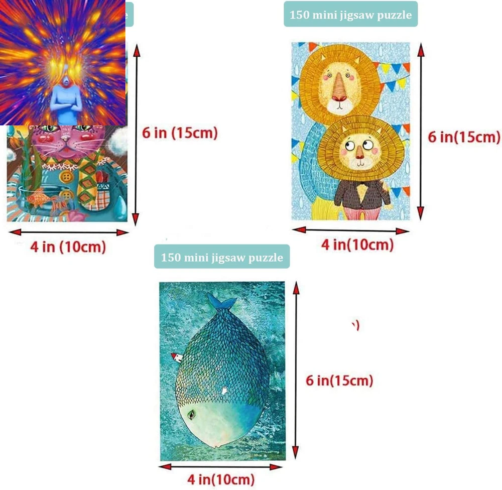 Store New Arrivals Add to Favorite View Feedback Contact 3 Pack Landscape Mini Jigsaw Puzzles 150 Pieces for Adults Small Jigsaw Puzzle 6 X 4 Inches House Entertainment Toys Home Decor Puzzles Description Item Shape Rectangular Age Range Description Adult Number of Items 150 Manufacturer Minimum Age (MONTHS) 168.00 Color 04 Lion, Cat, Fish Educational Objective Problem Solving Skill, Concentration Skill Material Cardboard Puzzle Type Jigsaw Theme Christmas Skill Level All Special Features Portable Subject Character Animal Item Dimensions L x W 6"L x 4"W Number of Pieces 150 PREMIUM MATERIAL: Small Tiny Mini Jigsaw Puzzles, they are made of 150 pieces blue cardboard paper, sturdy and bend-resistant Size: 150 pieces jigsaw puzzles finished size is 6 x 4 inches / 15 x 10 cm. Convenient, handy and suitable for play with families and friends, great pastime and leisure activity Please Note: This jigsaw puzzle is mini small and tinny. Each pieces of puzzles is much smaller than the standard version. Frame is not included Postcard design on the back: You can write a message after completion. Puzzles are a fun activity to do alone or in a group and make a great gift for all ages at birthdays and holidays, and it can build skills such as concentration and creativity Package Include: 3 packs jigsaw puzzles. MINI 150 pieces of puzzles provide you with the fun of enjoying the game, allowing adults to release stress during the process. It is the best choice for puzzle lovers. Perfect gifts for parents, friends, lovers at Christmas. After completion, they will have a sense of accomplishment and can be used as wall decorations Product Description Fun and Challenging Puzzles Made of 150 pieces high quality recycled blue cardboard,sturdy and bend-resistant. The jigsaw puzzles finished size is 6 x 4 inches / 15 x 10 cm. Convenient,handy and suitable for play with families and friends,great pastime and leisure activity. Package includes 3 Pack jigsaw puzzles Challenging Puzzles - Small Jigsaw puzzles for adults and kids 150 pieces. There is a picture reference on the test tube. When encounter pieces which are look alike, catch any tiny clue to find out its right place. Congratulations! Enjoy your victory. Small Jigsaw puzzles 150 pieces This is a 150 piece puzzle, fully tailored, full-color puzzle game with a unique piece of work designed to bring you a sense of serenity.Keep it for yourself or as a gift to a friend or family member, anyone will enjoy the amazing art. Missing Mini jigsaw puzzles Just by email tell us if you find a piece is missed, Replacement tiny jigsaw puzzles pieces will be sent you immediately. If necessary, we will send you a brand new puzzles as compensation. ABOUT US We offer the best prices around on high quality products. Our E-store includes media such as books, movies, music and games while offering electronics, toys, sporting apparel, clothing, tools, general home, garden items and more. SHIPPING We are always working hard to ensure your package arrives as soon as possible. Please understand that some factors like weather, high postal traffic, and the performance of shipping companies are outside of our control. We offer free shipping to the lower 48 states and ship within 2 business days of payment, usually sooner. We do not accept P.O. Boxes. Please provide a physical address. For shipping outside of the continental USA, we only use eBay's Global Shipping Program.The item is shipped to KY and then sent to the rest of the world. International customers are responsible for all duties and taxes. Continue to check out in order to calculate costs for shipping the item to your country. Messages regarding eBay's Global Shipping Program MUST be directed at eBay EXCLUSIVELY. RETURNS We offer a 30-Day Return Policy on items which you are not completely satisfied with. You have the option for a full-refund or an exchange of the item. No returns are available on items shipped outside of the USA. PAYMENT We accept PayPal. CONTACT US This page content is yet to come Please ad us to your favorite seller and visit again later Thank You CUSTOMER SATISFACTION We try our very best to make sure every customer is completely satisfied. If there's a problem, message us! We're happy to help. WE ACCEPT