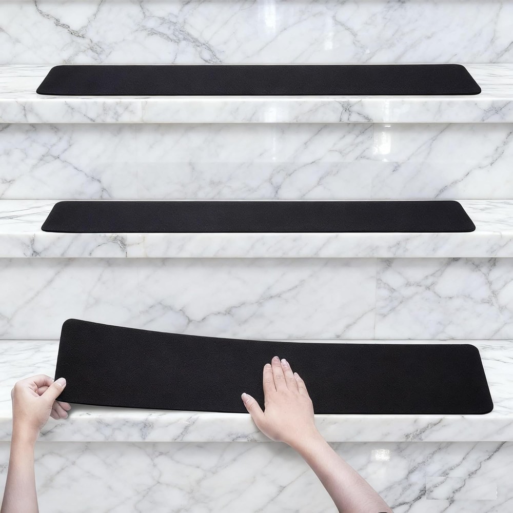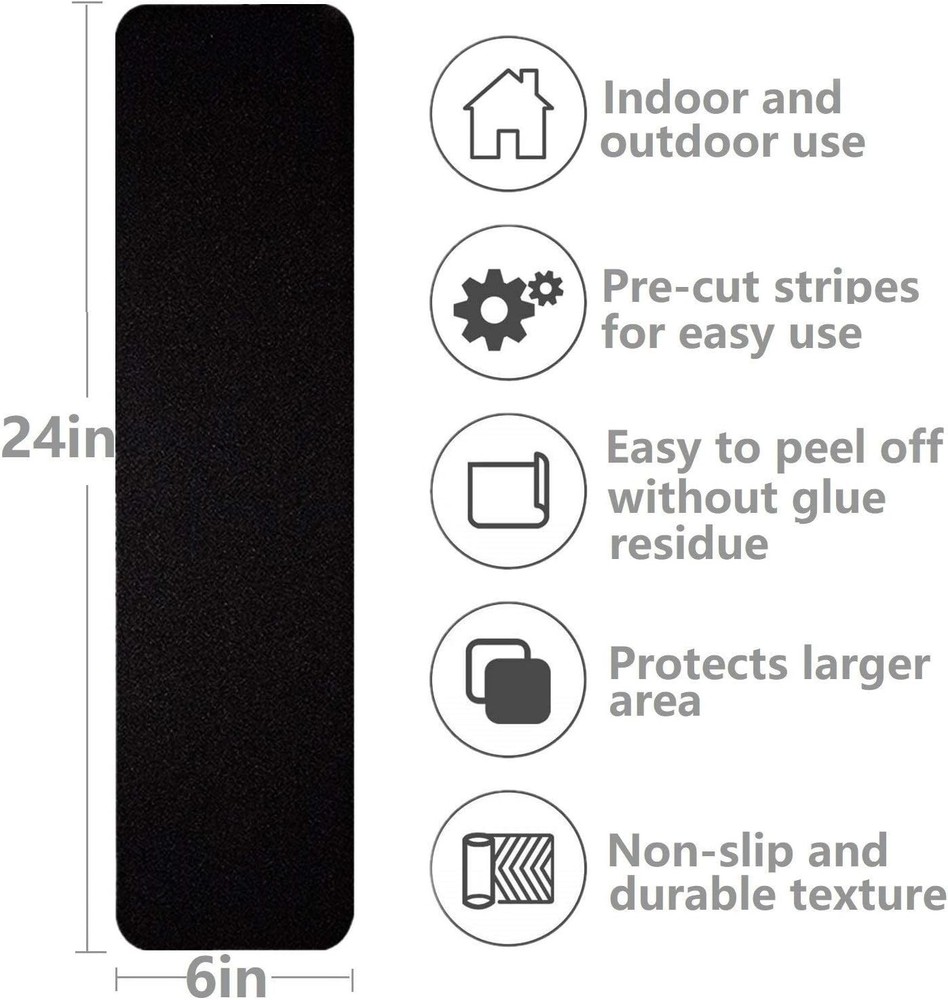 3 Pack Large 6 Inch x 24 Inch Non Slip Stair Treads Black High Traction Adhesive Pre-Cut Safety Tape/Tread Prevents Slips and Falls Outdoor Product Details Manufacturer: Wild Tribe Item Weight: 6 ounces Package Dimensions: 6.14 x 2.52 x 1.85 inches Material: Wood Item Package Quantity: 1 Batteries Included?: No Batteries Required?: No 【PERFECT DESIGN】With our pre-cut 6x24 inch Black nonslip adhesive tape made for outside and indoor stairs,Tapes was specifically designed to grip any surface and hold it in place. 【LARGER】6 in. x 24 in. treads provide FAR MORE coverage than most safety tapes and 50% more coverage than 4 x 24 treads, leaving LESS unprotected surface area to slip on. 【GREAT DURABLE】These family-friendly rugs are easy to clean, It can be washed 20 times repeatedly without affecting skid resistance.making them perfect for high traffic and spill-prone areas including dining rooms, family rooms, hallways, foyers, playrooms, and children's bedrooms. 【EASY INSTALLATION】Just peel and stick to stairs, slate, stainless steel and more. You can arbitrarily cut out the size you want. If you want to relocate or remove it, it does not leave any residue. Non Slip Stair Treads Safety Slip Resistant for Kids, Elders, and DogsSUPERIOR SAFETY: Pre-cut 80-grit commercial grade non slip stair safety treads provide sure footing on smooth or slippery surfaces for people and pets. Can be used on stairs, steps, walkways and other flooring surfaces that require traction. VERSATILE: Durable water resistant adhesive treads can be used on smooth indoor and outdoor surfaces (concrete, stone, tile, marble). Can also be cut to size. Please make sure to apply to clean, smooth and dry surfaces that are not too porous or rough (brick, coarse cement). This will ensure optimal adhesion.✅WATERPROOF TAPE: High weatherability - perfect floor protection from slippery conditions due to rain, snow and ice. ✅INSIDE OUTSIDE: Non-slip tape for stairs, steps, parking lots, kitchens, sidewalks, slopes, and more. ✅PRE-CUT STRIPS: 3 pack strips of adhesive commercial grade: 80 Grit providing superior grip. ✅REDUCE SLIPS: Helping to improve walking stability on interior and exterior surfaces such as stairs, RV steps, boats, docks, ladders and more. ✅CERTIFIED SAFETY: National Flooring Safety Institute (NFSI) certified for High Traction.