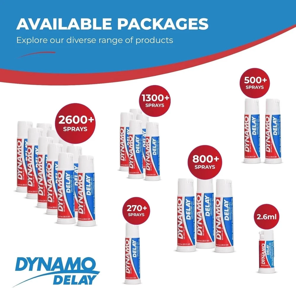 3 Pack Long Lasting Pleasure Enhancer Spray For Men Last Longer in Bed Delay Product description DESENSITIZING DELAY SPRAY FOR MEN: Dynamo Delay is a male genital desensitizer that helps temporarily prolong the time until ejaculation. Our metered dose spray reduces oversensitivity in advance of intercourse, helping you stay in the moment longer. NDC 69664-001-01. FAST-ACTING METERED DOSE: Apply 3 or more sprays, not to exceed 10, to the head and shaft of penis before intercourse. Allow 5-10 minutes for absorption, then wipe any excess before contact. Our precision pump delivers a consistent, controlled amount with every spray — no mess, no guesswork. NON-IRRITATING FORMULA: Formulated with Lidocaine USP as a topical anesthetic for temporary male genital desensitization. Our Drug Facts-labeled OTC formula meets U.S. Pharmacopeia standards for purity and safety. See Drug Facts panel on product packaging for complete warnings and directions. MORE SPRAYS, BETTER VALUE: Each 0.75 fl oz (22.2 ml) bottle delivers over 270 metered sprays — that’s more than 13x the sprays of leading 2.6 ml competitors. This 3-pack provides 810+ sprays at our best per-spray value. DISCREET AND TRAVEL-FRIENDLY: Compact bottle fits in your pocket, nightstand, or travel bag. Made in the USA. Wash product off after intercourse. If you or your partner experience irritation such as burning or itching, discontinue use.