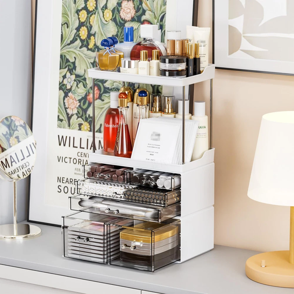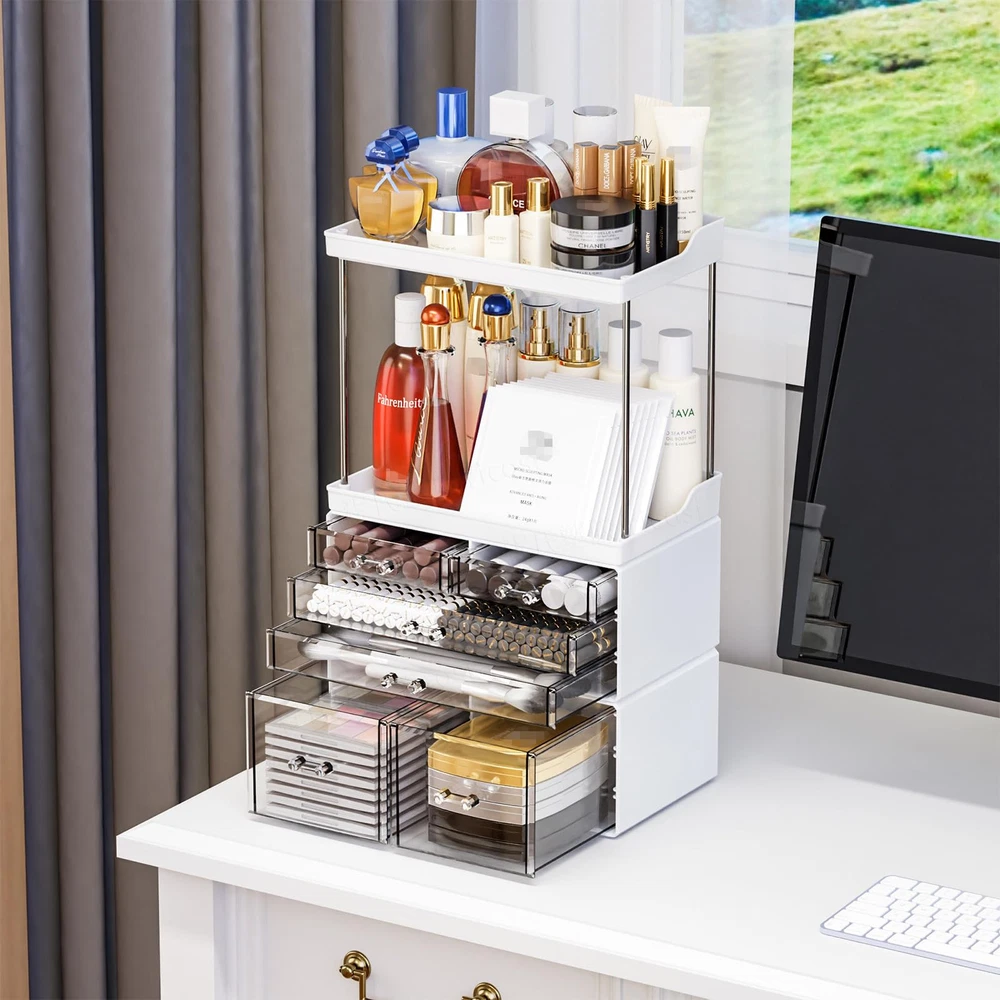 【3-Pack, 6-Drawer Large Capacity】Size 11.1"L x 6.6"W x 19.1"H,This bathroom storage counter is divided into 3 separate sections,The drawers can be stacked for use, and the top can serve as the Vanity Tray,The internal height of 8.4 inches is suitable for almost all beauty product bottles 【Versatile Storage for Any Space】The bathroom counter organizer has a stackable and detachable design, meeting diverse storage needs. Whether placed on a vanity, desk, or Bedroom bathroom sink countertop, it maximizes space utilization and creates a tidy and orderly environment. 【Large Capacity Skincare Organizer】Designed with 6 drawers, this vanity organizer can hold an extensive array of beauty essentials, including Makeup Palettes, Eye Shadows, Jewelry,Face Product, Skin Care Products, Cosmetics,Hair Product,Perfume,Skin Care Products, Cosmetics, and makeup skincare organizer 【Multi purpose storage】to flexibly fit into your dresser,Bathroom,Bedroom,living room,or wherever you fancy, catering to your multipurpose storage needs,as a skincare stand,vanity shelf,face product organizer,counter top makeup organizers,makeup shelf organizer 【Easy Installation and Cleaning】 This countertop makeup organizer is robust without feeling clunky, crafted with sturdy acrylic material and metal tubes. Assembly is the laziest no-brainer – no tools required. Just insert the tubes, and that's all it takes,it's easy to wash and won't play host to stubborn lotion and cream stains 【Perfect Gift to Every Your Life】You're beautiful as you are. Beauty isn't something to seek - It lies within. So is this bedroom dresser organizers - transparency and White mix to redefine sophistication and luxury, where every glance is met with awe, and every touch resonates with the poetry of opulence