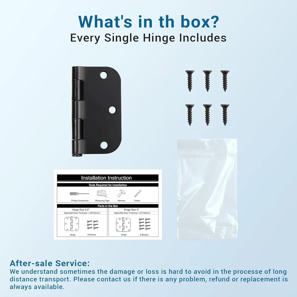 Store New Arrivals Add to Favorite View Feedback Contact 3 Pack Matte Black Door Hinges 3.5" X 3.5" Heavy Duty Door Hinge with Black Finish, Interior Door Hinges, 5/8" Radius Corners Description Unit Count 3 Count Hole Count 3 Mounting Type Door Mount Material Metal Material Type Metal Finish Types Painted Finish Type Painted Product Dimensions 3"L x 2"W Item Dimensions L x W 3"L x 2"W Size 3 Pack DURABLE & STABLE: Thanks to KNOBWELL own factory and QC department, our matte black door hinges are long-lasting and rust-proof with smooth and convenient daily use, absolutely distinguished addition to any home. QUICK & EASY INSTALL: Install your hinges in a flash. These hinges are easy to install, all you need is a screwdriver and you can easily install it in minutes! SPECIFICATIONS: Size: 3-1/2 inch X 3-1/2 inch; Corners: 5/8 inch Radius; Finish: Black; Material: High-Grade Quality Metal, solid and thick. Our interior black door hinges can be rotated 270 degree without making noise, suitable for bedroom, bathroom, guestroom, office and any place where quietness is needed. APPLICATIONS: These round door hinges 3.5 in could be mounted on interior doors like cabinet, dresser drawer, wardrobe wooden door, shed windows, shed hardware, shutters, skylights, vents, flower boxes, etc. for all kinds of outdoor buildings such as sheds, playhouses, animal shelters and more. QUALITY PACKAGING: Each hinge is individually packaged, 6 mounting screws and detailed installation instruction are also included. Believe in KNOBWELL and we will offer you 100% satisfaction. Product Description KNOBWELL door hinges are proof-positive that fashion and function can peacefully and beautifully co-exist. From timeless elegance to striking modernity, our door hinges fit and accentuate virtually any decor. Naturally, they're also designed, crafted and tested to ensure durability. Our Premium Quality door hinge is an ideal decorative accessory, professionally designed to perfectly compliment a wide range of contemporary and modern residential and commercial interior doors. KNOBWELL Matte Black Door Hinges Outstanding door hinges that made of premium quality metal, used for a long life span; Functional hardware solution that fit well with most popular decorative hardware collections; Could be mounted on shed windows, shed hardware, shutters, skylights, vents, flower boxes, etc. for all kinds of outdoor buildings such as sheds, playhouses, animal shelters and more. Multiple options of packs that you can choose from according to your needs. (1 pack means 1 individual hinge) Easy Installation Include all the hardware accessories you need, making it an ideal solution for kitchen and vanity installations. Product Specification Finish: Matte Black Material: Cold Rolled Steel Dimension: 3-1/2 x 3-1/2 Inch Corners: 5/8 Inch Radius Water Proof & Anti Rust Premier Quality Smooth & Durable Construction Reliable Strength Easy Installation Quiet & Beautiful ABOUT US We offer the best prices around on high quality products. Our E-store includes media such as books, movies, music and games while offering electronics, toys, sporting apparel, clothing, tools, general home, garden items and more. SHIPPING We are always working hard to ensure your package arrives as soon as possible. Please understand that some factors like weather, high postal traffic, and the performance of shipping companies are outside of our control. We offer free shipping to the lower 48 states and ship within 2 business days of payment, usually sooner. We do not accept P.O. Boxes. Please provide a physical address. For shipping outside of the continental USA, we only use eBay's Global Shipping Program.The item is shipped to KY and then sent to the rest of the world. International customers are responsible for all duties and taxes. Continue to check out in order to calculate costs for shipping the item to your country. Messages regarding eBay's Global Shipping Program MUST be directed at eBay EXCLUSIVELY. RETURNS We offer a 30-Day Return Policy on items which you are not completely satisfied with. You have the option for a full-refund or an exchange of the item. No returns are available on items shipped outside of the USA. PAYMENT We accept PayPal. CONTACT US This page content is yet to come Please ad us to your favorite seller and visit again later Thank You CUSTOMER SATISFACTION We try our very best to make sure every customer is completely satisfied. If there's a problem, message us! We're happy to help. WE ACCEPT Copyright © 2021 AutoDS. | All Rights Reserved