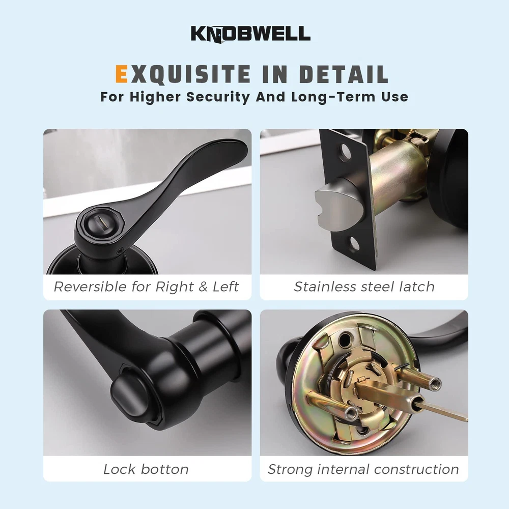 EASY INSTALLATION: Install your lockset in 10 mins. We now provide 3 long screws(1 with short screws and 2 are with bolts inside), no worry about missing parts. With the help of the detailed installation file, our children can make it. PRIVACY FUNCTION(LOCK WITH NO KEY): The black door knob can be locked inside with Thumb Turn and opened outside in emergency(with flat-tip tools like coin or screwdriver). Use it for your guest room, bedroom, bathroom, interior locking door and other place where privacy needs; made of premier Zinc Alloy, together with the long-lasting Matte Black finish, this door handle will enhance the look and feeling of our home ONE SIZE FITS MOST: This black door handle fits 1-3/8" to 1-3/4"(35mm to 45mm) doors with adjustable latch 2-3/8" or 2-3/4"(60mm or 70mm); Rosette Diameter: 2-3/5"(65mm); Lever Length: 4-7/10"(120mm); Reversible for both left handed and right handed doors. (Notice: The latch plate is unremovable.) QUALITY IS BUILT IN: Strong internal structure, smooth door lever edge, and advanced paint technology, the black interior door handle is not only comfortable to use for all people, but also last long enough under different condition(passed 72h salt spray test); exceeds 250,000 cycles, the door latch is thick enough and will not be easily bent out of shape after years of use 365 DAYS GUARANTEE: stands behind our products. High-quality door hardware is not only your persuit, but also our top priority. Your shared experience/feedback is welcome. We offer 1 year trial. If there is any problem or worry, please feel free to let us know.