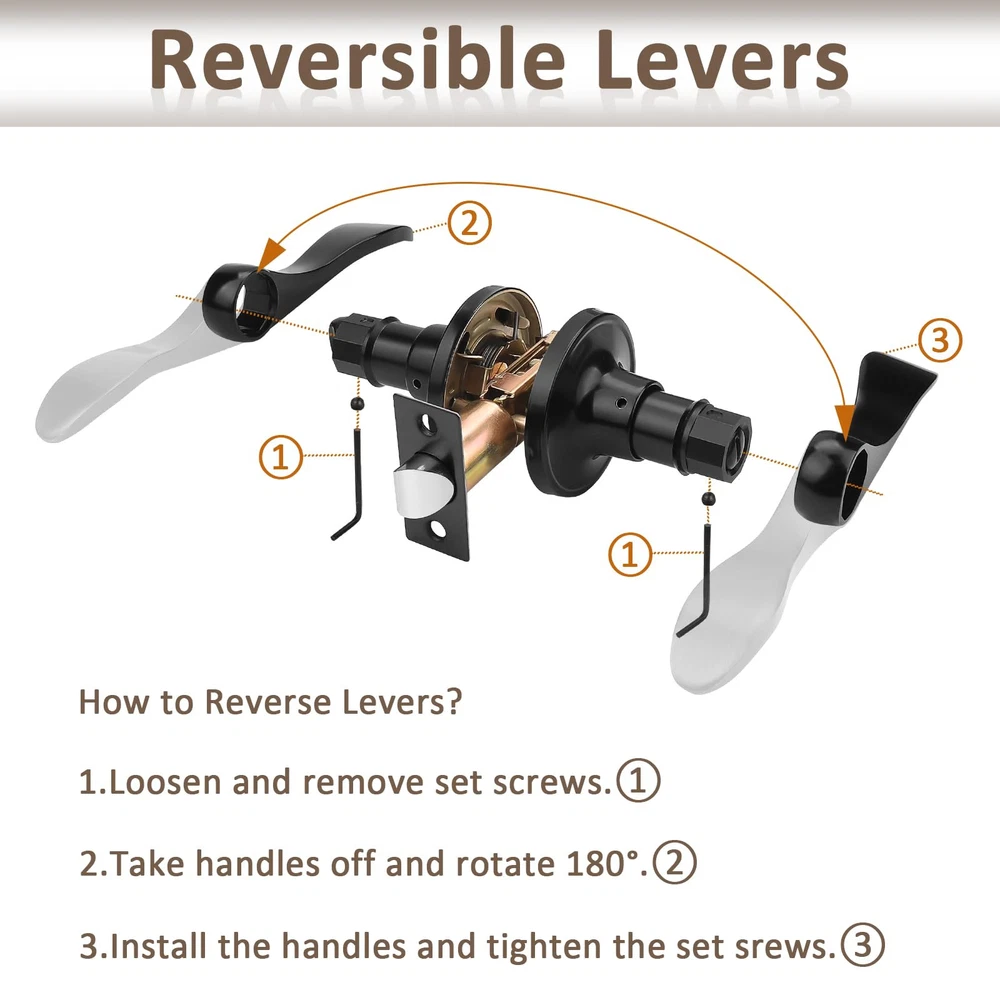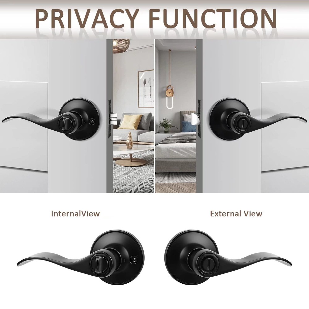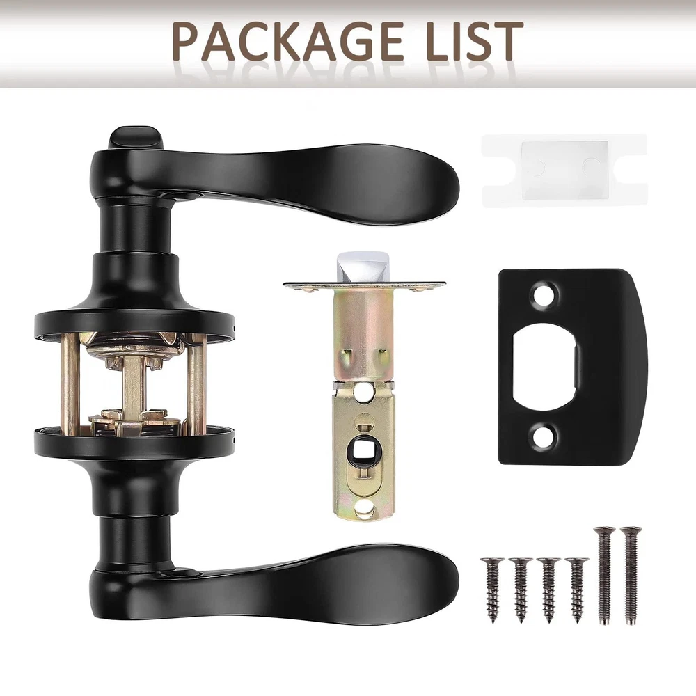 Easy intallation: the upper and lower screw holes of the door lock, including all accessories.The easy installation makes for a one-person project. Includes reversible door handles, ideal for installing left-hand or right-hand doors. LOCKING DOOR LEVERS, FOR BATHROOM & BEDROOM,Function:The privacy Lever is ideal for bathrooms, bedrooms, and any room where privacy is needed. Privacy locks can be locked using a push or turn button from inside of a room, and typically feature an emergency release mechanism on the outside. Product Specifications: Suitable for door thickness 35mm to 45mm (1.38in to 1.78in). Adjustable latches: 60mm to 70mm (2.4in to 2.8in) Material: Zinc Alloy; Black finish; modern wave style levers.Package Includes: Selected Knobs, Mounting Screws, Installation Instructions. Please check these parts before install. Quality and Durability: Easy and simple fitting helping to save you time. Conformed with ANSI Grade 3 Exceeds 250,000 cyles and 5 pins brass tumbler cylinder. Solid Column security bolt for anti-sawing protection.