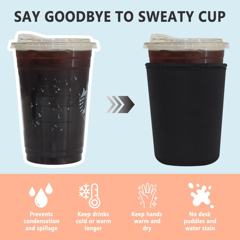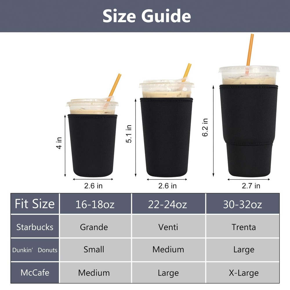 3 Pack Reusable Iced Coffee Sleeves - Xumbtvs Small, Medium, Large, Black Description Features: STOPS CONDENSATION AND SPILLS: The iced coffee cup sleeve is made of 4mm thick High-density neoprene, which can absorb the condensation water on the cup, keep your hands warm, and enjoy your iced beverage, no more freezing hands in the winter. No more wet, slippery hands and desk puddles. GOOD STRETCHES: Our drink sleeves stretches to fit a variety of iced coffee drinks, for Grande, Venti and Trenta sizes. Can fit other popular brands, water bottles, and tumblers. REUSABLE USE: LOVAC insulated sleeves can replace throw-away paper cup sleeves or napkins and can be reused. Just throw it in the washer or rinse in the sink for an easy clean. THREE SIZE: Multi-size pack includes 1 Small fits 16-18 oz, 1 Medium fits 22-24oz and 1 Large fits 32 oz. Meet all your requirements. KEEPS DRINKS COLD: High-density neoprene keeps your drink cold longer. Take it with you on the way to the office. Enjoy your favorite beverage on the go. Product Details: Handling We will ship all orders within 1 business day of payment. Delivery We Do Not Ship Outside of the Continental US. Return Policy All items qualify for returns within 30 days of receipt. Buyer is responsible for return shipping on any item that is not damaged. Feedback We take our reputation seriously, we buy and sell online, so we understand the value of trust. If you are unsatisfied with your order, please contact us and we will work with you to resolve it to your satisfaction.