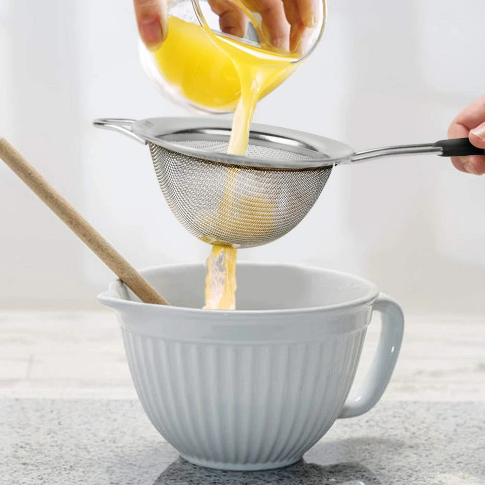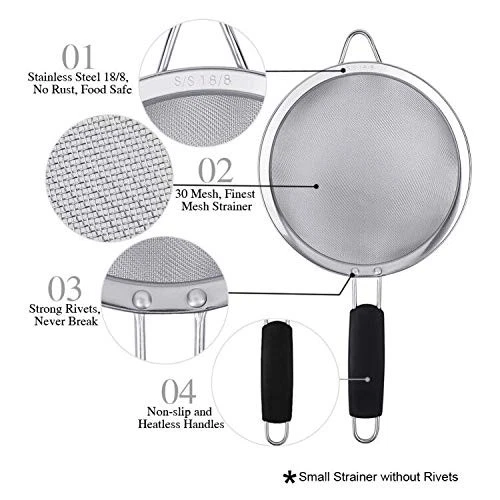 Is your current food strainer rusty? Our fantastic strainer set is made of first class stainless steel 18/8, BPA free, Lead and Cadmium free. It won’t rust, bend, or break! Are your current food strainer's handles come off easily? Are the handles hot when you handle the hot pasta or noodles? We studied a lot. We improved our strainer handles with rivet and plastic. Our premium handles are riveted to the bowl so it will never come off! You'll never have to worry about handles coming off or a freak accident due to excessive weight contents in the strainer while holding it. The soft, non-slip elevated handles provide a firm comfortable grip. The plastic construction allows you to handle even the hottest pasta or noodles without a hassle. Food Grade Stainless Steel 18/8 Construction: Our mesh strainer is made of first class Stainless Steel 18/8 that is BPA free, Lead and Cadmium free. It is rust free and will never affect the taste of your food! Riveted and Heat Resistant Handles: Our premium handles are riveted to the bowl so it will never come off! The soft, non-slip elevated handles provide a firm comfortable grip. The plastic construction allows you to handle even the hottest pasta or noodles without a hassle. 30 Mesh Extra Fine Strainer: Our extra fine sieve is 30 mesh and two layers of tightly woven. It is great for filtering fine grains like quinoa, flour, rice and sugar. 3 Different Sizes Strainers Set: Our food sifter set includes 3 3/8", 5 1/2", and 7 7/8" strainer sizes, which are the most popular and preferred sizes needed to handle all your straining, sieving, sifting, filtering and rinsing tasks. Nest the strainers together for space saving storage or hang them together within reach of where you use them the most. : We are so confident in the quality of our mesh strainer that we offer you a . Reach out to us if there’s ever anything you need; we are dedicated to your satisfaction.