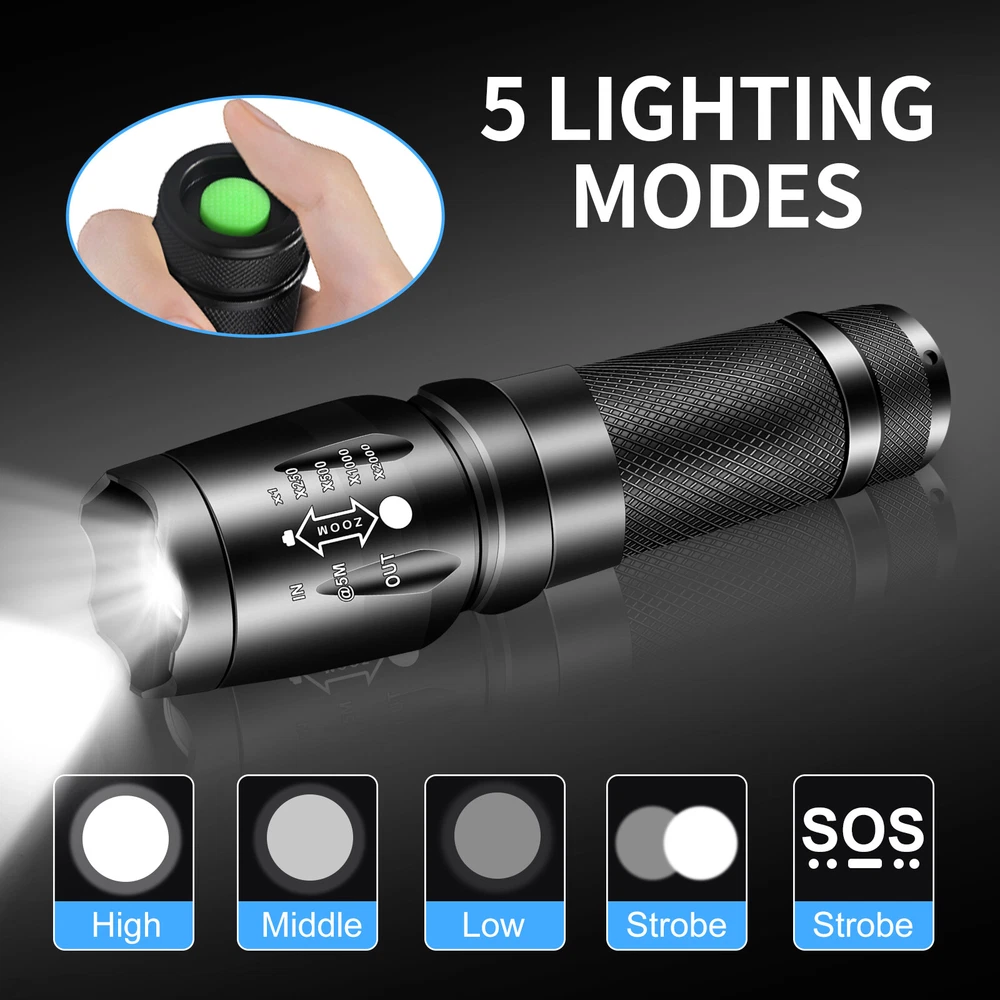 3 Pack Super Bright LED Flashlight Small Portable Working Torch Waterproof Zoom Description: 1. [SUPER BRIGHT WITH 5 MODES] The small flashlight LED uses advanced LED beads, it can easily light up an entire room! Adjustable/zoomable focus with 5 modes: High- Medium- Low- Strobe- SOS (for Emergency). 2. [WATERPROOF] LED mini small flashlight torch can be used in any weather. The aluminum alloy body has no rust issue. 3. [PREMIUM QUALITY & LONG-LASTING] Our LED flashlight is made of high quality aluminum alloy, this super bright LED Flashlight is solid and sturdy, the edge designed is sharp and strong, can easily break the windows. 4. [MULTIFUNCTIONAL USES] Anti-abrasive, skid proof, compact design makes it the top pocket small LED flashlight for tactical situations, outdoor activities, camping, hiking, hunting, fishing, home use, military and as a powerful emergency light. Taclight is small enough to fit in your pocket, handbag, or car compartment, so you can take it with you wherever, whenever. 5. [Power Source] The LED flashlights working torch is powered by rechargeable battery 3.7v battery(18*65*O/26650 not included ) or 3X AAA battery(not included). Specification: Product Name: Super Bright LED flashlight Bulb: Super Bright LED Material: Aluminum Alloy Power Source : 1 * 26650/1*18*65*O/3 * AAA (All batteries are not included) Color: black Function: High/Medium/Low/Strobe/SOS Package includes: (without battery) 3x Super Bright LED Flashlight Small 3x Battery Tube 3x AAA Battery Holder On Dec 28, 2024 at 10:40:54 PST, seller added the following information: