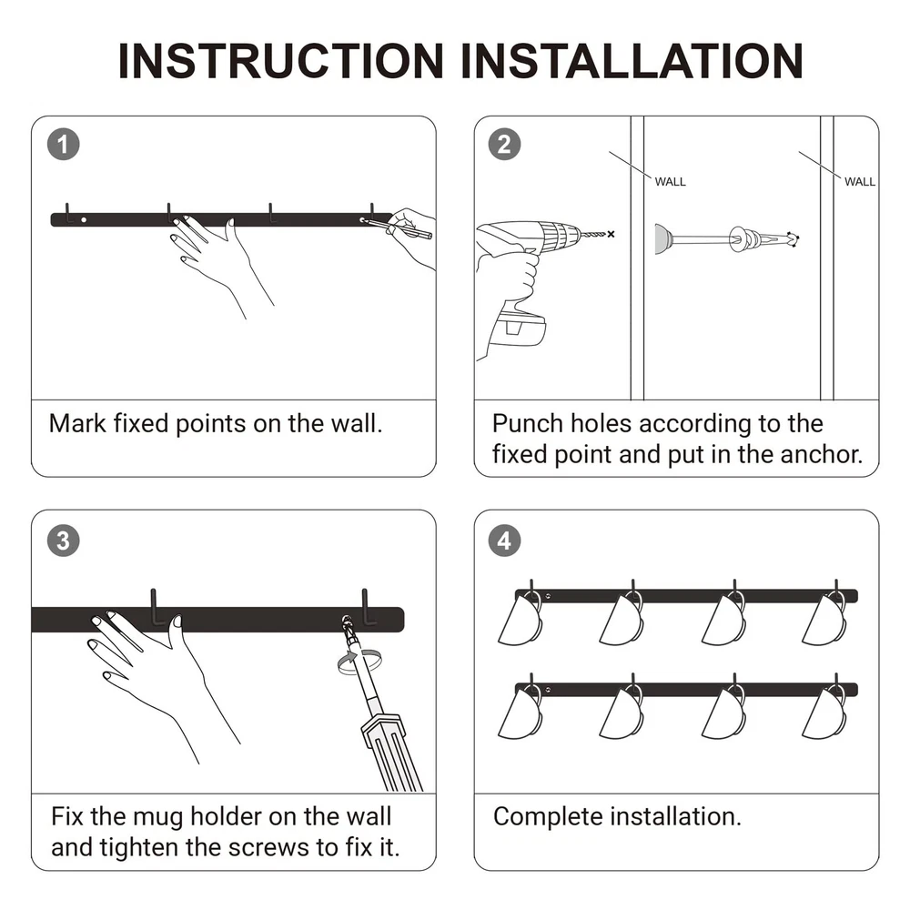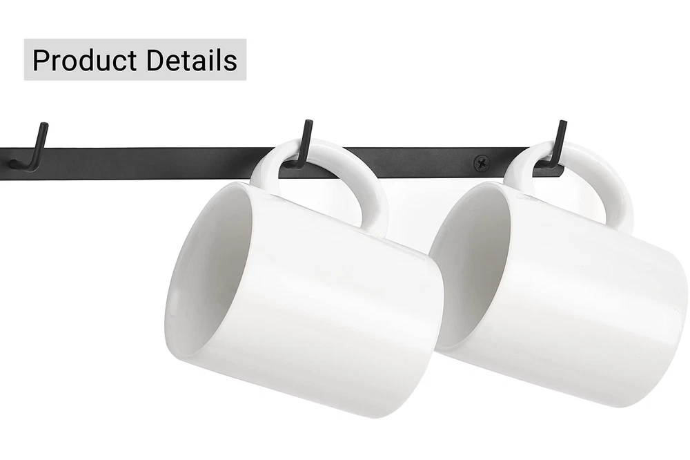Weight: 0.95 Pounds Model: Does not apply Item Weight: 3 Pack Wall Mounted Metal Coffee Mug Holder Rack w/ 12 Hooks Department: for Kitchen Dining Room Coffee Bar MPN: Does not apply Formulation: 3 Pack Wall Mounted Metal Coffee Mug Holder Rack w/ 12 Hooks Item Width: 3 Pack Wall Mounted Metal Coffee Mug Holder Rack w/ 12 Hooks Item Height: 3 Pack Wall Mounted Metal Coffee Mug Holder Rack w/ 12 Hooks gtin13: Does not apply Expiration Day: Depends from lot Item Length: 3 Pack Wall Mounted Metal Coffee Mug Holder Rack w/ 12 Hooks UPC: Does not apply Brand: Mug Holder Item Condition: New Material: Metal Type: 3 Pack Wall Mounted Metal Coffee Mug Holder Rack w/ 12 Hooks Color: Black Package Dimensions LxWxH: 16.93x2.36x2.05 Inches