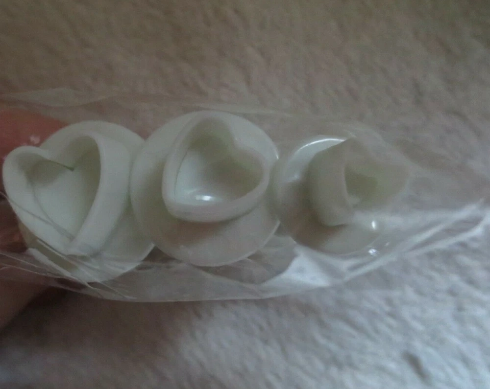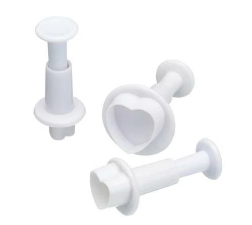 3 pcs Heart Plunger Brand New Perfect for Making Cake Decorating Leaves Work with fondant Gumpaste Large Medium Small size Come in a plastic Bag Color white Features: Sizes: 1cm, 1.5cm and 2cm Cut out and then press the button down to push the icing or dough out of the little cutters. Ideal for use with sugarpaste, rolled fondant, royal icing, gum paste, marzipan and clay. Material: Food safe plastic Note: Hand wash only. Spring should be removed before washing. To use simply roll out paste/icing, press cutter into paste/icing and then release. es View more great items Track Page Views With Auctiva's FREE Counter