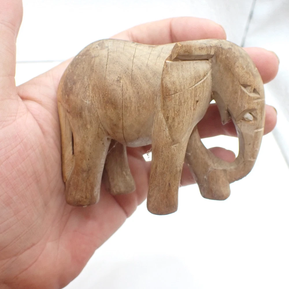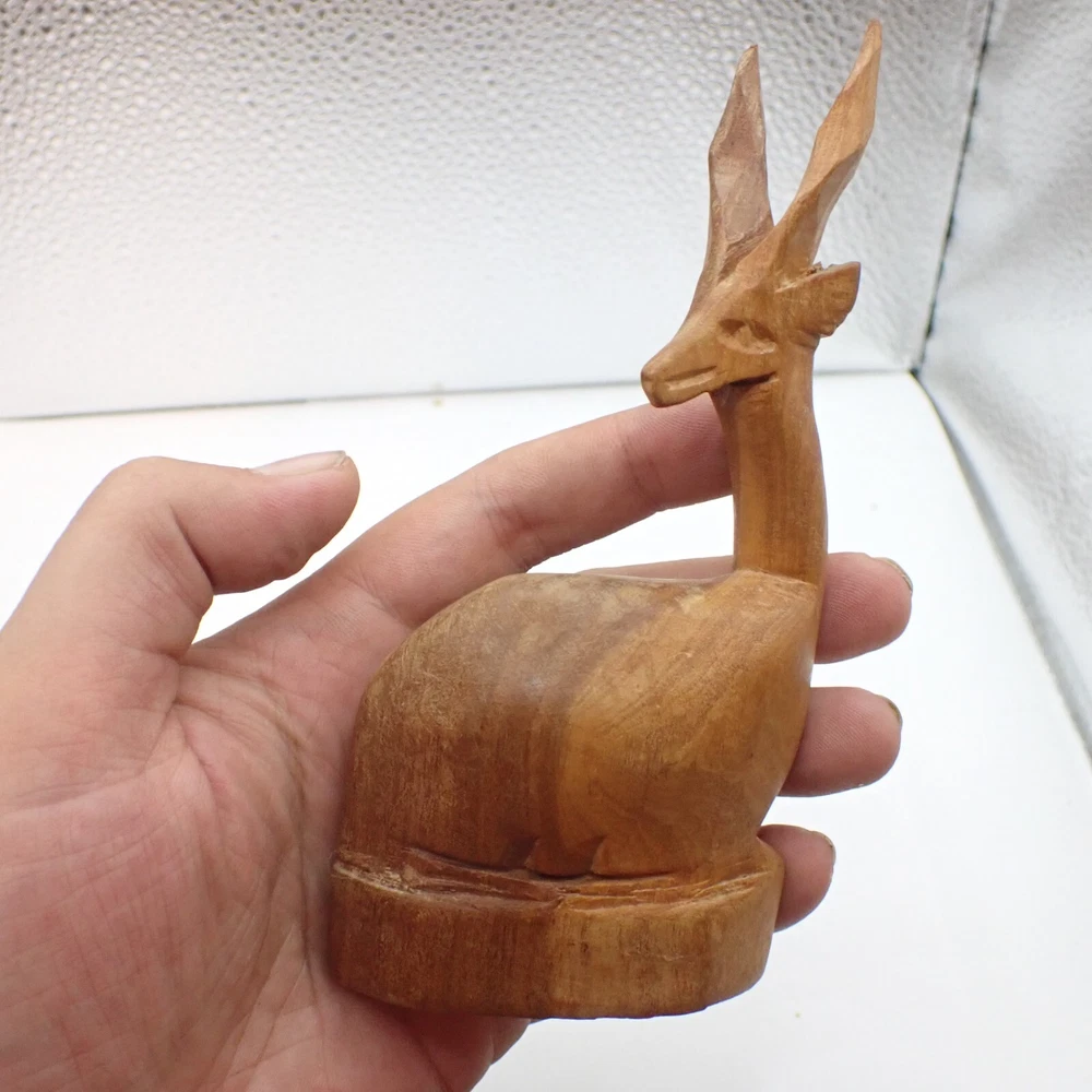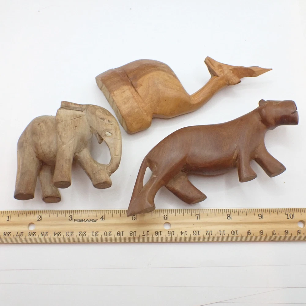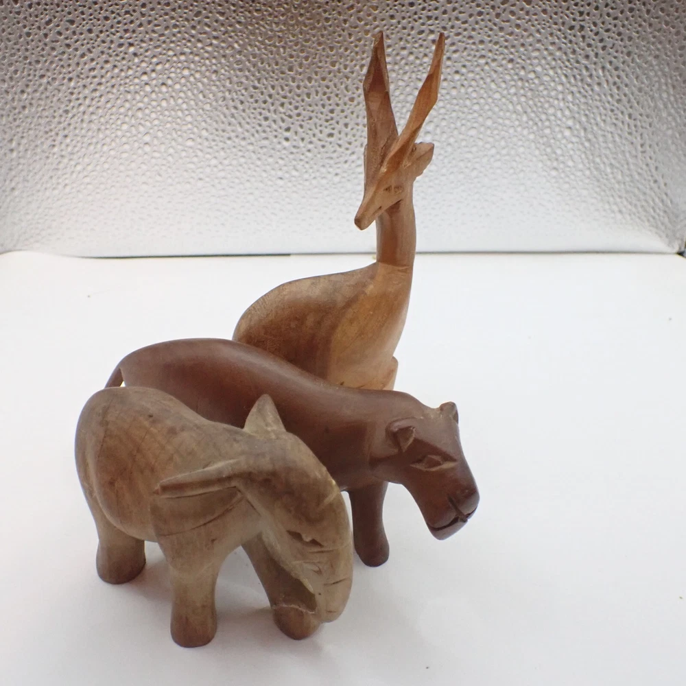 Make: African Material: wood Size: varies a bit; the lioness is 6 inches long & the gazelle is 5.5 inches tall # of pieces: 3 This is a lovely and unique lot of small hand carved and hand crafted African animal carvings. These pieces are overall in good condition with just a bit of dust, discoloration, and just some minimal wear. It looks like the elephant used to have tusks but they broke off. Don't miss this lovely collection which displays beautifully. Please see our other MANSA BEADS listings for a wide variety of authentic TRIBAL BEADS as well as a range of other unique items from around the globe!