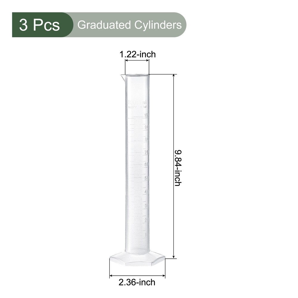 Document MULTIPURPOSE - Our graduated cylinders are great for lab, class, experiment, and daily use, suitable for teachers, technicians, etc.WHAT YOU GET - The package comes with 3pcs 100ml graduated cylinders, in size of 31 x 250 mm / 1.22 x 9.84 inch, [Tube diameter x total height].The base size is 70 x 60 mm / 2.76 x 2.36 inch.The tolerance is ±1ml at 20℃.RELIABLE MATERIAL - This graduated cylinder is made of clear plastic, which is durable and reusable.SPECIAL DESIGNED - Hexagonal base keep the cylinder tube firm and steady.Clear scale on the tube body, for a precise measurement. And the scale will not be faded.Round edge and a tapered pour spout, benefit for filling and pouring, easy to see and use.KINDLY NOTE - This product cannot be used as a reaction container. Please avoid heating, concentrated acids or bases while using it. 3 Pcs Measuring Graduated Cylinders,for Chemical Measuring,(Clear White, 100ml) MULTIPURPOSE - Our graduated cylinders are great for lab, class, experiment, and daily use, suitable for teachers, technicians, etc. WHAT YOU GET - The package comes with 3pcs 100ml graduated cylinders, in size of 31 x 250 mm / 1.22 x 9.84 inch, [Tube diameter x total height]. The base size is 70 x 60 mm / 2.76 x 2.36 inch. The tolerance is ±1ml at 20℃. RELIABLE MATERIAL - This graduated cylinder is made of clear plastic, which is durable and reusable. SPECIAL DESIGNED - Hexagonal base keep the cylinder tube firm and steady. Clear scale on the tube body, for a precise measurement. And the scale will not be faded. Round edge and a tapered pour spout, benefit for filling and pouring, easy to see and use. KINDLY NOTE - This product cannot be used as a reaction container. Please avoid heating, concentrated acids or bases while using it. Hot Item Payment 1.We accept eBay payment . 2.Payment must be received within 7 business days of auction closing. Shipping 1.We ship to your eBay or Paypal address. Please make sure your eBay and Paypal address is correct before you pay. 2.Items will be shipped within 1-3 business day when we received payment. 3.Delivery time depends on destination and other factors. Description Policy 3 Pcs Measuring Graduated Cylinders,for Chemical Measuring,(Clear White, 100ml) MULTIPURPOSE - Our graduated cylinders are great for lab, class, experiment, and daily use, suitable for teachers, technicians, etc. WHAT YOU GET - The package comes with 3pcs 100ml graduated cylinders, in size of 31 x 250 mm / 1.22 x 9.84 inch, [Tube diameter x total height]. The base size is 70 x 60 mm / 2.76 x 2.36 inch. The tolerance is ±1ml at 20℃. RELIABLE MATERIAL - This graduated cylinder is made of clear plastic, which is durable and reusable. SPECIAL DESIGNED - Hexagonal base keep the cylinder tube firm and steady. Clear scale on the tube body, for a precise measurement. And the scale will not be faded. Round edge and a tapered pour spout, benefit for filling and pouring, easy to see and use. KINDLY NOTE - This product cannot be used as a reaction container. Please avoid heating, concentrated acids or bases while using it. Hot Item Payment 1.We accept eBay payment . 2.Payment must be received within 7 business days of auction closing. Shipping 1.We ship to your eBay or Paypal address. Please make sure your eBay and Paypal address is correct before you pay. 2.Items will be shipped within 1-3 business day when we received payment. 3.Delivery time depends on destination and other factors.