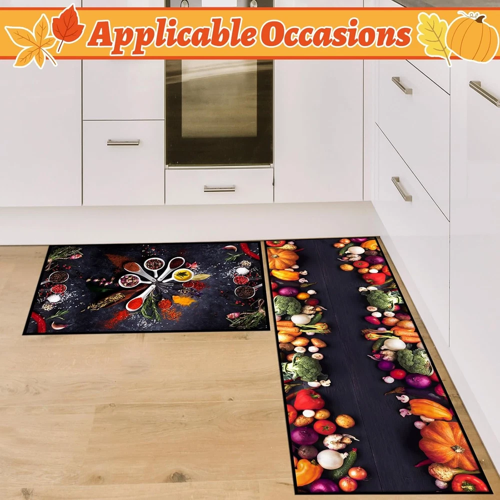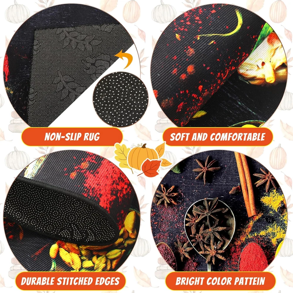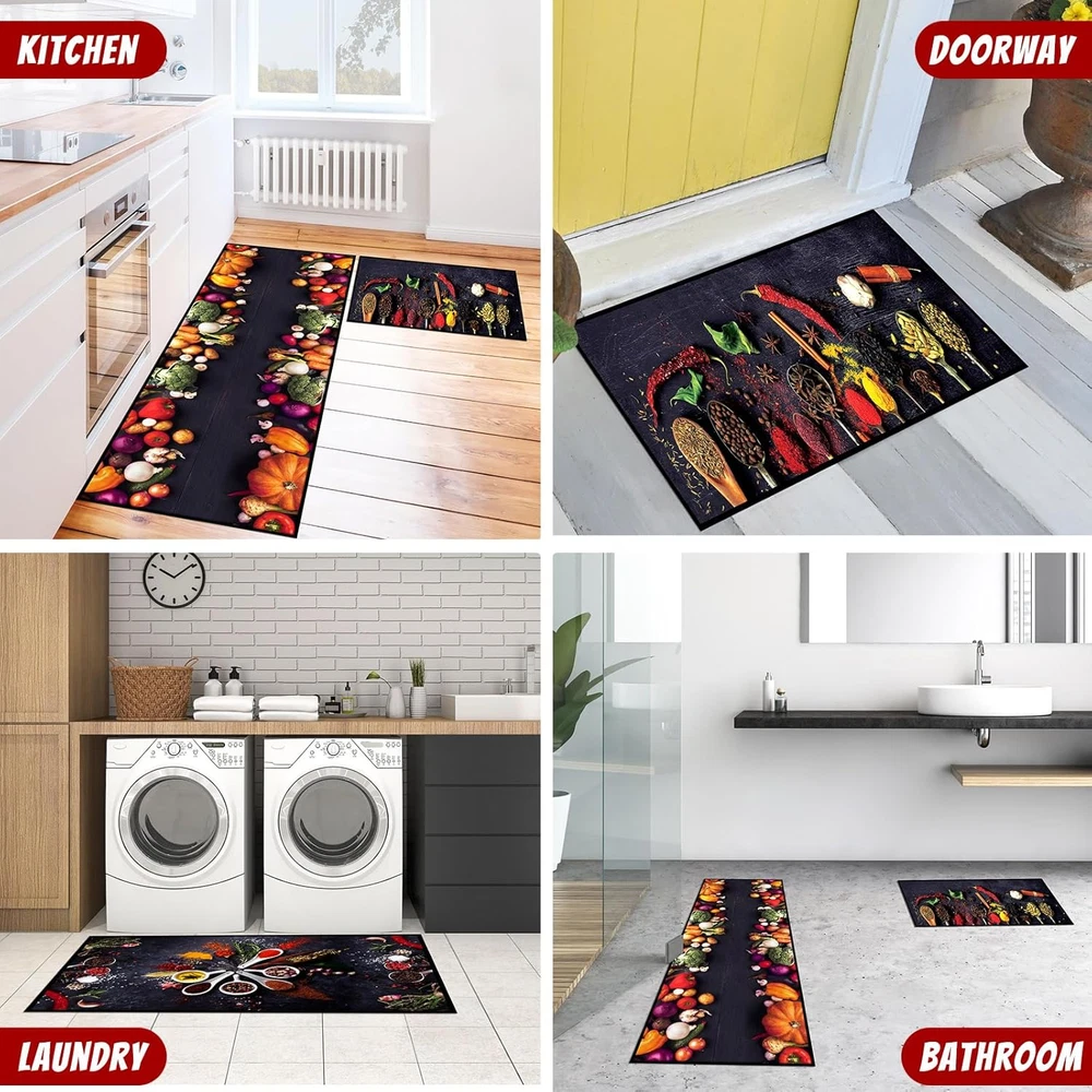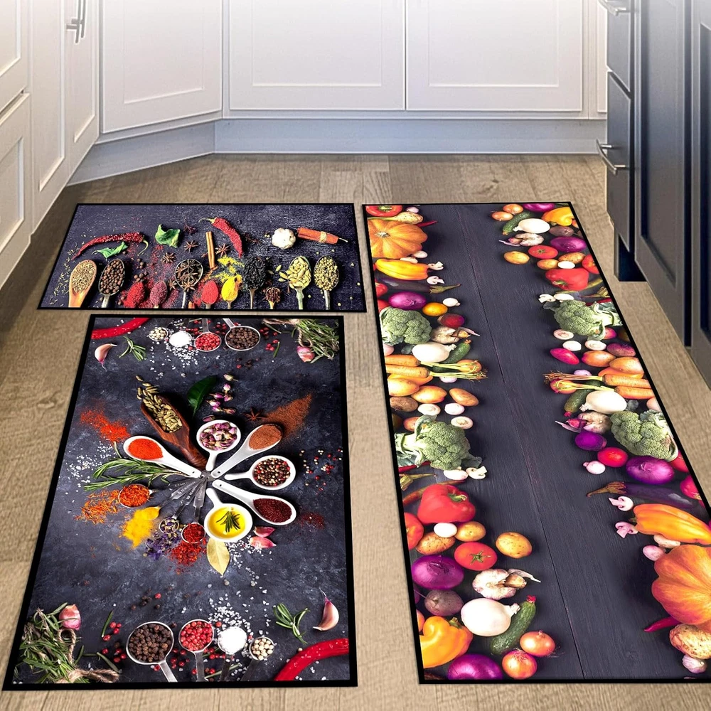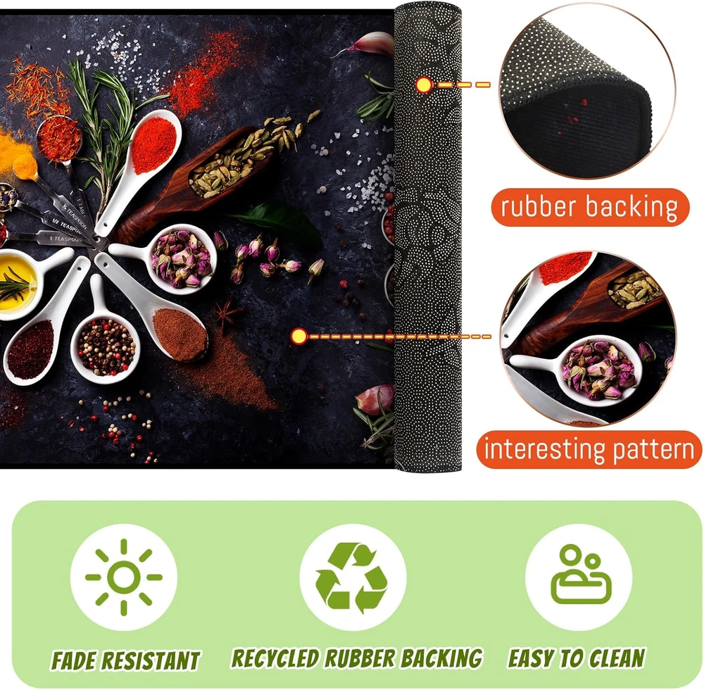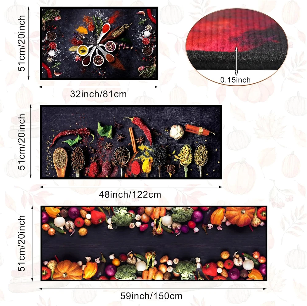 Enhance Comfort and Add Vibrancy to Your Kitchen: kitchen cushion mats for standing are designed with spice cooking themed patterns, which can provide anti fatigue support while adding color to your kitchen, making your time spent in the kitchen more comfortable and enjoyable Proper Size Information: these kitchen floor mats are available in 3 sizes of about 20 x 32 inches/ 51 x 81 cm, 20 x 48 inches/ 51 x 122 cm and 20 x 59 inches/ 51 x 150 cm, which fit your kitchen layout; Whether you have a compact kitchen or a spacious one, these mats will blend in while offering the needed cushioning and support Reliable and Easy to Maintain: crafted from quality crystal fleece, the non slip kitchen mat is with good water absorption, can well absorb the water spilled from the kitchen to the ground, and can be dried quickly, which can be washed by machine, easy to clean and maintain, making it hassle free for everyday use in a busy kitchen environment Enhanced Safety for Your Kitchen: these kitchen rugs and mats non skid washable are designed with textured back patterns, which are non slip, providing enhanced safety and stability in your kitchen; You can confidently move around your cooking space without worrying about slipping or sliding Versatile Mats for Various Spaces: these anti fatigue mats for kitchen floor are for kitchen use, their versatility extends to various spaces; Whether you want to place them in front of your sink, stove, or even in your laundry room, they are the ideal choice for places where you need comfort, support, and a touch of color Features: Washable kitchen rugs are designed to provide practicality and convenience in your daily routine. With their easy to clean material, you can simply wipe off spills and stains, or even toss them in the washing machine for a thorough clean. Their low maintenance nature saves you time and effort. With its vibrant colors and practical functionality, the kitchen mat set makes for an ideal gift choice for housewarmings, birthdays, or other occasions. Show your loved ones that you care about their comfort and style. Specifications: Material: crystal fleece Color: as pictures shown Size: about 20 x 32 inches/ 51 x 81 cm, 20 x 48 inches/ 51 x 122 cm and 20 x 59 inches/ 51 x 150 cm Package includes: 3 x Colorful kitchen mats Notes: Manual measurement, please allow slight errors on size. The color may exist a slight difference due to different screen displays.