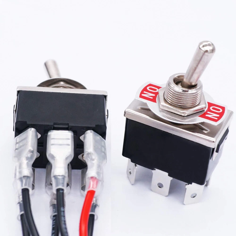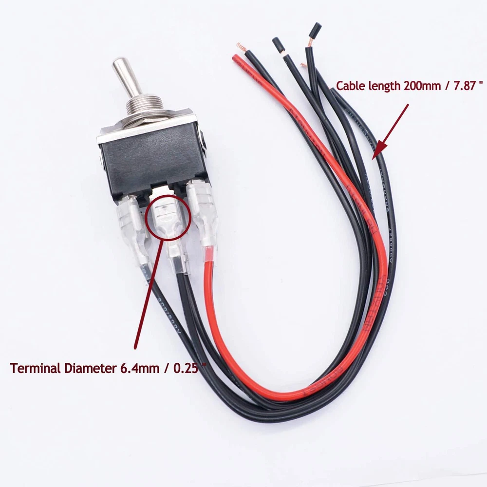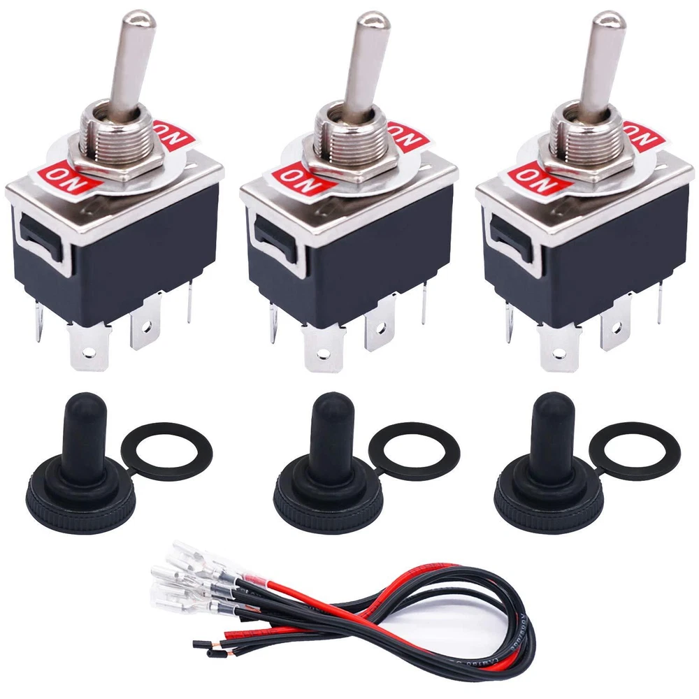 1.Toggle Switches. Versatile toggle switch family with multiple position configurations. Available in single or double pole. Perfect for industrial equipment or emergency lighting. 1⁄2-Inch mounting hole required. Specifications:16A, 250 V AC ; 75°C max. temp rating. 2.Made of high quality industrial material, ensuring long lasting durability. 3.Weather resistant rubber covers protect all toggle switches from moisture and dust. 4.The switch is flexible, you can toggle the handle manually for more than 50,000 cycles under normal use. 5.Widely applied to boat, yacht, vessels and other marine. 6.This product is of high quality. If you have any questions, please feel free to contact us. We will try our best to help you solve the problems. If there is any quality problem with the switch you received, please contact us in time to refund or resend it for you.Product Name: Toggle switch;Material: Plastic And Metal;Solid connection switch with waterproof rubber cap, more convenient to operate Connector type: DPDT 6 Pin 2 Position ON-ON ;Rated Voltage & Current :16(10)A 250V AC;The waterproof rubber cover can prevent all toggle switches from being affected with damp and dust when being applied to ships, yachts, boats and other marine Toggle Switch Total Size: 59mm x 32.7mm x 19.5mm/2.3"x1.28"x0.77"(L*W*H);Mounting hole diameter: φ12mm;Spade Terminal Diameter:6.4mm Toggle switches have connecting wires and are easy to install.Mechanical life: more than 50.000 cycles. Electrical life: more than 10, 000 cycles. Package Content: 3 x Rocker Toggle Switch + 3 x Waterproof Boot Cap + 18 x Connection line