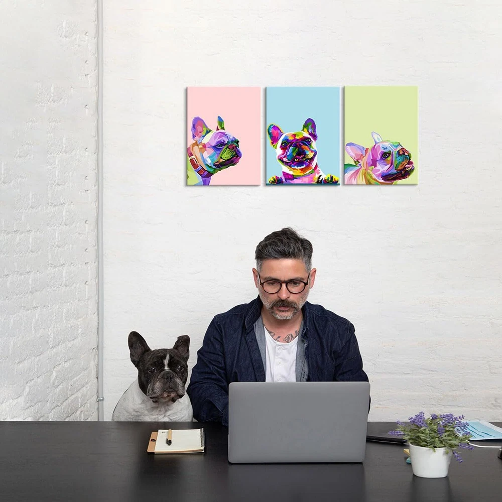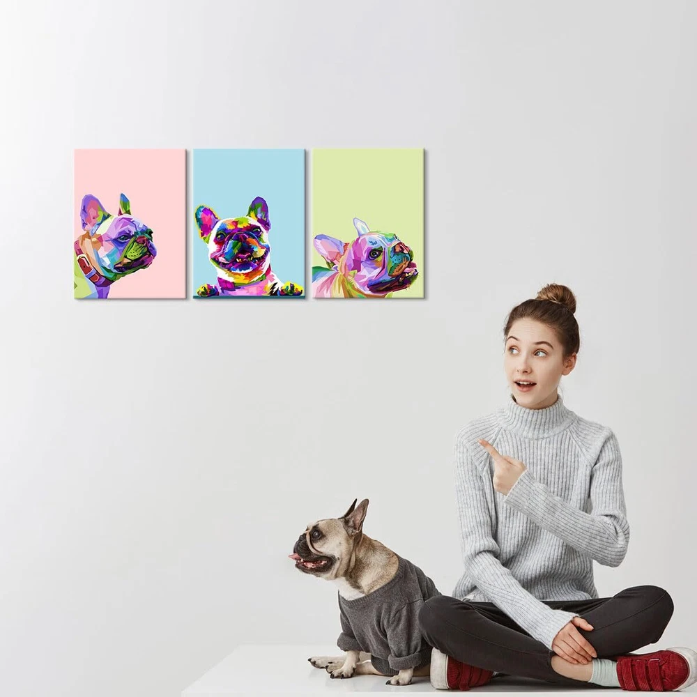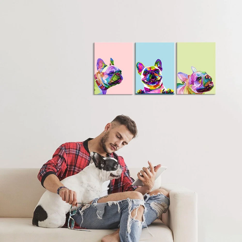 Why Choose Canvas Wall Paintings from Mistyefly? Advantage:Professional inks, fade resistant, high quality canvas, safety & environmentally, and HD prints will create a unique artwork for you;Our bedroom wall art is stretched on solid wood frame with a hook mounted on each panel, easy to be hung on walls;The side margins are also printed so that each painting forms a complete scene. Delivery and arrival time:After you submit your order, we will ship it by air within 3 days. Please let us know by email if you have urgent orders;In most cases, you will receive the canvas wall art you ordered within 2 weeks after delivery (except in special cases). Please ignore the error data "Delivery time is 14-28 days" from the system. Notes:We sincerely recommend you measure the size of the wall you want to use and be sure to choose a suitable size of the wall art before buying;Since it is a manual measurement, please allow slight size differences;Please be aware that the pictures shown are for reference only and do not represent the actual size of the canvas prints. About us:Mistyefly is an enterprise that specializes in designing and manufacturing diversified canvas wall paintings, the main styles include abstract, retro, modern, natural, traditional and so on. We uphold the tenet of customer first, and at the same time we promise that we will provide the best products and services to both new and old customers. Your satisfaction is our top priority. The dog art size: 12''Wx16''Hx3PCS. High quality material: 1.Environmental protection ink & High definition printing. 2.Waterproof and anti-UV features canvas. 3.With a black hook easy to hang. 4.Having the sturdy wooden frame. Not only does it meet the requirements of a healthy environment, but also it has a bright colors and vision. Packaging: The animal wall decor is mainly wrapped in OPP bag and box to ensure the safety of product and shipment during transportation. Nice decoration and gifts choice: 1.Dog Painting is suitable for various occasions, such as living room, bedroom, office, pet shop, hallway and so on. 2.Pet Wall Decor is a suitable gift for your family, relatives, friends, or teachers, and it is a good decoration in daily life or on important festivals. Service: 24 hours Pre-sales and after-sales service: If you have any problems about puppy decor, we are willing to provide target solutions about the items for you.