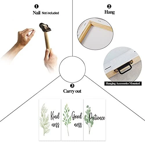 Return Policy Fast Delivery Trusted seller 3 Piece Inspirational Wall Art, White Plant Background Picture, Quote "Kind Good Patience" Canvas Print for Office Decor, Triptych Entrepreneur Painting Framed Artwork for Home Wall Decor (36"Wx18" H) Product Description ? The Home - Office Wall Decor Canvas Art Size - 3-panel motivational art prints and the size of each panel is 12x18inch (30cmx45cmx1pcs), the large 3 panels will occupy a total area of 36"Wx18" H (90cmx45cmx3pcs) on the walls of your room, Please measure your place before purchase, Choose the size that suits you. ? Motivational Botanical Leaf canvas art arrives ready to hang, with hanging accessories included and no additional framing required. Every canvas print is hand-crafted in the USA, made on-demand at TIMUBA and expertly stretched around 100% North American Pine wood stretcher bars. We only use industry leading archival UltraChrome Giclée inks to achieve the most vivid and high-definition prints possible. ? Easy Install - This High quality printed canvas is stapled and stretched with durable shrink resistant frames. Lt also features 1.50 inches thick Each panel has a black hook already mounted on the wooden bar for easy hanging out of box. Ready to hang as soon as it reaches your door. Each canvas panel is handled with care, Your paintings will be carefully packaged in In plastic film and gift box to Ensure they reach you in perfect condition. ? Perfect for House Wall Decor - One perfect wall decoration painting giving your home, Living room, bedroom, kitchen, apartment, Office, hotel, dining room, office, Bathroom, Bar and so on Add the Elegant Artistic Atmosp. Due to different brand of monitors, Actual wall art colors may be slightly different from the product image. ? Best Gift Choice - A Perfect Christmas and New Year ,Wedding, Anniversary,Thanksgiving, Christmas, Valentine, Birthday, A great gift idea for your relatives and Couple friends. Any questions, ?Please feel free to contact us?, We will satisfy you. Shipping Returns Payment Shipping Shipping is FREE to all addresses other than APO/PO boxes in the lower 48 states. All our stock ships from US-based warehouses. Shipped via USPS or UPS (depending on location and package weight) Unless stated otherwise, all orders will ship within 24-72 hours of your payment being processed. Check our feedback to see the great reviews of FAST shipping we offer. Returns Seller does not accept returns Payment We currently accept payment via eBay managed payments only. Once payment is cleared, we will dispatch your shipment within 1-3 business days. Please refer to the "Shipping" tab for more information regarding shipping speed to your destination.