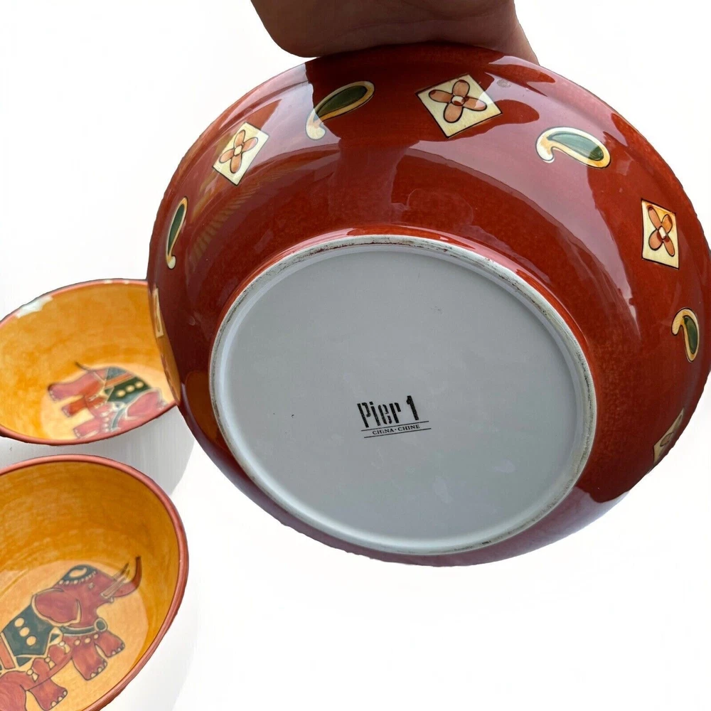 This 3-piece Pier 1 serving bowl set features an elephant theme and includes a pasta bowl and individual bowls. Made of ceramic, the serving bowl is 11.25" wide and 2-5/8" tall, while the individual bowls are 5-7/8" wide and 2.75" tall. The pasta bowl is 2.25" deep, and the individual bowls are 2.5" deep. The set weighs 5 lbs 9 oz and should be hand washed. Shipped with USPS Ground Advantage.