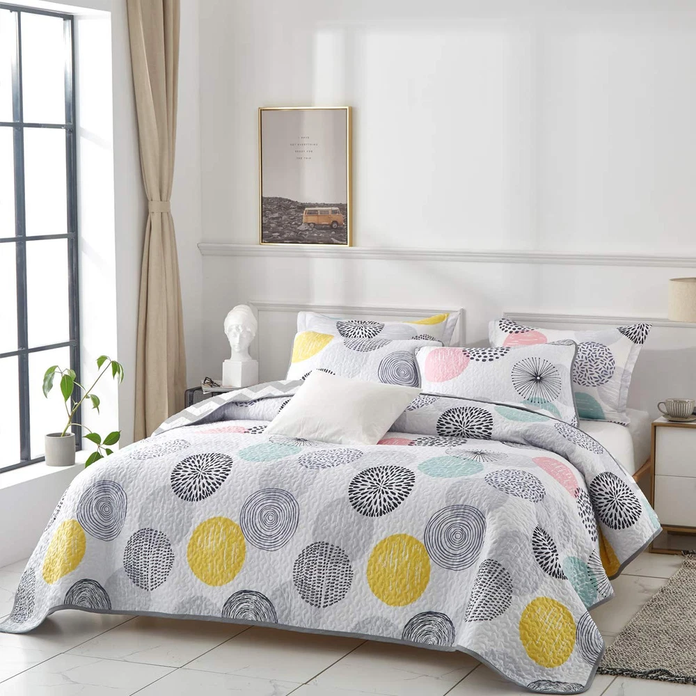 DESIGN DETAILS: A Side - Colorful dots (pink,gray,yellow Cyan Black) style with B side - White Gray Stripes Style, Twin Queen King size available most suitable for your bedroom, guest room, children's room, holiday house, dormitory,etc BEST FOR YOUR BED: Easily cover all sides and end of your bed, even with extra layers of padding(If you need a quilt that drapes all the way to the floor, you may have a low bed or choose a larger size)! Try our quilt set, you will sleep on a luxurious beautiful and cute bed MULTI-PURPOSE USAGE: Perfect coverlet quilt for spring or the coming summer or warmer weather, a little cool feeling for the hot weather, also can use in winter as a blanket. Order 1 set and use all season. Use as quilt,bedspread, comforter set, blanket,bed cover. EASY CARE: Easy to clean (NO Dog's or Cat's hairs pets' fur left) Machine wash in cold. Tumble dry low. Package Include: 1 Queen Quilt 90"x90" and 2 Pillow sham (20"x26") 00000 Try bigger Size (King or CakIing) if you want to drape to floor. Want a cover for this quilt? Search Duvet Cover Set on and find more collection! We also have the same style sheet set and comforter, If you want them, just search Uozzi colorful dots on