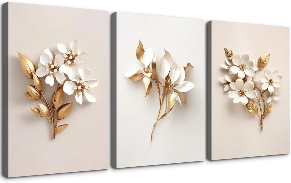 3 Piece Wall Art Canvas Gold Flower Picture Minimalist Floral Poster Modern Art