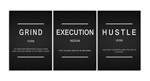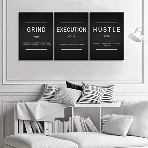 Introduction: High Definition Giclee modern canvas printing art work, picture photo printed on high quality canvas.We use high quality canvases which are designed specifically for canvas printing. Our canvas is a white semi-gloss artists canvas.Canvas pictures are stretched on wooden stretcher frames. All frames are of the highest quality.High Definition Art Workprint on canvas with vivid color on thick high-quality canvas to create the look and feel of the original nature and masterpiece.and relax you after work. Decoration: A perfect wall decorations paintings for living room, bedroom, kitchen, office, Hotel, dining room, office, bar etc.. Due to different brand of monitors, actual wall art colors may be slightly different from the product image. A perfect Christmas and New Year ,wedding, anniversary, thanksgiving, christmas, mother's Day, father's Day, valentine, birthday gifts for your relatives and friends. IMPORTANT: Please note display pictures are only for illustration purposes. Please measure your wall properly and make sure you pick the right size. ✔【Painting Size】 12inchx16inchx3pcs(30cmx40cmx3pcs) , 3 Panels Canvas Prints describe Retro Style Inspirational Wall Art Motivational Wall Decor Picture. ✔【High Quality Printed Canvas】 High Definition Giclee canvas wall art printings artwork, Grind Verb Hustle Verb Execution Noun Inspirational Entrepreneur Quotes painting of picture printing on canvas. Artwork is printed at high resolution with vivid color on thick high quality canvas. High quality environmentally protection ink, waterproof and not easy to fade. ✔【Ready to Hang】 Stretched and Framed canvas art prints ready to hang for home decorations wall decor. Each panel has a black hook already mounted on the wooden bar for easy hanging out of box.Each canvas panel is handled with care, Your paintings will be carefully packaged in bubble wrap and cardboard to ensure they reach you in perfect condition. ✔【Perfect Wall Decor】 A perfect paintings for office decor, living room, classroom, Gym, bedroom, kitchen, Hotel, dining room, bar etc.. It will be a unique wall decorations to decorate your space. Due to different brand of monitors, actual wall art colors may be slightly different from the product image. ✔【Best Gift Idea】 A great gift idea for your lover, families, classmates, friends or workmates. Any questions, please feel free to contact us.
