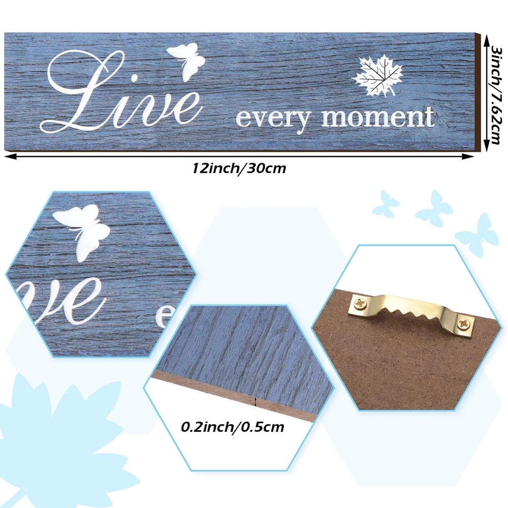 Features: Extensive application: These live love and laugh wooden plaques can be often seen at home, office, restaurant, cafe, bookstore, dessert , library or other places, not only can you hang them in living room, bedroom, study room, aisle, corridor, yard and so on, also place them directly on the shelf or cabinet, feasible for you to put them with other decorations there. Housewarming gifts: These artistic words of hanging wall wooden signs symbolize harmony, happiness, encouragement and unity, suitable for you to give them to your friends or family as considerate presents who are seeking home decorations, which can bring a warm feeling for their home. Specifications: Material: wood Color: as the picture shown Rustic wall wooden signs size: approx. 30 x 7.6 cm/ 12 x 3 inches Rustic wall wooden signs thickness: approx. 0.5 cm/ 0.2 inches Package includes: 3 x Rustic wall wooden signs Notes: Please allow a little error on the size due to manual measurement. The colors may exist slight difference due to different screen. What you will get: the package includes 3 pieces rustic wooden signs in different words about live, love and laugh, enough quantity for you to meet your daily decorations and make replacements, also packed well, avoiding being broken during transportation Sturdy material: these wooden wall decoration signs are made of quality wood, characterized with durability and good wooden texture, not easy to deform or break, also touch smoothly due to fine workmanship and polishing, which can be decorated repeatedly for a long time Easy to use: these are serrated hangers on the back of the wooden wall sign (each end has ), convenient for you to hang it on the wall or other places that have hooks, also easy for you to take off, meanwhile, the hanger design can help to prevent the wall from being imprinted with glue and leaving a trace Rustic design: these farmhouse wooden wall sign decorations are printed with cute butterflies and different quotes, namely [Live every moment], [Laugh every day] and [Love beyond words], suitable for you to decorate, which can create a style for your home Proper size: these rustic farmhouse wooden signs measure approx. 30 x 7.6 cm/ 12 x 3 inches and approx. 0.5 cm/ 0.2 inches in thickness, appropriate size and light weight for you to hang by yourself at home, also portable for you to carry and , would not take too much space
