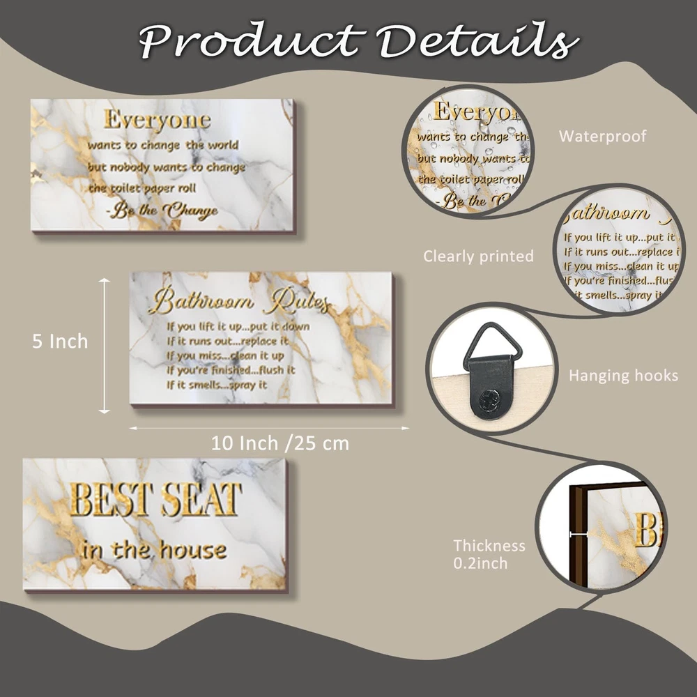 3 Pieces White Gold Bathroom Decor Bathroom Rules Wall Art White Gold Bathroom Rules Best Seat in The House Rustic Farmhouse Wooden Sign for Bathroom Toilet Wall Decor (White Gold 10x5) Product Details Color: White Gold Brand: DONFENTHY MPN: DON0012WHITE GOLD UPC: Does not apply EAN: Does not apply Color: White Gold Brand: DONFENTHY Material: Wood Theme: Flower Recommended Uses For Product: Bathroom decor and enhancement Mounting Type: Wall Mount Product Dimensions: 10"L x 5"W Shape: Rectangular Style: Rustic Item Weight: 8.8 ounces Elevate Your Bathroom Decor with a Set of 3: A trio of charming white gold bathroom rule wall decor pieces, each adorned with a captivating white gold flower background and a delightful phrase, like "Best Seat in the House." Suitable for a cohesive and stylish bathroom upgrade. Ideal Dimensions for Bathroom Elegance: Crafted at an ideal size of 10 x 5 inches, our white gold bathroom rule signs strike the right balance between visibility and subtlety. Hang them effortlessly on your toilet wall, creating a focal point that adds a touch of sophistication to your space. Quality Craftsmanship for Lasting Appeal: Meticulously crafted from quality materials, these rustic farmhouse wooden grey bathroom rule signs boast quality that stands the test of time. The 0.2-inch thickness adds a robust feel, ensuring they remain a timeless addition to your bathroom decor. Transform Your Space with Eye-Catching Charm: Catch attention and admiration with our white gold bathroom rule wall art. The white gold marble background and interchangeable bathroom rules not only create an inviting atmosphere but also leave a lasting impression of cleanliness and warmth on your guests. Versatile Decor for Every Bathroom Theme: Tailored for the bathroom theme, these white gold wall decor pieces effortlessly blend into any washroom aesthetic. With the right quantity and ideal dimensions, they become the focal point, effortlessly tying together the elements in your bathroom for a cohesive and inviting atmosphere.