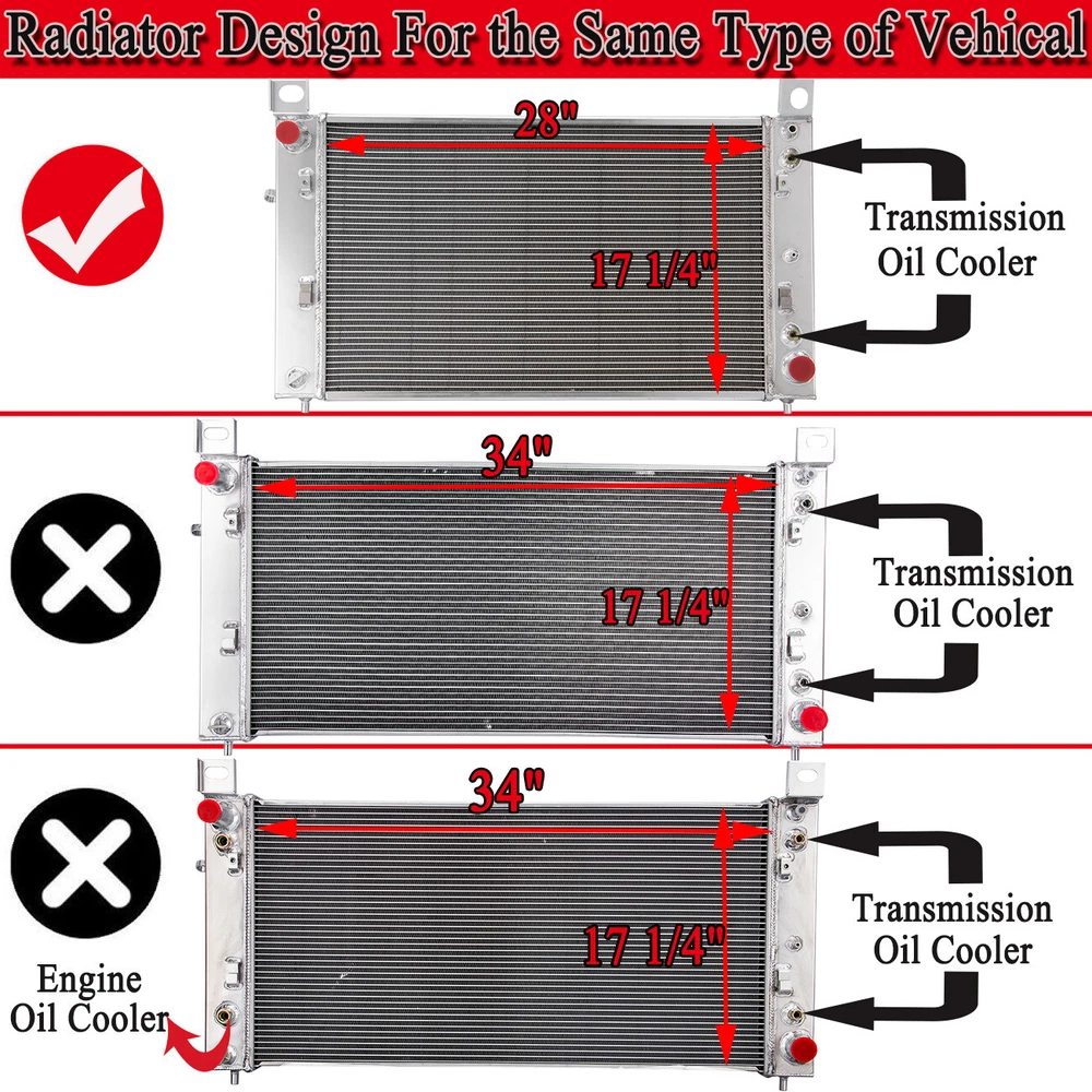 Store Home Hot Items Add to cart Add to FAS Feedback Contact us Store Home Car&Truck Radiator Oil Tank/Can Arms/Carrier Motorcycle Radiator Intercooler&Kit Exhaust Head Pipe Radiator Intercooler Hose Pipe Cooling Thermo Fans&relay Radiator Cap&Filler Neck&Plug Wheel Spacers Other Products "> [IMG12] Description PLS NOTE: 1. Please make sure that the length of this Radiator core (Between Tanks) is 28 " (NOT FOR 34" ) . 2. ONE side have Oil Cooler. WITH Transmission Oil Cooler ( NO Engine Oil Cooler ) Package Include: 1 x 3-Row Aluminum Radiator Radiator Size: Condition: New Row: 3 Rows Core Material: Full Aluminum Core Size: 28 1/3'' W x 17 5/8'' H x 1 3/4'' T Overall Size : 35 2/3'' W x 21 3/7'' H Inlet: 1 3/8" Outlet: 1 4/7" Transmission Oil Cooler: φ26*292*G3/8-19(Z) Engine Oil Cooler: No Transmission: Automatic High Performance Racing Spec. De scription : This Aluminum Radiator is designed to provide maximum cooling efficiency to prevent premature engine failure. Its light-weight, and high-heat transferring aluminum features a tube and fin design that, dramatically increases surface area that enables the heat to dissipate more efficiently. This Aluminum Radiator is at least 40% more efficient than stock ones. Most importantly, it has a much higher capacity for coolant than stock ones, which means that your cooling system will be more efficient and will be more resistant to temperature surges in racing applications. Manufacturer Part Number DPI 2334 OE 15143107 OE 15193107 OE 15193114 OE 15841569 OE 15841573 OE 15841574 OE 22840116 OE 52486594 OE 52487603 Partslink GM3010274 SBQ Q2334 Vehicle Fitment: CADILLAC ESCALADE 2002-2005 CHEVROLET SILVERADO 1500 1999-2013 CHEVROLET SILVERADO 1500 CLASSIC 2007 CHEVROLET SILVERADO 2500 1999-2000 CHEVROLET SUBURBAN 1500 2000-2006 CHEVROLET TAHOE 2000-2006 GMC SIERRA 1500 1999-2007 GMC SIERRA 1500 CLASSIC 2007 GMC SIERRA 2500 1999-2000 GMC YUKON 2000-2006 GMC YUKON XL 1500 2000-2006 PAYMENT SHIPPING RETURNS FEEDBACK ABOUT US PAYMENT We accept online payment. All major credit cards are accepted through secure payment processor PayPal.(* If you use e-check on PayPal, delivery may take longer, as we will hold your order until your e-check clear) Payment must be received within 7 business days of auction closing. Please make sure your PayPal and eBay address is correct. If not, please correct it before payment. Thank you. Custom duties, taxes, or charges are not included in the cost you pay to us. Please check with your country's customs office to determine what these additional costs will be prior to bidding/ buying. SHIPPING We Ship to Worldwide, except China (Hong Kong), and we do not ship to APO/FPO. Orders processed within 12-24 hours of payment verification.( On Sundayis our rest day). Before buying, Please make sure your PayPal and eBay address is correct. If not, please correct it before payment.if you want me send the item to another address,please send me a message. If you have not received your shipment within 40 days from payment, please contact us. We will track the shipment and get back to you as soon as possible with a reply. Our goal is customer satisfaction! Due to stock status and time differences, we will choose to ship your item from our first available warehouse for fast delivery. Many of our products have overseas warehouses, including Australian warehouses, American warehouses and British warehouses. RETURNS If you are not satisfied when you receive your item, please return it within 30 days for a replacement or money back. Please contact me before you return it. Defective items Must Be reported and returned to us within the warranty period (and in the original packaging, if possible). You must tell us what the defect is and give us your eBay ID. We act as a responsible seller; we are willing to actively undertake the following responsibilities: a. The item is lost during transit; b. The item is damaged during transport; c. Due to our work errors, transporting the wrong items to the buyer; d. The item in the actual use of the process of quality problems. FEEDBACK Very appreciated for your support. We hope you are happy with your purchase. We will leave POSITIVE FEEDBACK after receiving the payment. Please contact us if you are not satisfied with the item after receiving it. If you have any problem, please feel free to contact us via ebay message, we will reply your email within 24 hours (except weekends and holidays). We will do our best to solve your problem as soon as possible. We maintain high standards of excellence and strive for 100% customer satisfaction! Feedback is very important to us. We request that you contact us immediately. Before you give us neutral or negative Feedback, so that we can satisfactorily address your concerns. Good communication can fix all problems, we always believe that as long as you are willing to communicate with us, we will give you a satisfactory answer.Thank you for choosing us and have a great day! ABOUT US Welcome to my shop,We offer an extensive range of products selected by our professionals.superiority in details and quality is a high priority. We also have a high-standard team, qualified by authorized organizations to ensure products are of the highest quality. As an internet seller, we collaborate with excellent international transport companies, and in Australia and the United States we have our own warehouses, offering the most convenient delivery service possible. On-time shipping and reliable quality control are key areas of importance in our shop. We are increasingly expanding international markets based on high quality products, excellent service, reasonable prices and timely delivery. Please contact us at any time for more information.We work hard to make sure EVERY CUSTOMER 100% approvingly. STORE HOME ALL ITEMS ABOUT US ADD TO FAVS FEEDBACK CONTACT US Copyright ? alloyworks_accessories. All Rights Reserved. PLS NOTE: 1. Please make sure that the length of this Radiator core (