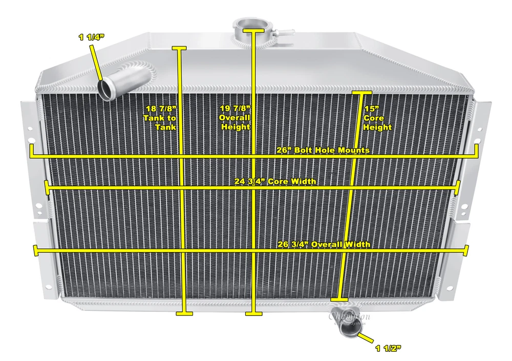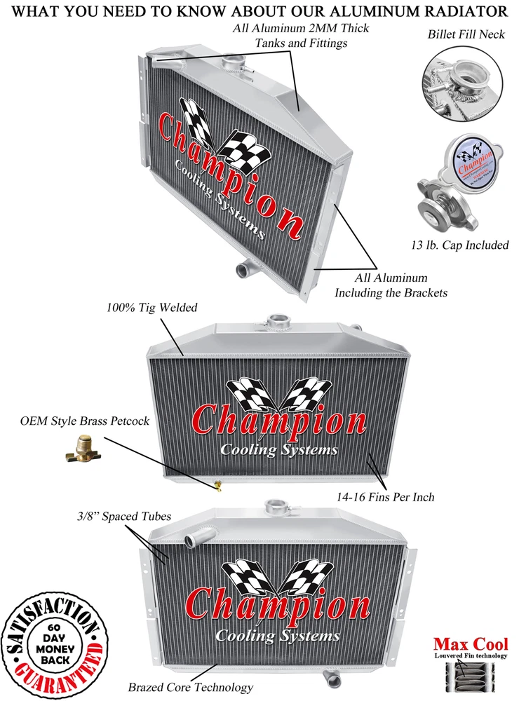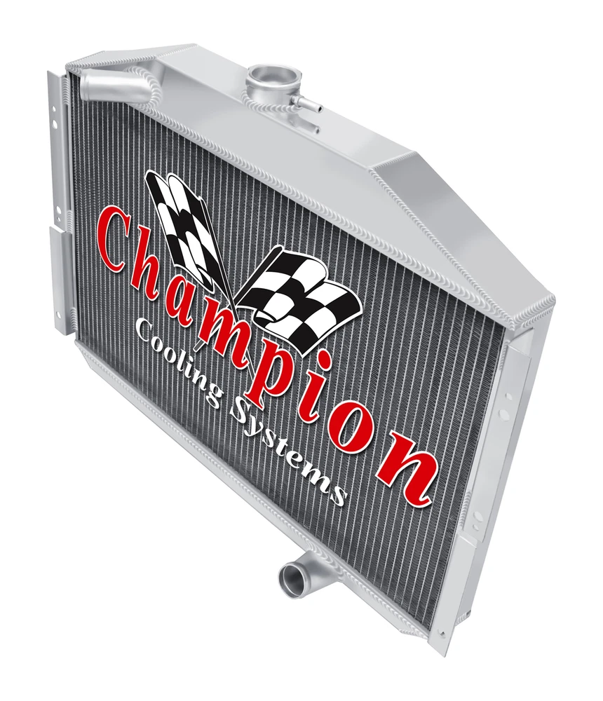 Champion Cooling radiators are tig welded with aircraft grade aluminum. Every radiator comes with a limited lifetime warranty so you can buy with confidence! Product Specifications: Core (H x W): 15" x 24.75" - Overall (H x W): 19.875" x 26.75" - Hose Locations (In x Out): Driver x Pass - Hose Fittings (In x Out): 1.25" x 1.5"Please click on the "Read more" link below to view a complete item description with product videos and additional items to upgrade your cooling system. Champion Racing Radiators PART INFORMATION Shipping Payment Policies Contact Us Part Information Related Items Need A Different Set Up? (Click A Photo Below) 3 Row Racing Champion Radiator for 1955 Studebaker President V8 Engine #CC5355 Genuine Champion Cooling Systems Part #CC5355 This radiator is designed for a 4.2L(259ci) V8 engine. (Please Verify Your Radiator Core size Before You Buy) Features Higher density core: cooling rows are spaced 3/8" apart: giving you 25% more rows within the core than other aluminum radiators sold on eBay and 35% more rows than OEM copper. Aluminum dissipates heat more efficiently than copper or brass. 14-16 cooling fins per inch (42 per square inch) giving you approximately 1500 more cooling fins than other aluminum radiators and approximately 3000 more than OEM copper radiators. Lighter weight. Outperforms other 2, 3 and 4 row copper radiators. High performance appearance. You get "BIG BLOCK COOLING" and "PEACE OF MIND" when you drive your car with a Champion Cooling Systems radiator. You could easily spend $400 - $1,000 more for a radiator of similar quality. Specifications Down Flow Or Cross Flow Type: Down Flow Mounting Type: Bracket Tank Material: Aluminum Core Material: Aluminum Overall Height: 19 7/8 Overall Width: 26 3/4 Core Height: 15 Core Width: 24 3/4 Inlet Location: Driver Inlet Diameter: 1 1/4 Outlet Location: Passenger Outlet Diameter: 1 1/2 Core Row Quantity: 3 Internal Transmission Oil Cooler: No This package includes a 3 Row all aluminum radiator. Champion Cooling Systems radiators are manufactured at their ISO certified facility. They are made to high standards of quality and workmanship using the Highest Grades of aluminum available and are constructed with 100% welded seams, brazed core technology and no epoxy. They come with a Lifetime Limited Warranty and are made to install with little or no modifications using your Original Mounts giving you the confidence you desire. Shipping Shipping FedEx Ground Service to the Lower (48) States: FREE SHIPPING. (Hawaii and Alaska $65.00 Additional Shipping Charge). International Shipments are via FedEx International (See Shipping Drop Box For Prices). Payment Guarantee Policies Contact Us We offer a full line of Champion Cooling Systems Performance Products. Thank You! © copyright 2009