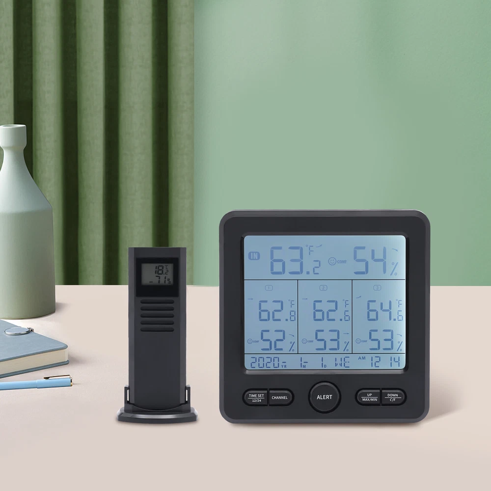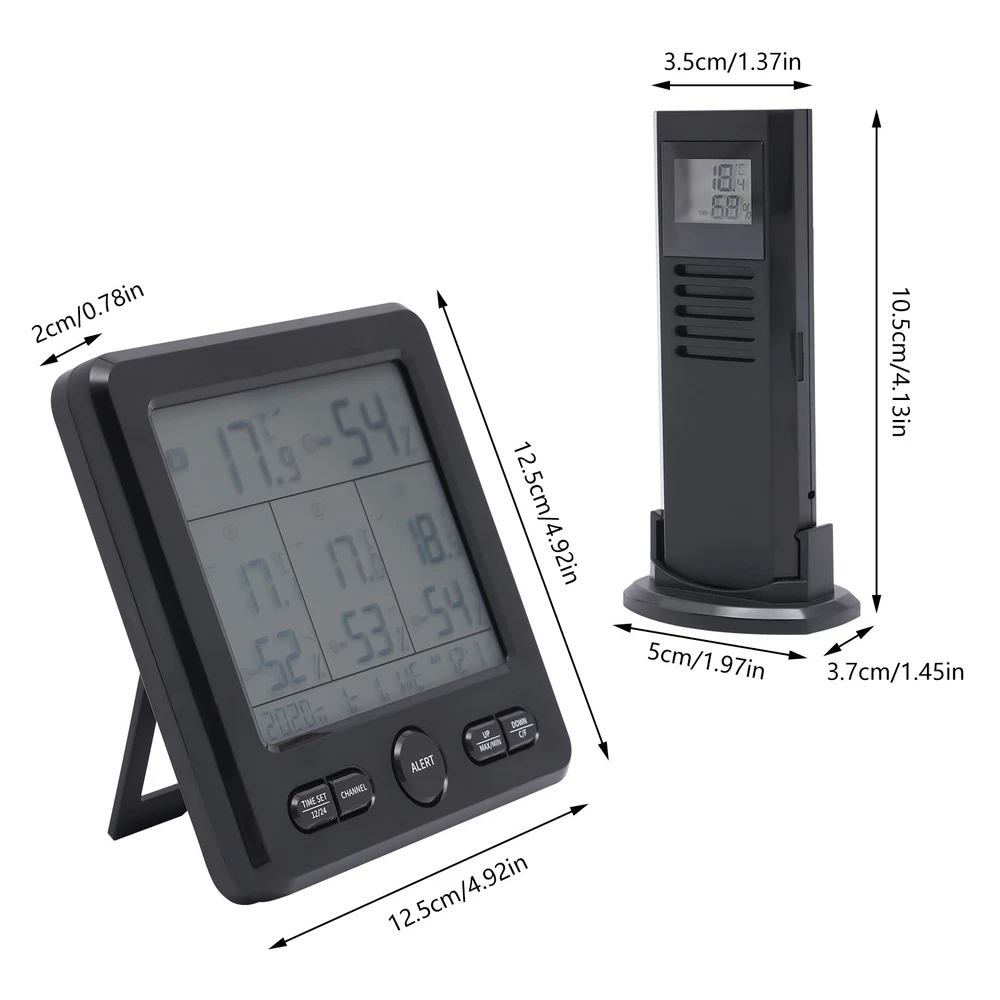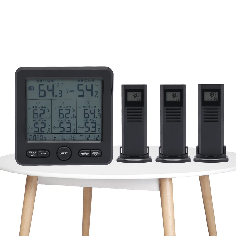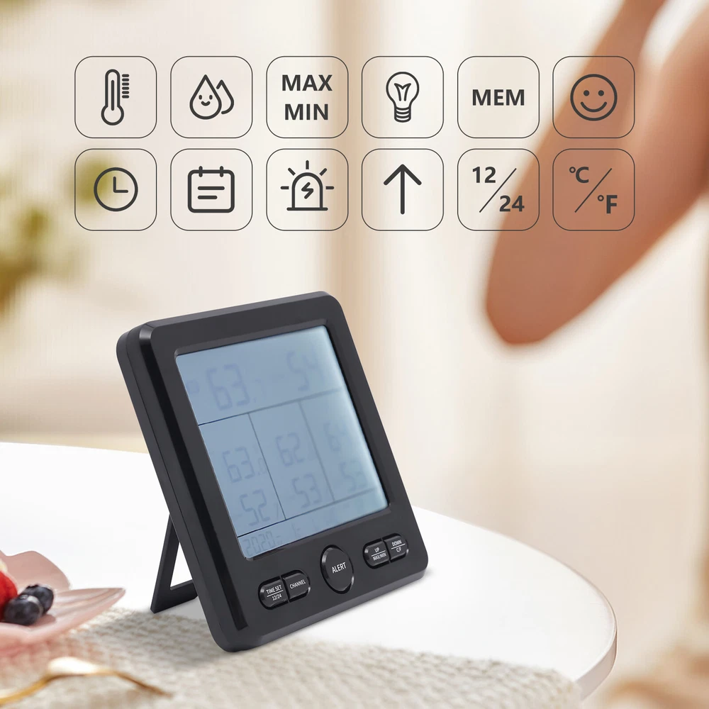 3 Sensors Wireless Indoor Outdoor Thermometer Temperature Humidity Monitor 3 Sensors Digital Wireless Hygrometer Thermometer Indoor Outdoor Humidity Meter Description Proper temperature and humidity can bring us a more comfortable living environment and a healthier body. Our digital hygrometer can help you do this. Made by ABS, it provides quality assurance for your use. Complete functions and a large LCD display fully meet your different needs. With it, you can monitor the temperature and humidity in real time, and the ritual and happiness of life will follow. Key Features Build to Last: High-quality ABS make the item durable and solid, and it can better keep beautiful and practical without frequent replacement. HD Display: Large LCD screen allows you to clearly view the indoor and outdoor temperature, humidity, trend, clock, date, 3 vivid facials icons of comfort level, low battery prompt, etc. so as to take better care of your family's health. Good Performance: Three sensors with a transmission distance of 100m/328.08ft in an open area and an effective distance of 30m/98.43ft enable you to receive temperature and humidity data from four different locations on the screen without leaving home. In addition, the product also has memory and calibration functions, and you can also switch between 12/24 hours, and ℃/℉. Safety Guard: When the temperature and humidity exceed the set upper and lower limits, the product will send out a corresponding color alarm accompanied by a sound. In addition, uniform cooling holes can also reduce the temperature in time, thus further protecting safety. Careful Design: The product supports eight language settings, fully meeting different needs. In addition, the energy-saving mode can also save your costs and extend the service life to a certain extent, Simple Use and Installation: The simple structure, complete accessories, convenient buttons, detailed instructions, and videos ensure that you can complete the installation in a short time. In addition, the foldable support frame and hanging hole make the product be hung or stand. Beautiful Appearance: The timeless black and smooth lines make the whole product modern and fashionable, and it will be beautiful scenery in your home or other places. Ideal Gift: With complete functions, this item can be used as a holiday or housewarming gift for parents, lovers, and friends so that they can enjoy a more convenient life. Compact and Lightweight: 4.92*0.79*4.92inch small size and 0.6lbs weight ensure that you can easily move and carry it anywhere. Protective Packaging: The sponge can better protect your product during transportation so that it can be delivered to you completely. Details Round Corner: Compared with traditional square corners, an arc design can better care for your skin. Long Power Cord: The 3.28ft cord allows you to have enough disposable length for easy placement, and can also further protect your safety. Robust Base: The base of each sensor can not only maintain stability but also make your installation more flexible. Application The product can be placed and hung in different places, such as bedrooms, living rooms, kitchens, offices, bathrooms, nurseries, gardens, basements, greenhouses, camping, storage room, or any other location you want to detect temperature, humidity, etc. Specification Color: Black Material: ABS Power Source: Corded Electric, Battery Control Mode: LCD Screen Style: Modern Shape: Rectangular Mount Type: Countertop or Hanging Type Indoor Temperature Range: 0-50°C/32-122℉ Indoor Humidity: 20% - 99% Temperature Resolution: 0.1% Outdoor Temperature Range: -50-70°C/-58-158℉ Outdoor Humidity Range: 20% - 99% Humidity Resolution: 1% Transmission Distance: 100m/328.08ft in Open Area Effective Distance: 30m/98.43ft Number of Items: 1 Number of Sensors: 3 Number of Languages: 8 Voltage: 5V 1A Battery Type(Not Included): 3* AAA for Host, 2* AAA for Each Sensor Power Cord Length: 1m/3.28ft Gross Weight: 0.38kg/0.84lbs Net Weight: 0.27kg/0.6lbs Package Size: 18*18*7cm/7.09*7.09*2.76inch Host Size: 12.5*2*12.5cm/ 4.92*0.79*4.92inch s Each Sensor Size: 5*3.7*10.5cm/1.97*1.46*4.13inch Package Included 1* Digital Hygrometer 3* Sensors 1* English Manual 1* Power Cord Payment Delivery details Terms of sales About us Contact us Payment We accept ebay payment 。 Fees such as import duties, taxes are not included in the item price or shipping costs. These charges are the buyer's responsibility. Delivery details Shipping: 2-9 working days to: USA Terms of sales We maintain high standards of excellence and strive for hundred percent customer satisfaction. Feedback is very important to us. We hope that you contact us immediately before you give neutral or negative feedback, so that we can address your concerns. It is impossible to address issues if we do not know about them! About us Your satis faction is our ultimate goal. We work hard to earn your trust and future business. Our certified technicians have tested each item before shipping. The unit comes with 1 year limited warranty on all manufacturing defects. a) If you receive a defective item, you may return it or ask for a discount. Please contact us within 14 days after you receive the package. b) What you returned must be intact and in its original packaging as re? u. Customer is responsible for shipping costs of the returned item. c) We will cover the cost of shipping back t with the shipping rate indicated in the registration page. We will send you a new unit or refund the full payment you paid. Thank you. Contact us Business Hour Business Hour: Monday To Friday: 8:30 AM to 5:00 PM (Beijing China time) Due to time zones, our reply to your questions may not be immediately. But within above working time, we will reply your email within 24 hours. If it's non-workdays, please kindly be patient and wait till Monday. Please contact us with ebay message. Please feel free to contact us if you have any questions. Monday To Friday: 8:30 AM to