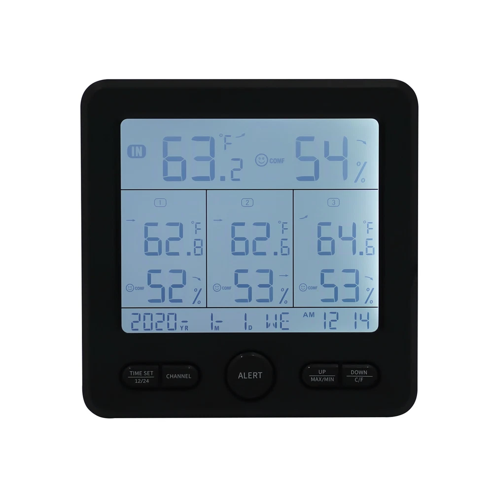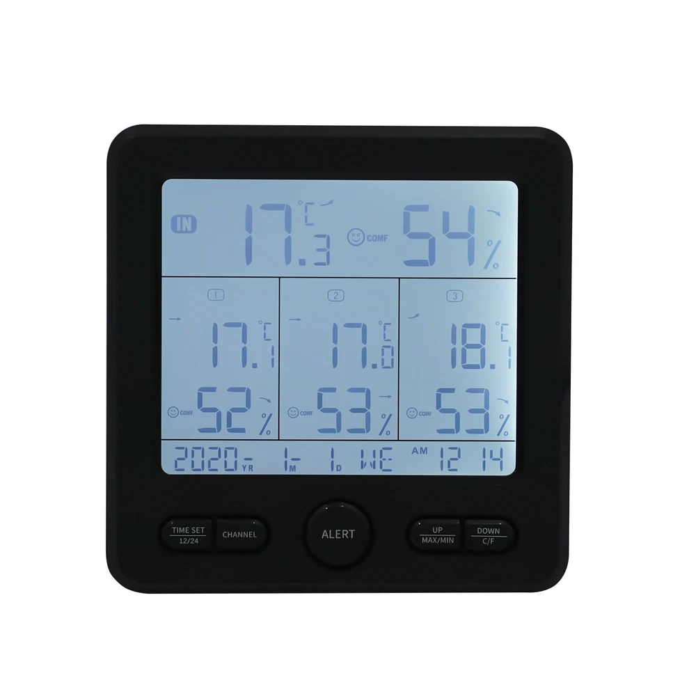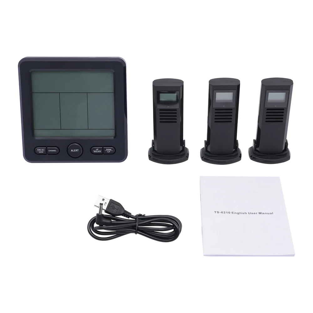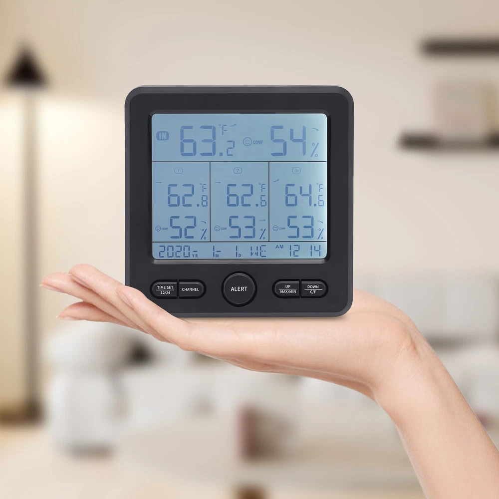 3 Sensors Wireless Indoor Outdoor Thermometer Temperature Humidity Monitor 3 Sensors Digital Wireless Hygrometer Thermometer Indoor Outdoor Humidity Meter Description Proper temperature and humidity can bring us a more comfortable living environment and a healthier body. Our digital hygrometer can help you do this. Made by ABS, it provides quality assurance for your use. Complete functions and a large LCD display fully meet your different needs. With it, you can monitor the temperature and humidity in real time, and the ritual and happiness of life will follow. Key Features Build to Last: High-quality ABS make the item durable and solid, and it can better keep beautiful and practical without frequent replacement. HD Display: Large LCD screen allows you to clearly view the indoor and outdoor temperature, humidity, trend, clock, date, 3 vivid facials icons of comfort level, low battery prompt, etc. so as to take better care of your family's health. Good Performance: Three sensors with a transmission distance of 100m/328.08ft in an open area and an effective distance of 30m/98.43ft enable you to receive temperature and humidity data from four different locations on the screen without leaving home. In addition, the product also has memory and calibration functions, and you can also switch between 12/24 hours, and ℃/℉. Safety Guard: When the temperature and humidity exceed the set upper and lower limits, the product will send out a corresponding color alarm accompanied by a sound. In addition, uniform cooling holes can also reduce the temperature in time, thus further protecting safety. Careful Design: The product supports eight language settings, fully meeting different needs. In addition, the energy-saving mode can also save your costs and extend the service life to a certain extent, Simple Use and Installation: The simple structure, complete accessories, convenient buttons, detailed instructions, and videos ensure that you can complete the installation in a short time. In addition, the foldable support frame and hanging hole make the product be hung or stand. Beautiful Appearance: The timeless black and smooth lines make the whole product modern and fashionable, and it will be beautiful scenery in your home or other places. Ideal Gift: With complete functions, this item can be used as a holiday or housewarming gift for parents, lovers, and friends so that they can enjoy a more convenient life. Compact and Lightweight: 4.92*0.79*4.92inch small size and 0.6lbs weight ensure that you can easily move and carry it anywhere. Protective Packaging: The sponge can better protect your product during transportation so that it can be delivered to you completely. Details Round Corner: Compared with traditional square corners, an arc design can better care for your skin. Long Power Cord: The 3.28ft cord allows you to have enough disposable length for easy placement, and can also further protect your safety. Robust Base: The base of each sensor can not only maintain stability but also make your installation more flexible. Application The product can be placed and hung in different places, such as bedrooms, living rooms, kitchens, offices, bathrooms, nurseries, gardens, basements, greenhouses, camping, storage room, or any other location you want to detect temperature, humidity, etc. Specification Color: Black Material: ABS Power Source: Corded Electric, Battery Control Mode: LCD Screen Style: Modern Shape: Rectangular Mount Type: Countertop or Hanging Type Indoor Temperature Range: 0-50°C/32-122℉ Indoor Humidity: 20% - 99% Temperature Resolution: 0.1% Outdoor Temperature Range: -50-70°C/-58-158℉ Outdoor Humidity Range: 20% - 99% Humidity Resolution: 1% Transmission Distance: 100m/328.08ft in Open Area Effective Distance: 30m/98.43ft Number of Items: 1 Number of Sensors: 3 Number of Languages: 8 Voltage: 5V 1A Battery Type(Not Included): 3* AAA for Host, 2* AAA for Each Sensor Power Cord Length: 1m/3.28ft Gross Weight: 0.38kg/0.84lbs Net Weight: 0.27kg/0.6lbs Package Size: 18*18*7cm/7.09*7.09*2.76inch Host Size: 12.5*2*12.5cm/ 4.92*0.79*4.92inch s Each Sensor Size: 5*3.7*10.5cm/1.97*1.46*4.13inch Package Included 1* Digital Hygrometer 3* Sensors 1* English Manual 1* Power Cord Payment Delivery details Terms of sales About us Contact us Payment We accept ebay payment 。 Fees such as import duties, taxes are not included in the item price or shipping costs. These charges are the buyer's responsibility. Delivery details Shipping: 2-9 working days to: USA Terms of sales We maintain high standards of excellence and strive for hundred percent customer satisfaction. Feedback is very important to us. We hope that you contact us immediately before you give neutral or negative feedback, so that we can address your concerns. It is impossible to address issues if we do not know about them! About us Your satis faction is our ultimate goal. We work hard to earn your trust and future business. Our certified technicians have tested each item before shipping. The unit comes with 1 year limited warranty on all manufacturing defects. a) If you receive a defective item, you may return it or ask for a discount. Please contact us within 14 days after you receive the package. b) What you returned must be intact and in its original packaging as re? u. Customer is responsible for shipping costs of the returned item. c) We will cover the cost of shipping back t with the shipping rate indicated in the registration page. We will send you a new unit or refund the full payment you paid. Thank you. Contact us Business Hour Business Hour: Monday To Friday: 8:30 AM to 5:00 PM (Beijing China time) Due to time zones, our reply to your questions may not be immediately. But within above working time, we will reply your email within 24 hours. If it's non-workdays, please kindly be patient and wait till Monday. Please contact us with ebay message. Please feel free to contact us if you have any questions. Monday To Friday: 8:30 AM to