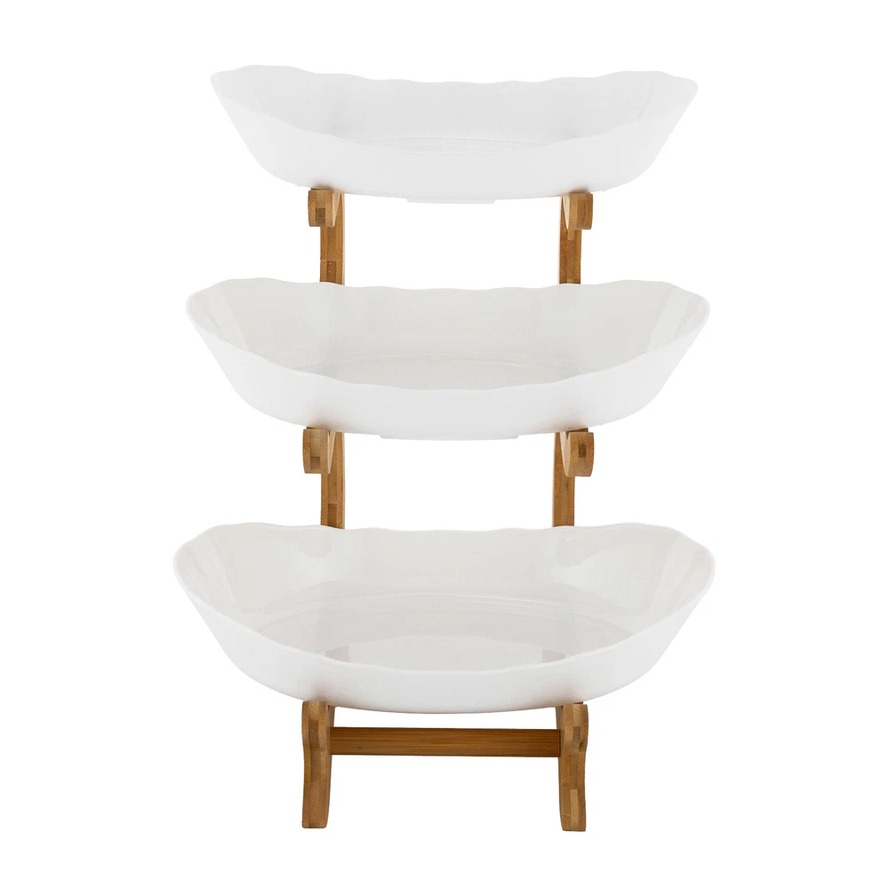 This 3-tier bamboo serving stand is perfect for parties! The elegant yuanbao design and polished finish make it stylish, while the sturdy construction holds snacks, fruits, or desserts neatly. The different-sized bowls are spacious, and the natural wood look adds a classy touch to any table. Easy to assemble, though handwashing is needed—totally worth it for such a beautiful and functional piece! Great for entertaining or as a gift.