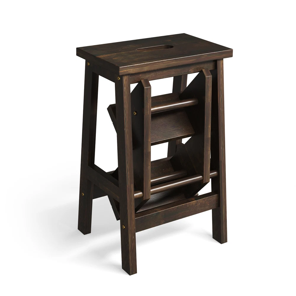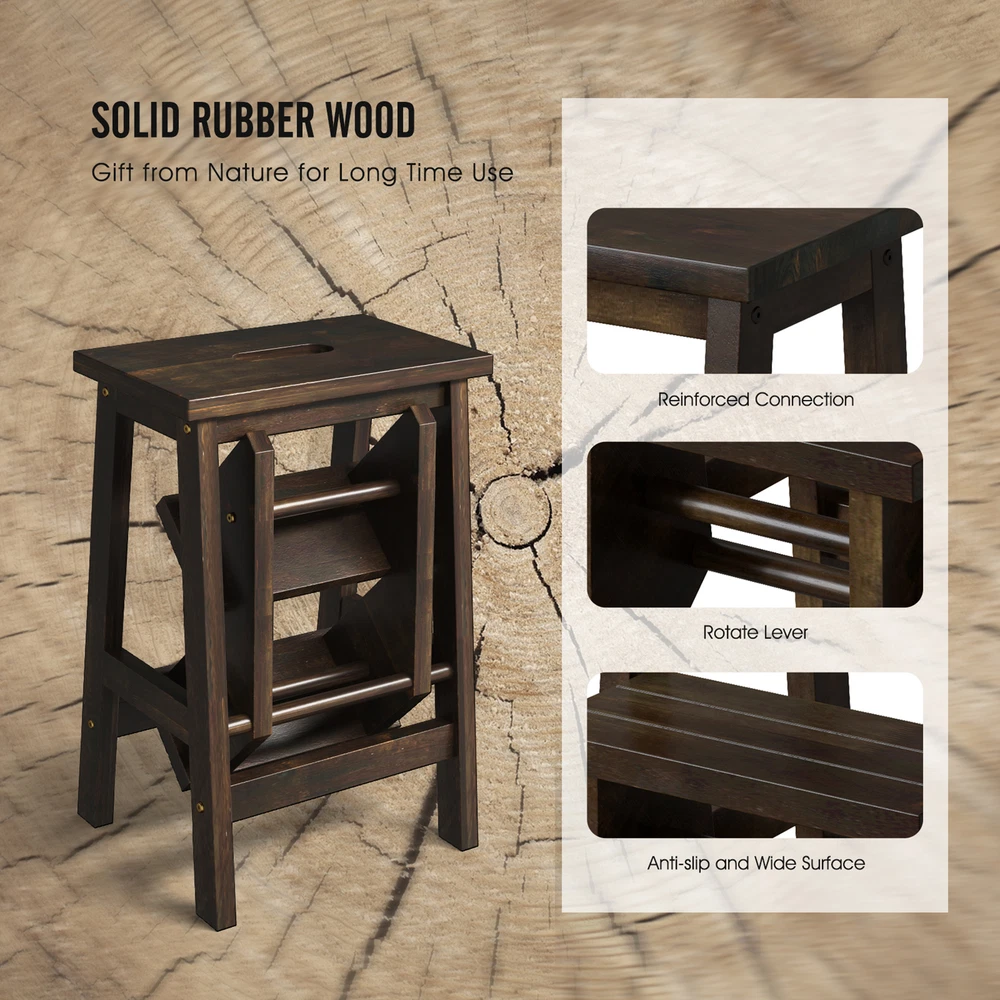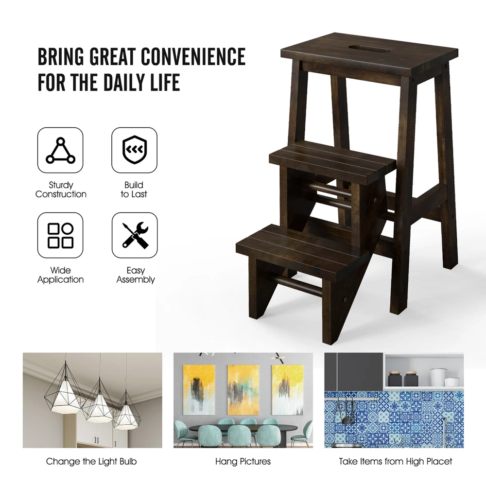 Color: Brown Material: Rubber Wood Overall Dimension of Step Ladder: 22" x 16" x 24" (L x W x H) Overall Dimension of Stool: 13" x 16" x 24" (L x W x H) Net Weight: 13 lbs Weight Capacity of Each Pedal: 200 lbs Package Includes: 1 x Step Stool 1 x Instruction Whether you want to reach high places for cleaning, painting or other activities, this 3 step stool will be the perfect assistant for you! Designed with anti-slip and wide pedals, this step ladder provides safety and comfort while you are standing on it. Apart from serving as a stepladder, it also can be used as a normal stool and plant stand, which greatly meets your various demands. Likewise, the movement is very easy because of its built-in handle. What's more, solid rubber wood stands the test of time. Features: Can be used as a step ladder or normal stool for different needs Brings heel-to-toe foot support with wide pedals Easy to reach high places for great convenience Solid rubber wood durability and stability Considerate handle for easy movement Holds up to 200 lbs for each pedal Anti-slip surface for safe standing Detailed instruction for easy installation Color: Brown Material: Rubber Wood Overall Dimension of Step Ladder: 22" x 16" x 24" (L x W x H) Overall Dimension of Stool: 13" x 16" x 24" (L x W x H) Net Weight: 13 lbs Weight Capacity of Each Pedal: 200 lbs Package Includes: 1 x Step Stool 1 x Instruction