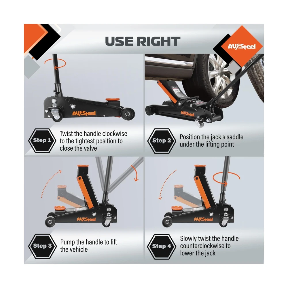 3 Ton Floor Jack (6600 lbs), Heavy Duty Hydraulic Jack for Car, Heavy-Duty Floor Jack with Single Piston Pump, Quick Lift Car Jack 3 ton with Lifting Range 5.5'' to 18.5'' Description Features: Capacity: AV Steel car floor jack can easily lift up to 3 tons (6,600 lbs) with a min lifting height of 5.5" and a max height of 18.5", making it suitable for most cars, trucks, and SUVs in terms of listing range and capacity. Truck jack is great for garage service and heavy-duty industrial use. Overload Protection: A safety measure in the hydraulic car jack serves to provide extra protection in case of excess weight and to avoid harm or damage. A 360 rotatable saddle provides maximum protection to your vehicle. High Quality: Our heavy-duty car lift jack is made of strong and durable steel construction. With wheels, including 2 rotating rear wheels that are universal, this jack is easy to move, steer, and roll. Meets ANSI/ASME PASE safety standards. Universal fit: Whether you need to change a tire, perform maintenance, or make repairs, the 3ton floor jack is the perfect tool for the job. Its easy-to-use design and reliable performance make it a great addition to any garage or workshop. Product Details: Load Capacity: 6600 Pounds Maximum Lifting Height: 18.5 Inches Brand: AV Steel Color: Multi color Item dimensions L x W x H: 26.4 x 14.2 x 8.3 inches Load Capacity: 6600 Pounds Maximum Lifting Height: 18.5 Inches Brand: AV Steel Color: Multi color Item dimensions L x W x H: 26.4 x 14.2 x 8.3 inches Style: Quick lift Manufacturer: AV Steel UPC: 198168207376 Model: Floor Jack Item Weight: 63.9 pounds Product Dimensions: 26.4 x 14.2 x 8.3 inches Item model number: AV-300101F Manufacturer Part Number: AV-300101F Date First Available: April 27, 2024 Delivery We Do Not Ship Outside of the Continental US. Return Policy All items qualify for returns within 30 days of receipt. Buyer is responsible for return shipping on any item that is not damaged. Feedback We take our reputation seriously, we buy and sell online, so we understand the value of trust. If you are unsatisfied with your order, please contact us and we will work with you to resolve it to your satisfaction.