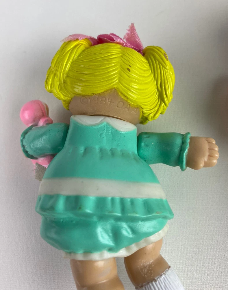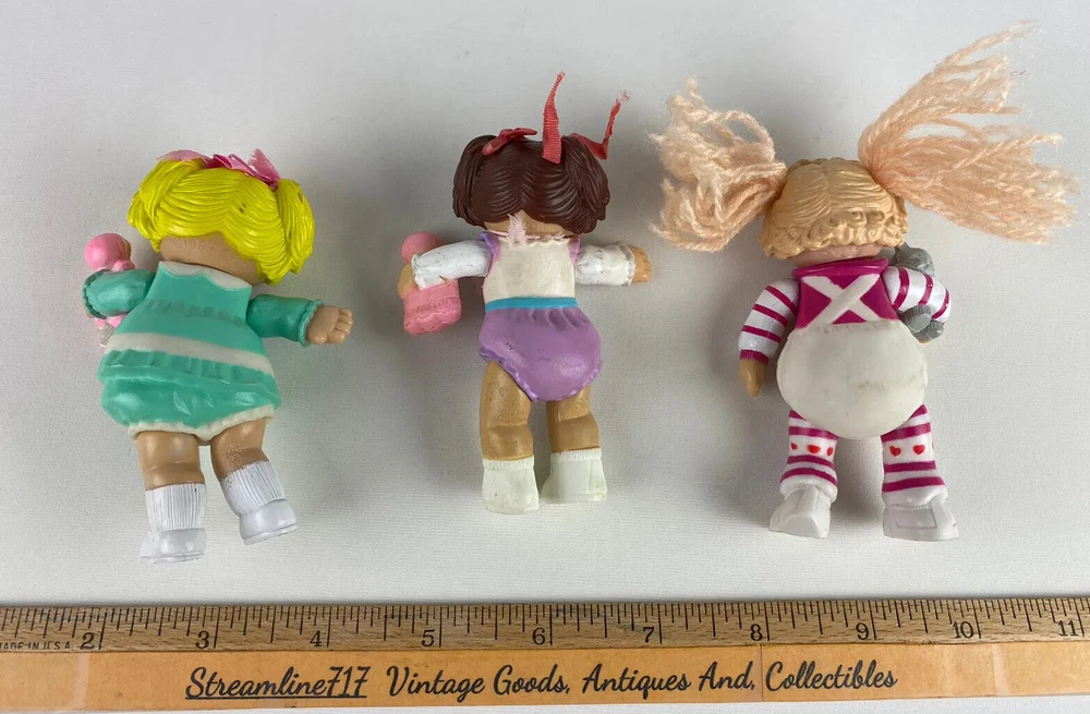 This lot includes 3 vintage Cabbage Patch Kids mini figures made of PVC material and with yarn hair. The set features girl dolls, each measuring 4 inches in size. These original 1984 figurines are a must-have for any collector who loves vintage items. All pieces are in excellent condition, ready to be displayed or played with. Perfect for completing any collection. These authentic dolls are recommended for ages 4 and up and were manufactured in China during the 1980s. Don't miss out on the opportunity to own these rare and unique figurines. Most of our items are second hand and have some shelf wear on them. We do not guarantee mint condition unless otherwise noted. A complete inventory has not been on this item and may be missing pieces or accessories. Please take time to look closely at all photos of items and specifics, as they are all part of the complete description. Most noticeable flaws we see will be pointed out with a pen. All items in the photos are of the actual product being shipped directly to you (minus display props and measuring devices) If an item is not in the photos, please do not expect it. If you have any questions or concerns, please reach out to us. Our feedback speaks for itself. We do all we can to keep you satisfied with your buying experience from Streamline717 If you enjoyed this item, please check out our ever growing inventory for more of “The Good Stuff” Be sure to add us to your favorites list!