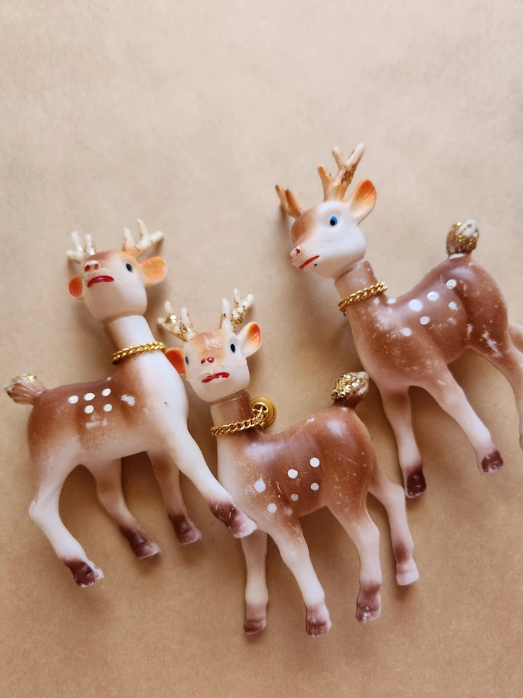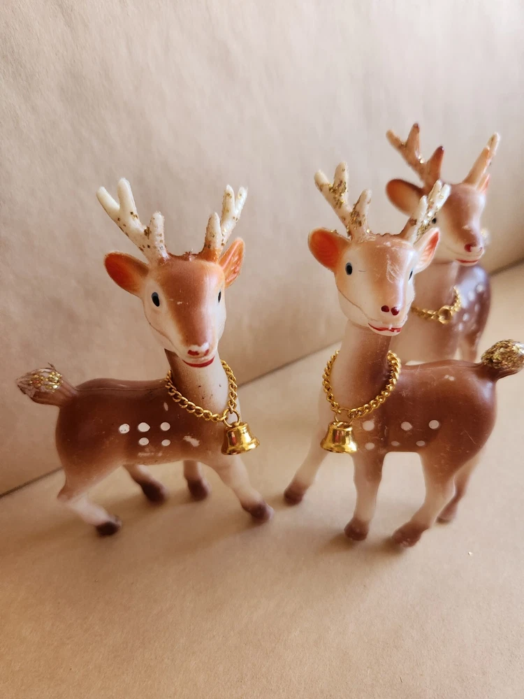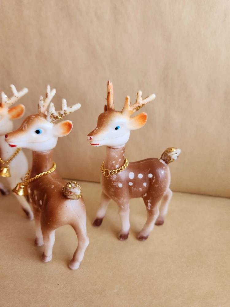 3 Vintage Soft Plastic Reindeer 5 inches tall Pre-Owned one of the reindeer missing a bell, some paint rubbed away here and there Please refer to photos for condition