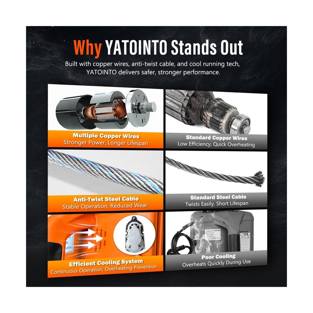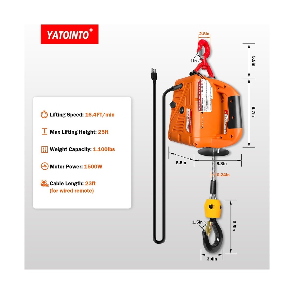 3 in 1 Electric Hoist Winch, 1500W Portable Electric Power Winch, 120V Electric Hoist Crane, 25ft Lifting Height, with Wire and Wireless Remote Control, Overload Protection for Towing Lifting Description Features: 3-in-1 High-end Configuration: Equipped with wireless remote control (AAA Batteries Included), wired remote, and direct manual operation, offering multiple control methods for added flexibility; avoid running the hoist without load on its first use for optimal safety. Enhanced Safety Features: Features a safety limit switch that automatically cuts power to prevent accidents; includes a reinforced crane mechanism and a 360-degree rotating forged alloy hook with a safety latch for superior load-bearing capacity and added safety; overload protection included. Industrial Grade Materials: Utilizes a high-efficiency pure copper motor with multiple copper windings for stable operation; galvanized anti-rotation wire rope offers durability and resistance to corrosion; aluminum shell gearbox enhances motor durability and damage resistance. Thoughtful Design Details: Waterproof remote control handle for durability and convenience; high-strength bearings extend the lifespan of the device; LED indicator provides a quick status check; dust cap design ensures stability of handle connections. Versatile Use: This electric winch is an ideal tool for lifting and towing tasks in gardens, forests, factories, warehouses, and construction sites; versatile installation options allow horizontal or vertical mounting in garages or ceilings for diverse space requirements. Product Details: Package Dimensions: 13.1 x 10.6 x 10.1 inches Item Weight: 24 pounds Manufacturer: YATOINTO Date First Available: March 1, 2022 Delivery We Do Not Ship Outside of the Continental US. Return Policy All items qualify for returns within 30 days of receipt. Seller is responsible for return shipping on any item that is not damaged. Feedback We take our reputation seriously, we buy and sell online, so we understand the value of trust. If you are unsatisfied with your order, please contact us and we will work with you to resolve it to your satisfaction.