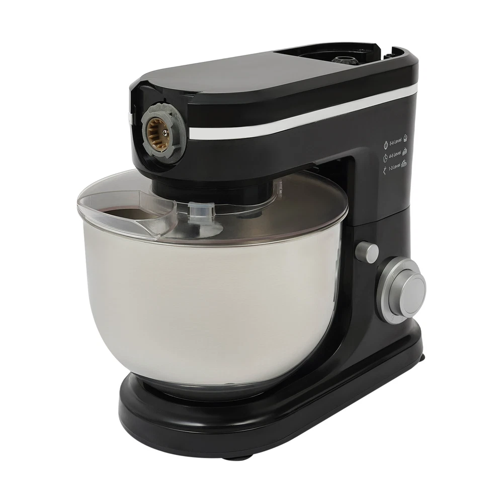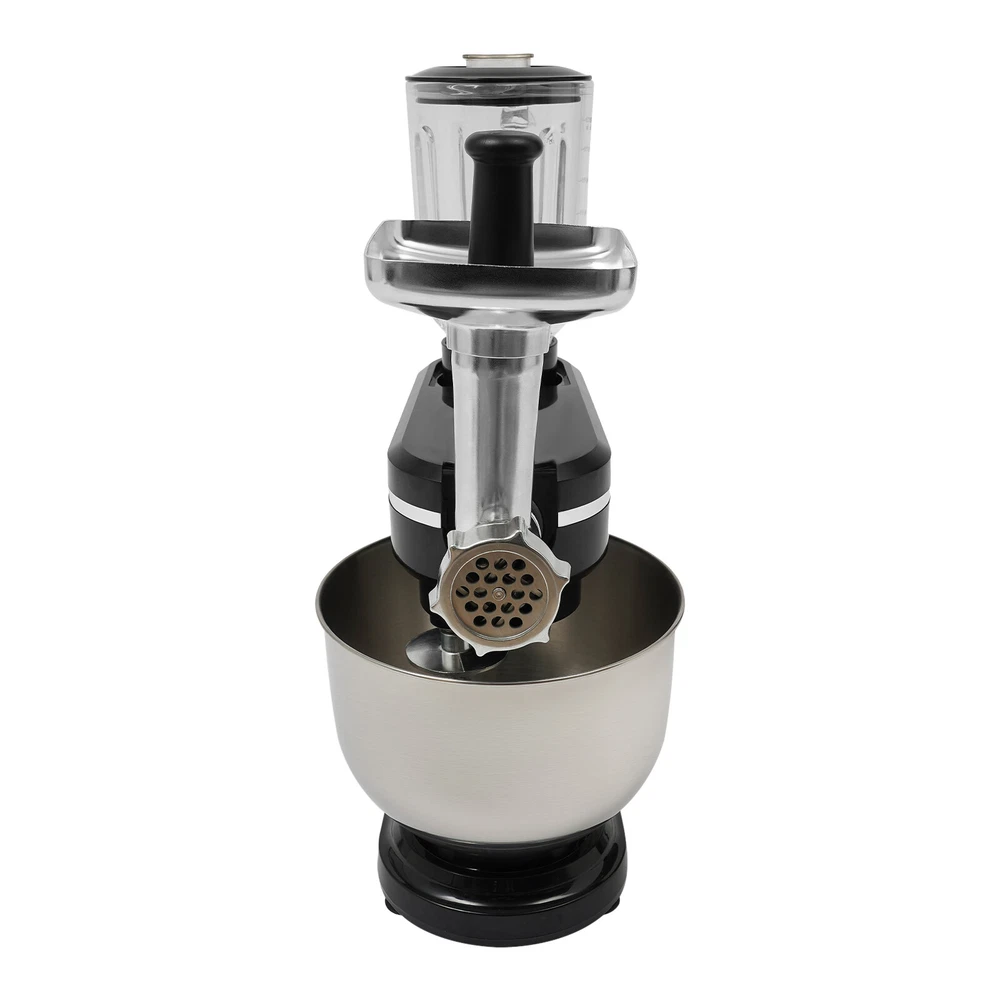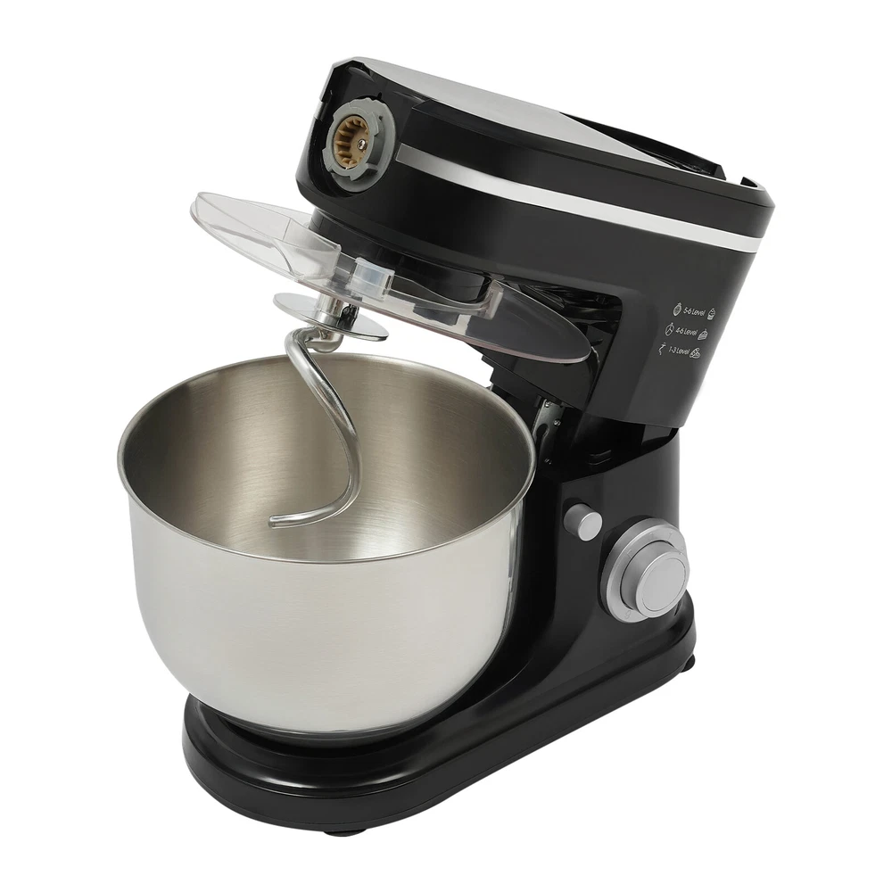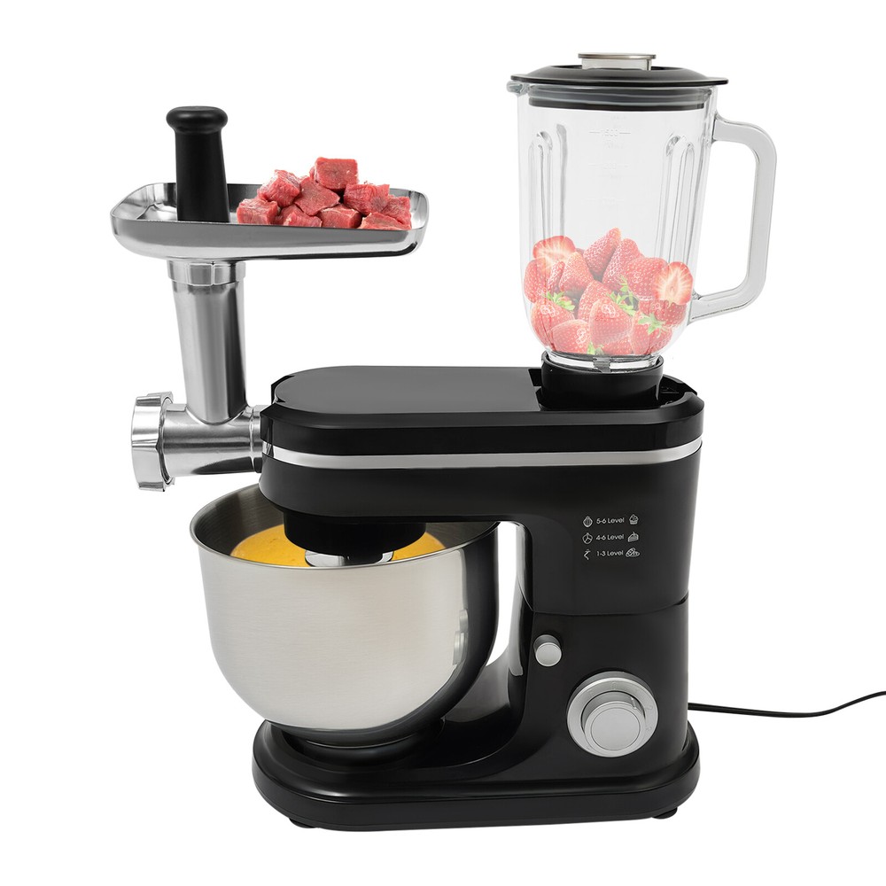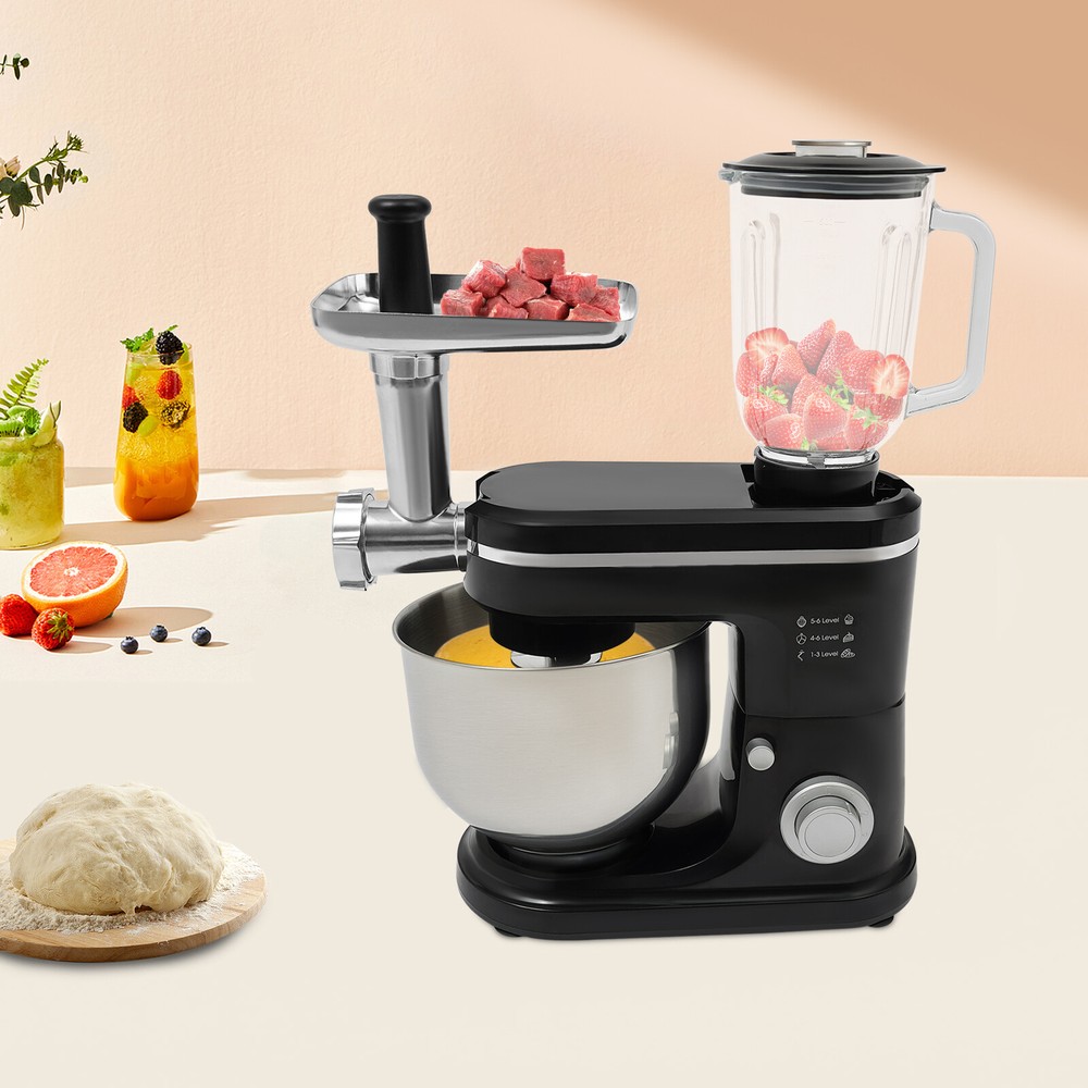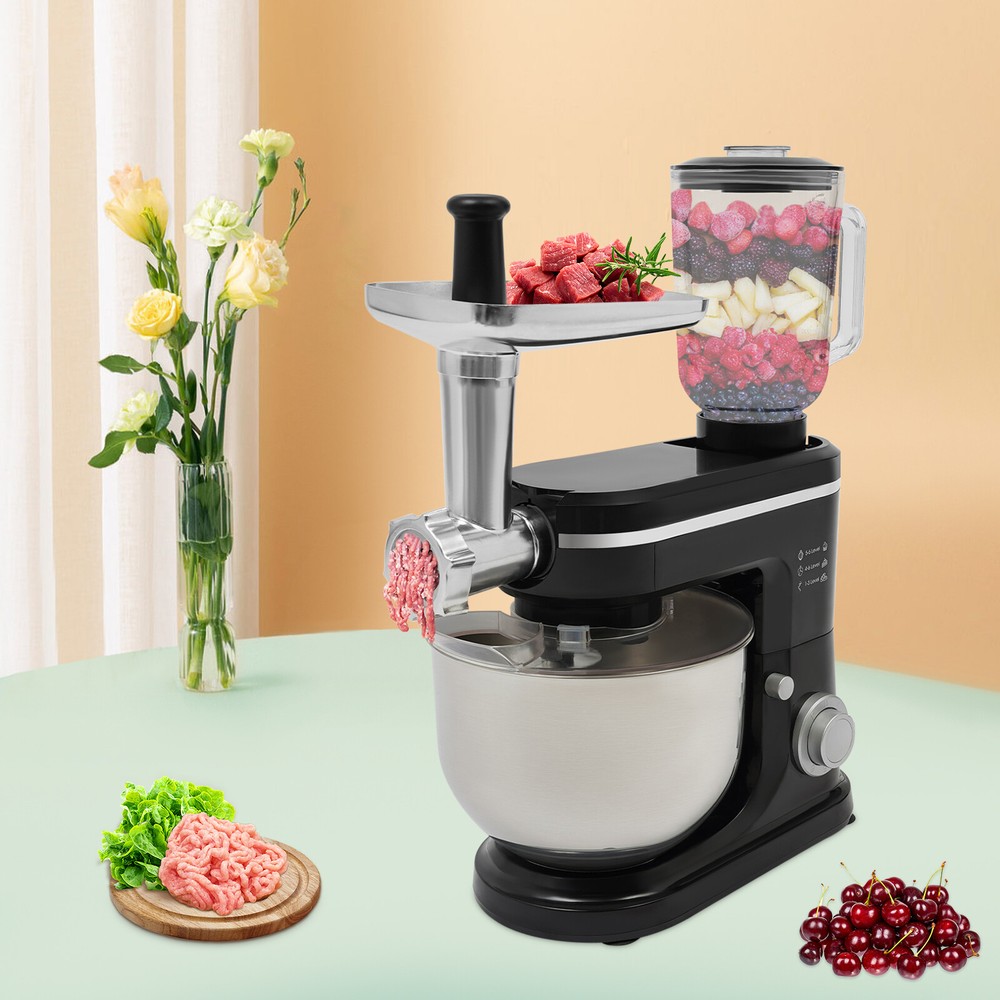 Application It can be used in kitchens, restaurants, bakeries, etc. for smoothies, pizza, waffles, milkshakes, bread, dough, whipped cream, marble cakes, mincemeat, juice and more! Specifications Style: Modern Color: Black, Silver Material: ABS, 304 Stainless Steel, Glass Mounting Type: Free Standing Assembly Required: Yes Control Type: Knob Power Source: Corded Electric Plug Type: US Standard Motor Type: 8830 Motor Volatge: 110-120V, 50/60Hz Power: 700W Speed Gears: 6+1(Pulse Function) Mixing Bowl Capacity: 6L/6.34qt Juice Container Capacity: 1.5L/1.58qt Noise: 90db Power Cord Length: 1m/3.28ft Gross Weight: 8.3kg/18.3lbs Net Weight: 7kg/15.43lbs Product Size: 35*18*54.75cm/13.78*7.09*21.56in Package Size: 61*36*27cm/24.02*14.17*10.63in 3 in 1 Kitchen Food Processor Stand Dough Mixer Multifunctional Mixer 700 W Application It can be used in kitchens, restaurants, bakeries, etc. for smoothies, pizza, waffles, milkshakes, bread, dough, whipped cream, marble cakes, mincemeat, juice and more! Specifications Style: Modern Color: Black, Silver Material: ABS, 304 Stainless Steel, Glass Mounting Type: Free Standing Assembly Required: Yes Control Type: Knob Power Source: Corded Electric Plug Type: US Standard Motor Type: 8830 Motor Volatge: 110-120V, 50/60Hz Power: 700W Speed Gears: 6+1(Pulse Function) Mixing Bowl Capacity: 6L/6.34qt Juice Container Capacity: 1.5L/1.58qt Noise: 90db Power Cord Length: 1m/3.28ft Gross Weight: 8.3kg/18.3lbs Net Weight: 7kg/15.43lbs Product Size: 35*18*54.75cm/13.78*7.09*21.56in Package Size: 61*36*27cm/24.02*14.17*10.63in Package Included 1* Kitchen Mixer 1* Douch Hook 1* Mixing Beater 1* Whisk 1* Juice Container 1*Anti-splash Guard 1*Mixing Bowl 1* English Manual Other Assembly Accessories Description Look at our kitchen mixer, it is a helpful assistant for your kitchen. It is made of premium materials, so it is safe to use and durable. This machine is compact and lightweight, so you can easily store it in the cabinet. As a daily mixer, it is easy to operate and clean up. The clear anti-splash guard could prevent the ingredients from making a mess. It comes with 6+1-speed options and three different mixing tools that can satisfy precise needs for various mixing tasks. Key Features Build to Last : The product is made of high-quality ABS, glass and 304 stainless steel, making it durable, and not easy to rust and corrosion, so it can remain beautiful and practical for a long time. Powerful Function: It has a strong power (700W) as well as a knob that allows you to adjust 6 mixing speeds, allowing you to finish kneading and mixing more quickly and thoroughly than human hands, and the pulse function can deliver short bursts of power at the optimal speed to blend mixtures evenly. Thoughtful Design: A deepened mixing bowl(6.34qt) can thoroughly mix flour, eggs, and other ingredients inside. The enhanced gear and enclosed transmission can provide powerful power to the machine and achieve the noise reduction function, ensuring smooth operation. High Safety: The Hall sensor of the machine has a motor overheating automatic power off thermal protection function that can ensure your safety as well as easy for you to replace the accessories when using, in addition, the cooling holes can dissipate the heat in time to ensure the stability of the product when using. Multi-function Machine: Its mixing bowl can hold enough ingredients and is equipped with a whisk, beater, and dough hook to facilitate the mixing of different ingredients and meet the dietary needs of you and your family. The meat grinder provides freshly ground meat when required, and the provided meat pusher offers you a safe and convenient use experience. 1.58qt glass juice container allows the sharing of more vegetable juice, fruit juice, or milkshakes, creating delightful beverages for family and friends. Ready to Use: Complete accessories and a detailed English manual make it very convenient and time-saving for you to use it directly after receiving it. Compact and Lightweight: With its compact size (13.78*7.09*21.56 inches) and lightweight (15.43 lbs), you can use it conveniently or store it in your cabinet without taking up too much space, making it suitable for small kitchen, apartment, or limited storage space. Ideal Gift: Because of its powerful functions and practicality, you can give it to your friends as a Christmas, Thanksgiving, or housewarming gift. Quality Service: We are honored that you have chosen our product. We have sufficient confidence in the quality of the product so that you can buy it confidently. But if you have any questions, you can contact our customer service, he will patiently answer and solve your problems. Details 6 Suction Pads: They provide a non-slip effect to ensure product stability. Locking Groove: It helps secure the mixing bowl more accurately. Heads-up Button: It allows the attachment of the agitator section to be lifted upwards, making it easy for you to remove or replace the agitator. Splash-proof Cover: The clear anti-splash guard helps you with process monitoring and facilitates pouring water, milk, or other liquid ingredients(not included) through the small holes in the splash guard when needed while preventing ingredients from running out of the bowl, making cleanup easier. Handle: The handle on the juicer makes it easy to grip and pour your juice (not included). Notes Please note that the mixing elements are not dishwasher safe! Please note that this product does not include any food ingredients. Before purchasing, please make sure that the capacity of this product is available for your needs. It is suitable for the new baker, 1-2 members, or small family in everyday use. If you are a pro-baker or need to handle large batches of mixing, please consider other larger-capacity mixers. Please read the English manual carefully before use and pay particular attention to the safety instructions contained therein. Please allow the slight color difference caused by the shooti